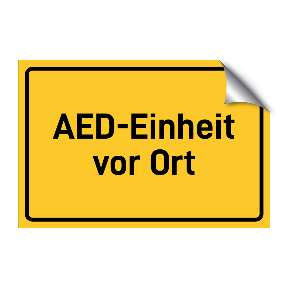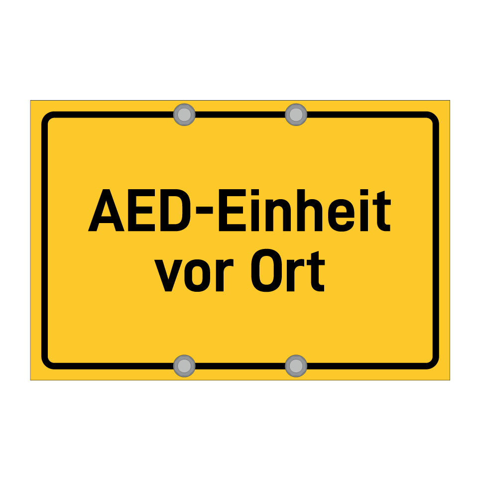 Hinweisschild mit dem Text AED-Einheit vor Ort