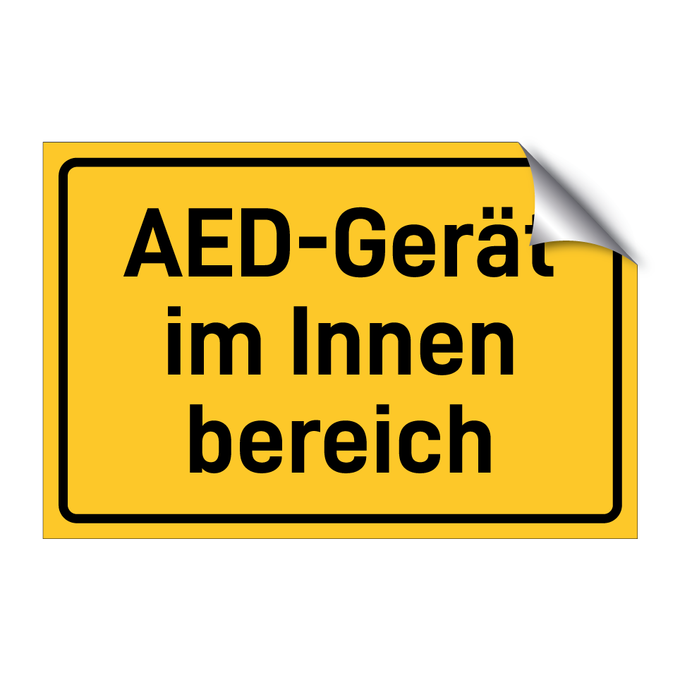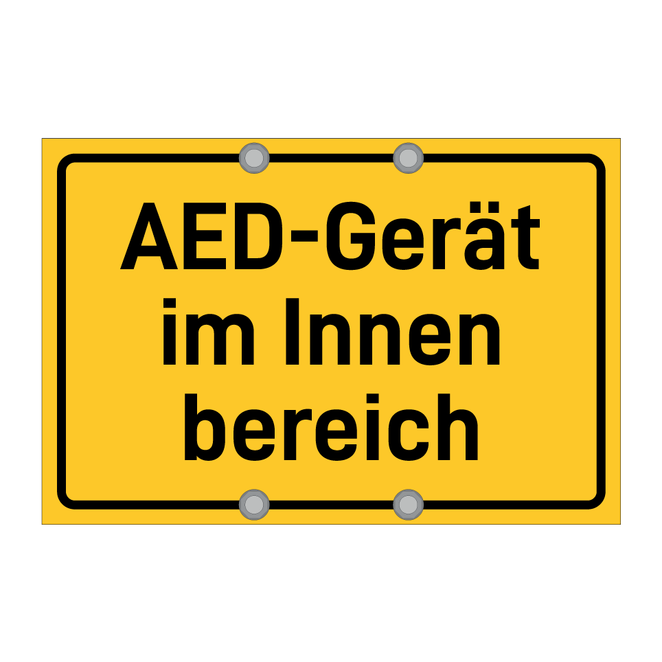 Hinweisschild mit dem Text AED-Gerät im Innen bereich