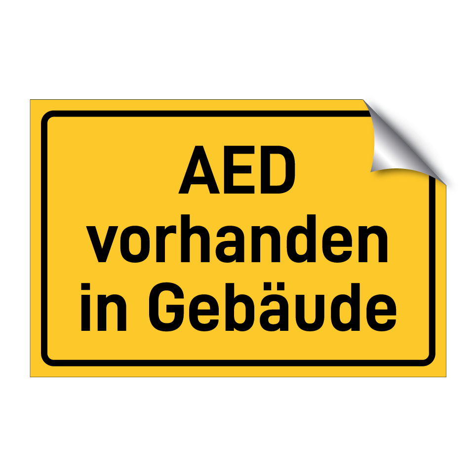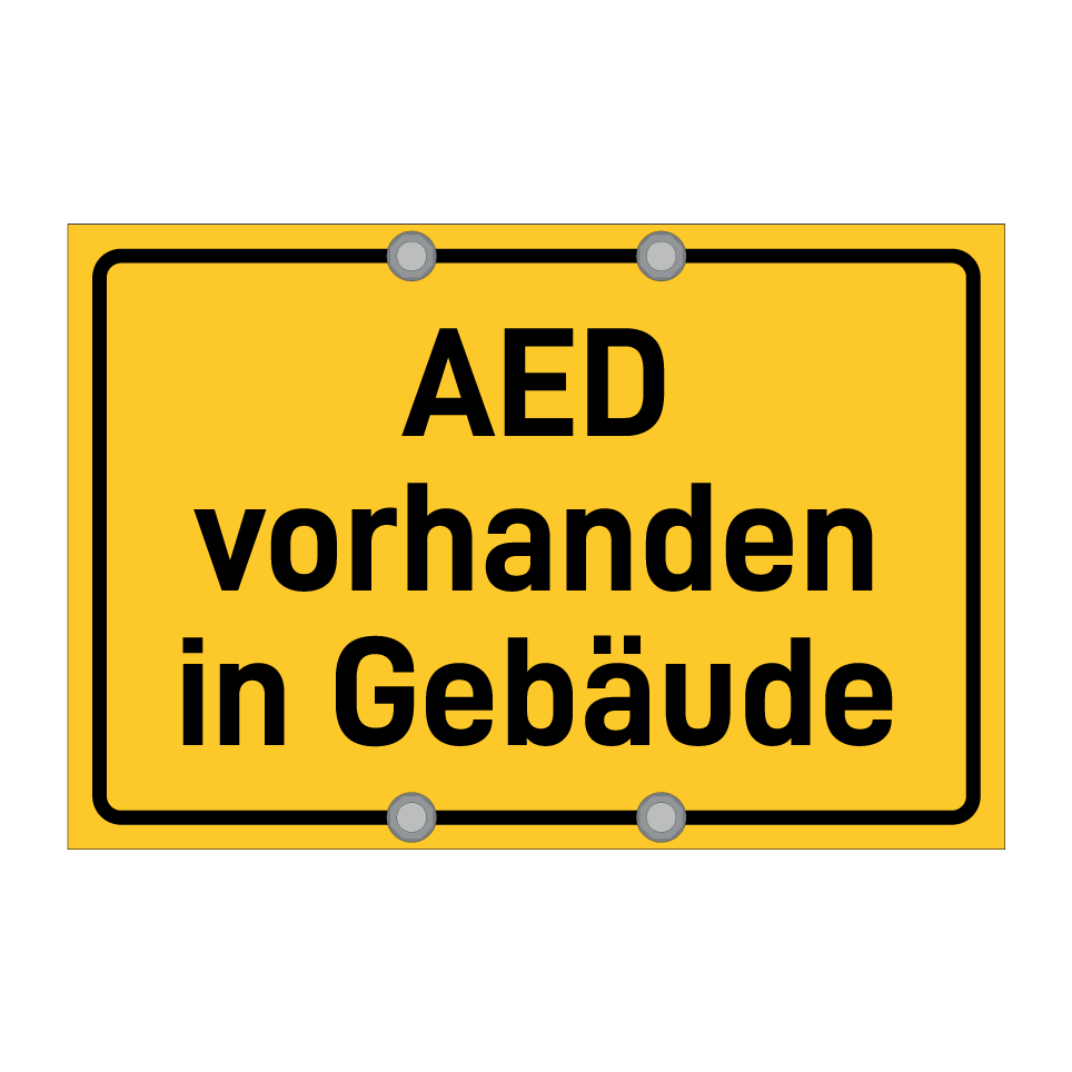 Hinweisschild mit dem Text AED vorhanden in Gebäude