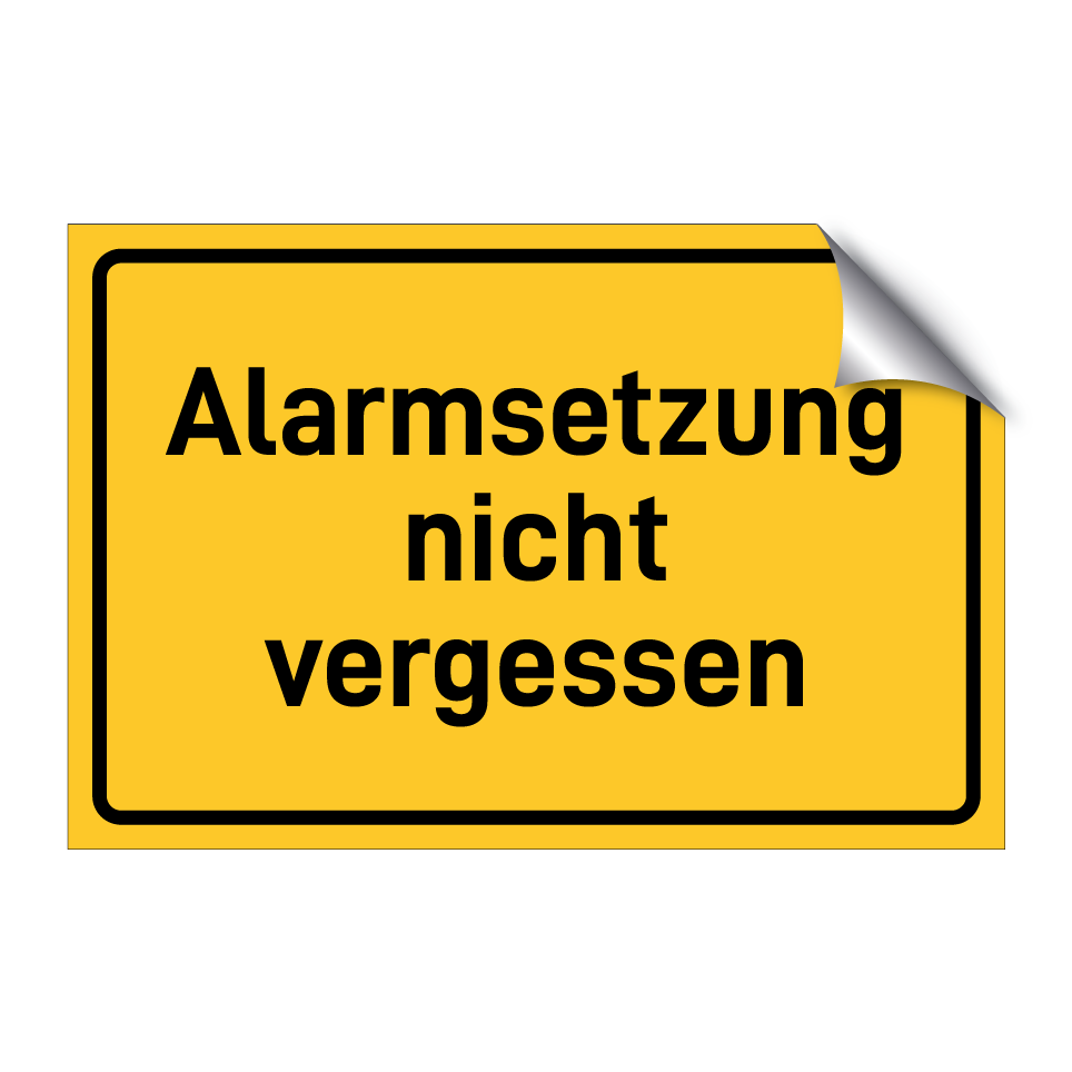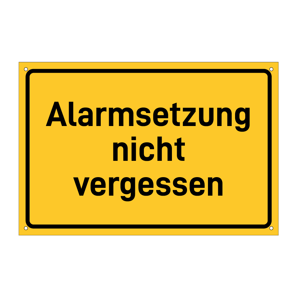 Hinweisschild mit dem Text Alarmsetzung nicht vergessen