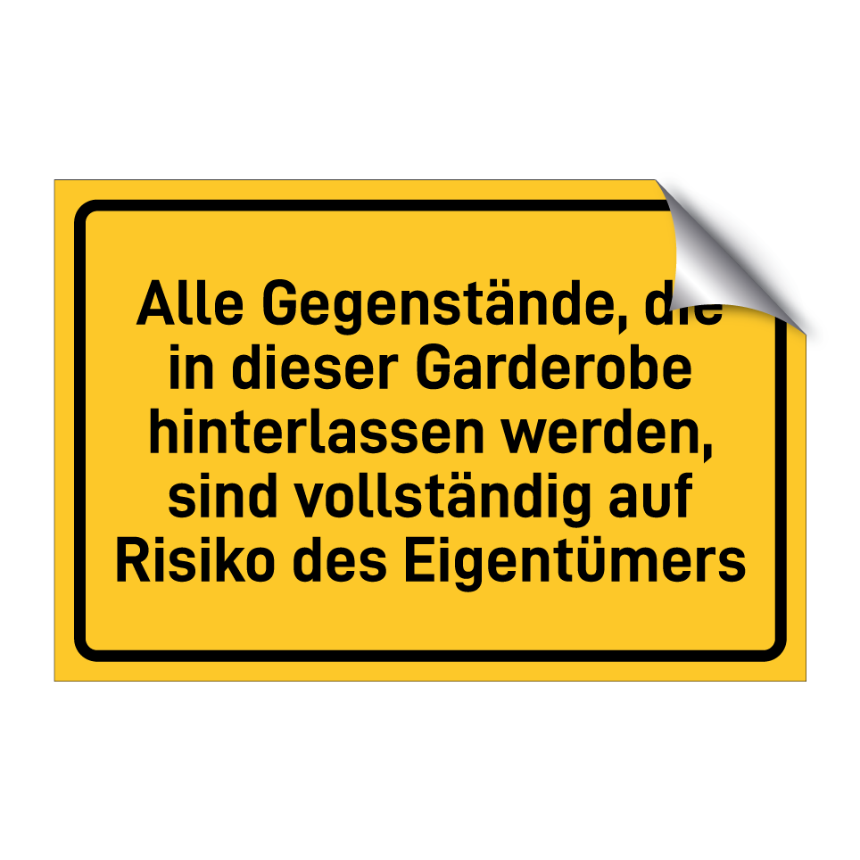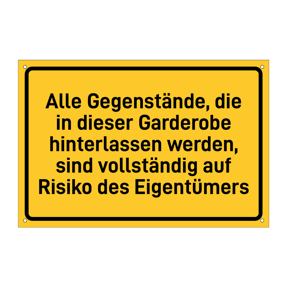 Hinweisschild mit dem Text Alle Gegenstände, die in dieser Garderobe hinterlassen werden, sind vollständig auf Risiko des Eigentümers
