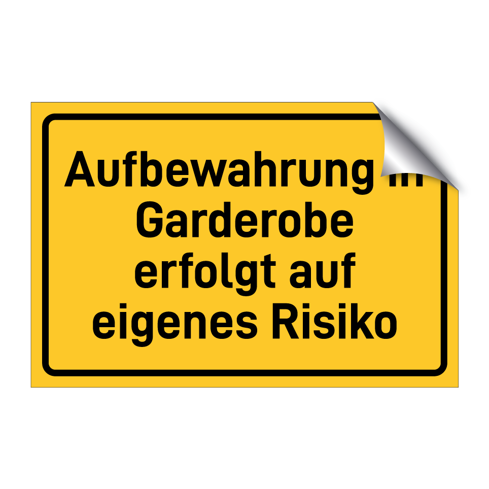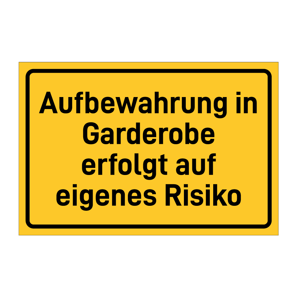 Hinweisschild mit dem Text Aufbewahrung in Garderobe erfolgt auf eigenes Risiko