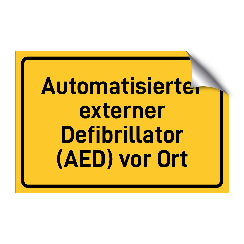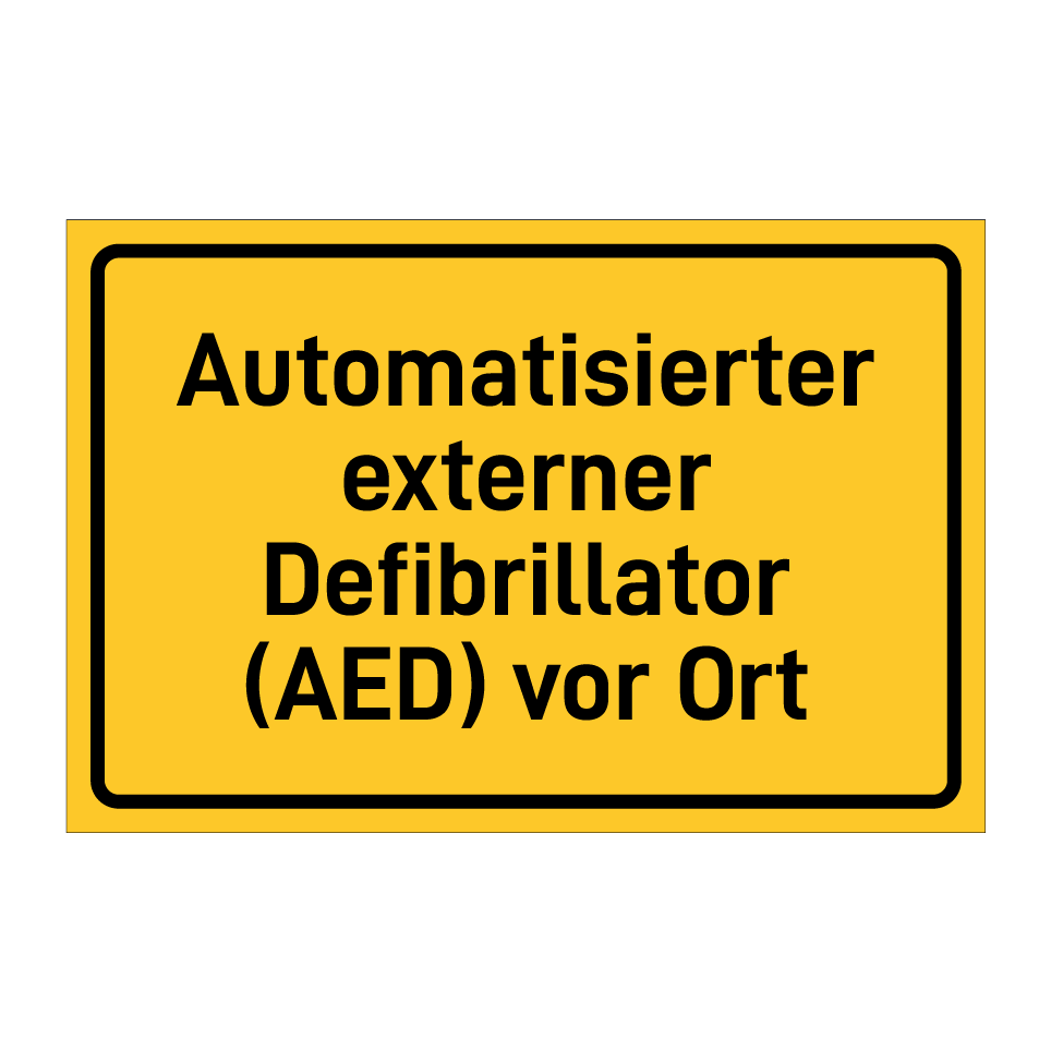 Hinweisschild mit dem Text Automatisierter externer Defibrillator (AED) vor Ort