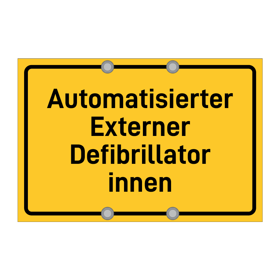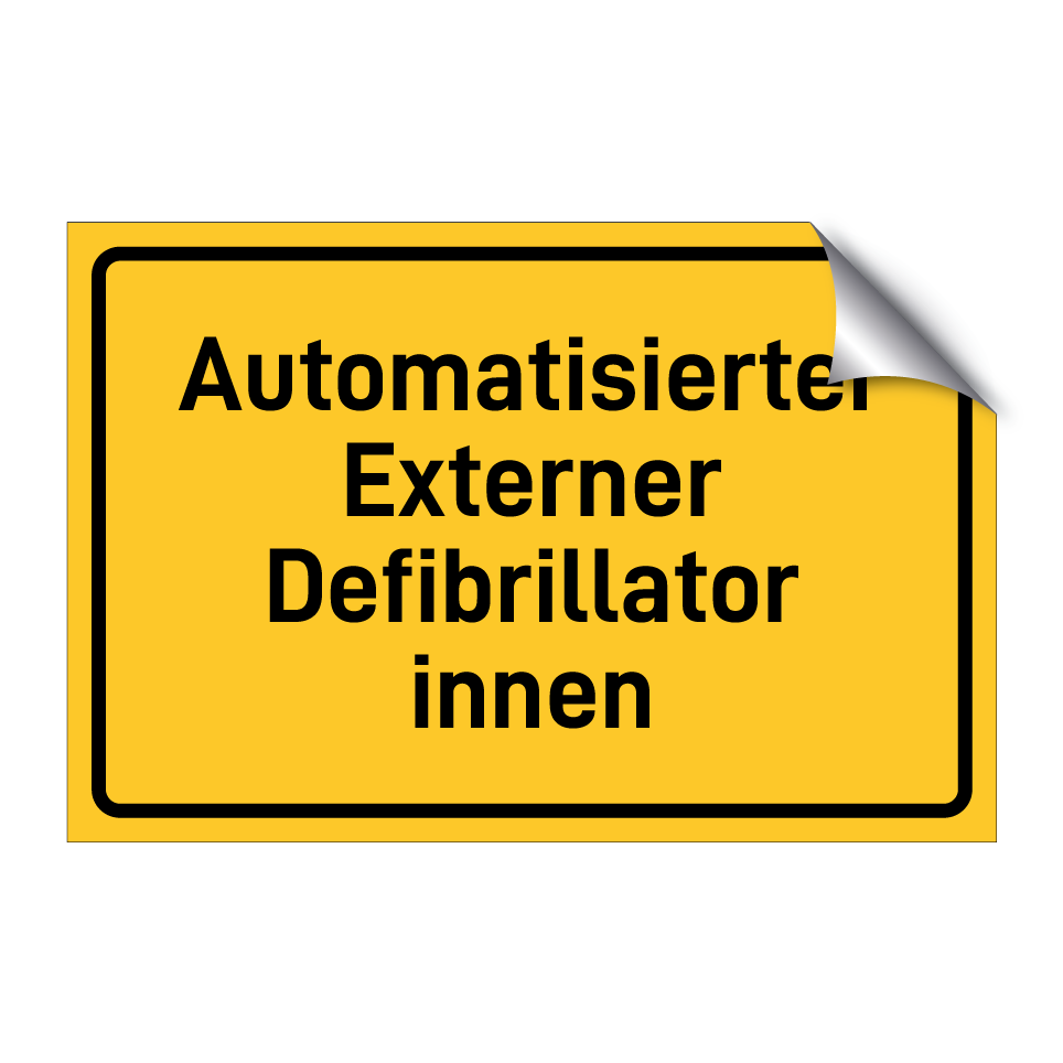 Hinweisschild mit dem Text Automatisierter Externer Defibrillator innen