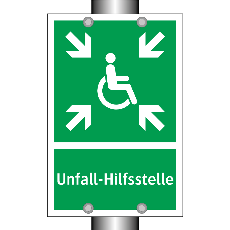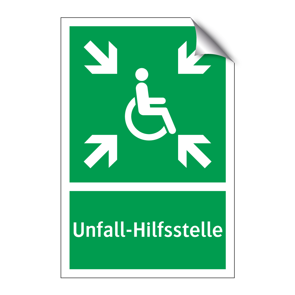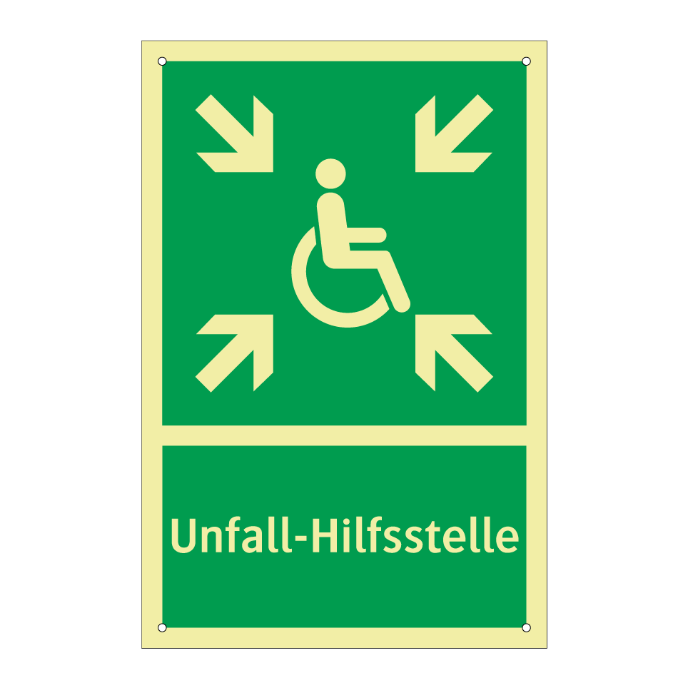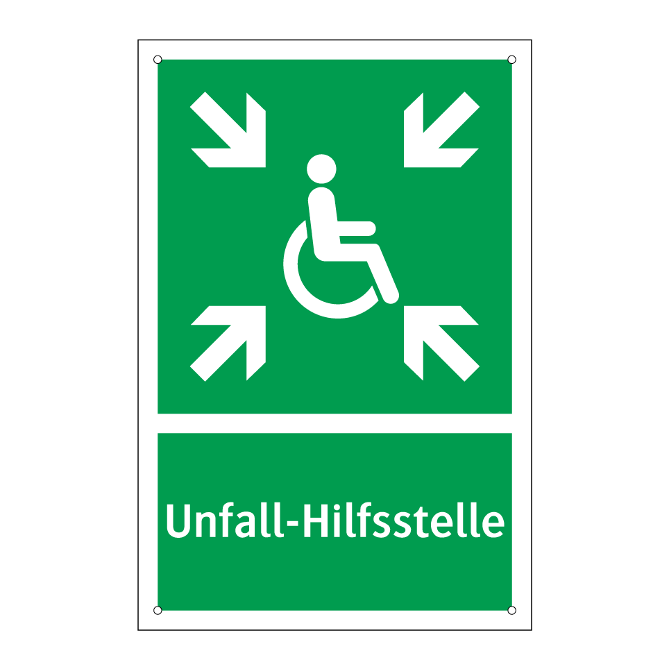 Rettungsschild mit dem Text Unfall-Hilfsstelle