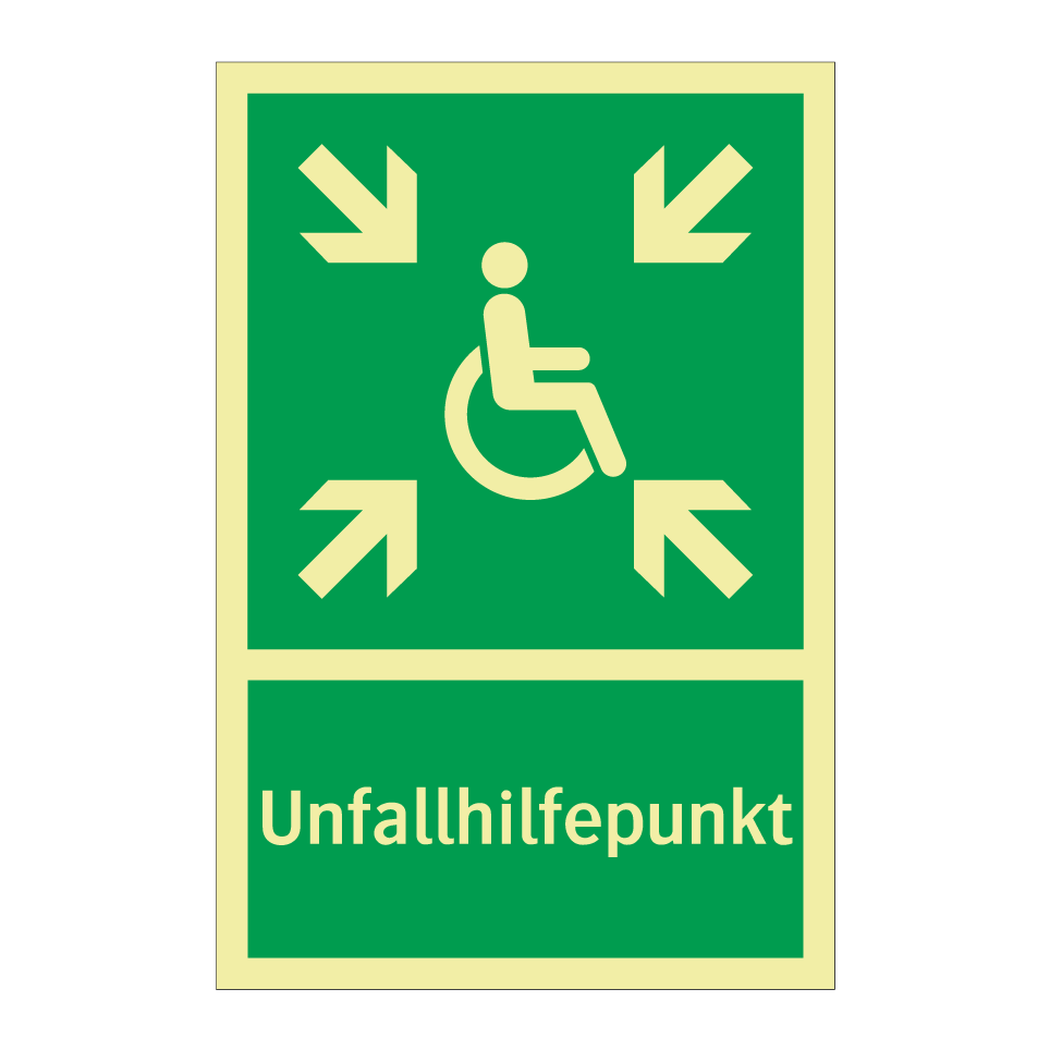 Rettungsschild mit dem Text Unfallhilfepunkt