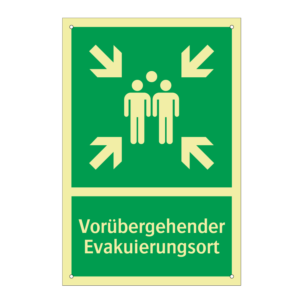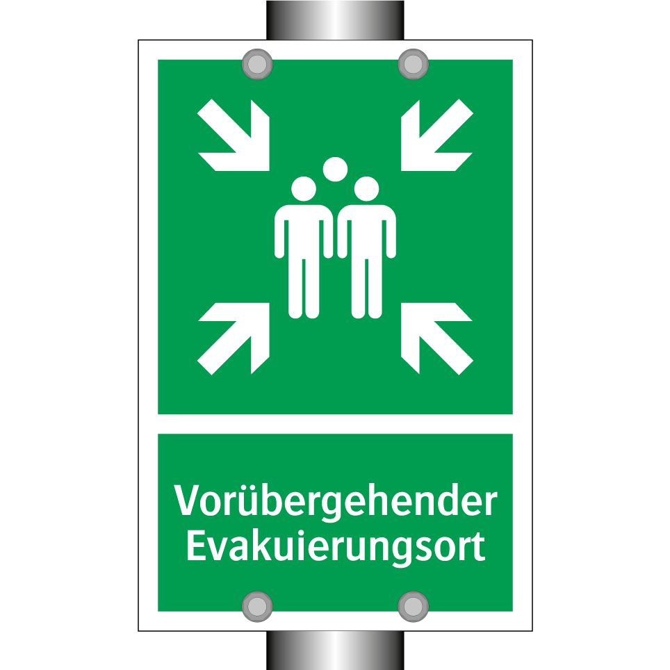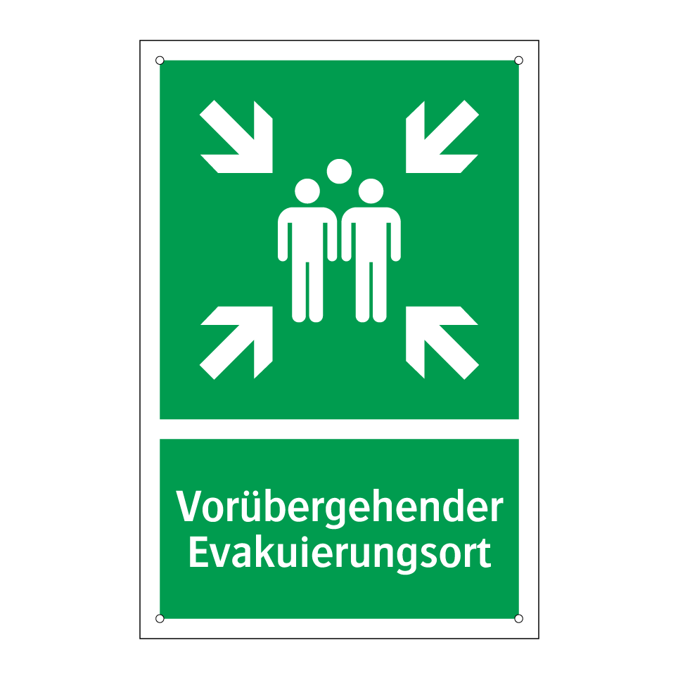 Rettungsschild mit dem Text Vorübergehender Evakuierungsort