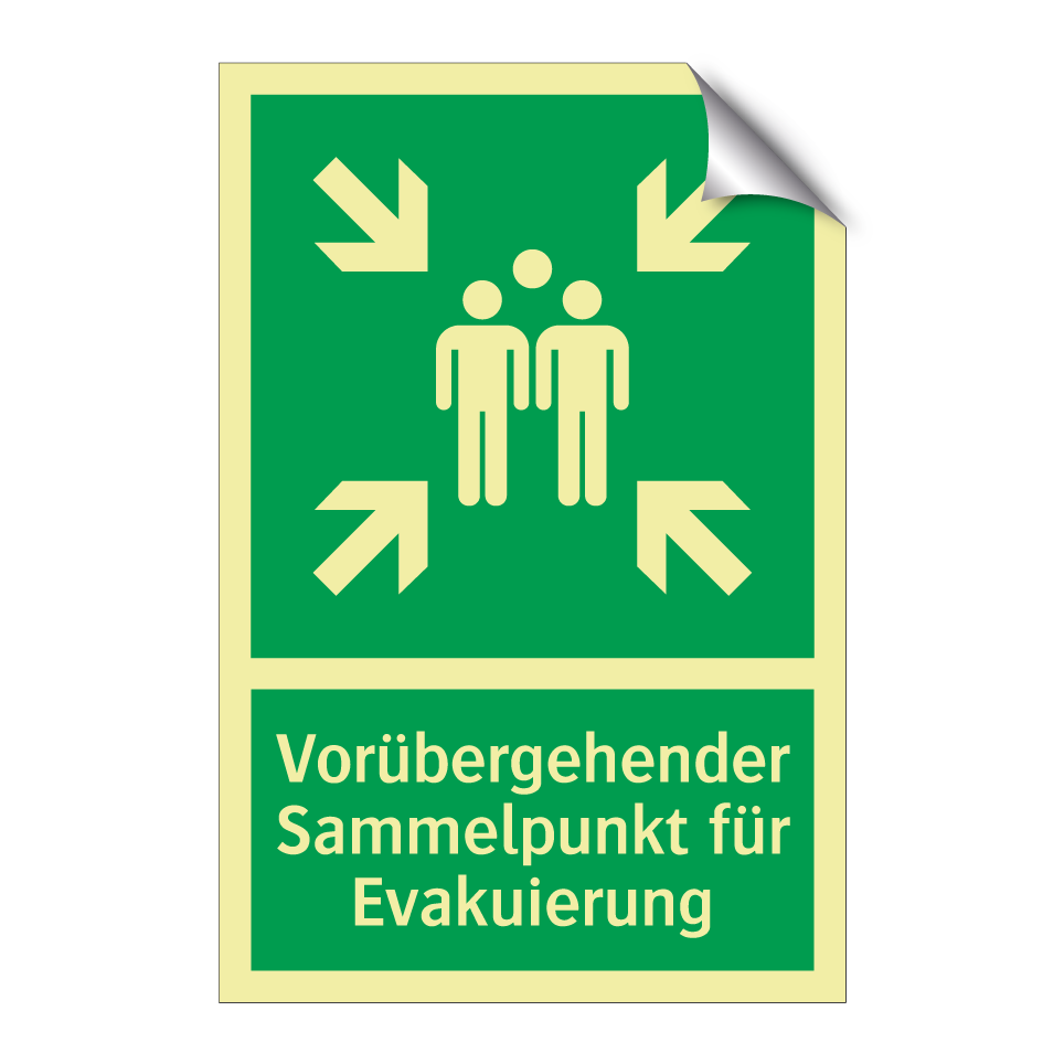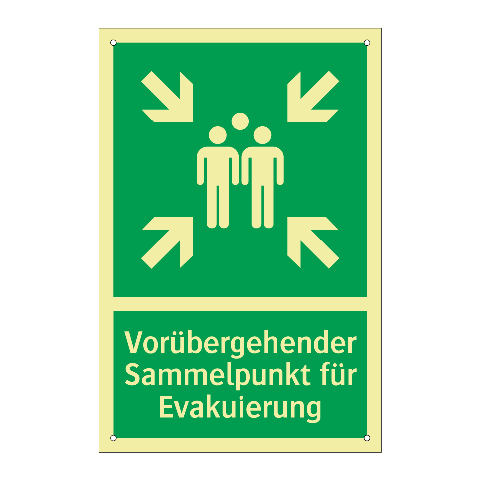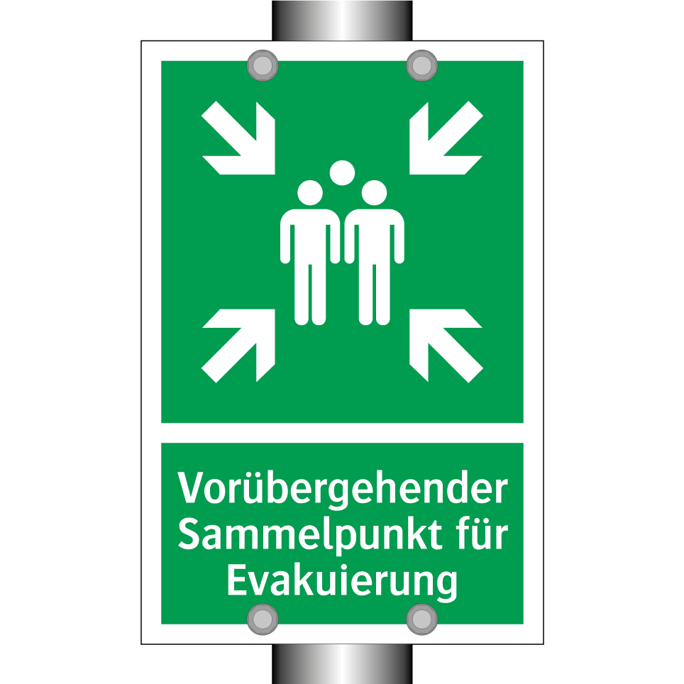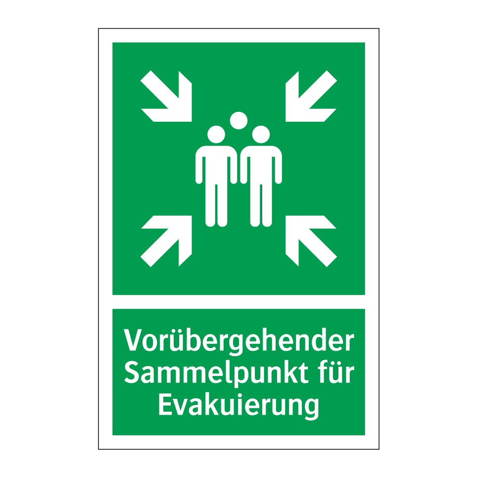 Rettungsschild mit dem Text Vorübergehender Sammelpunkt für Evakuierung