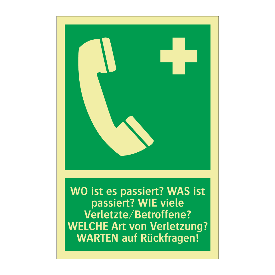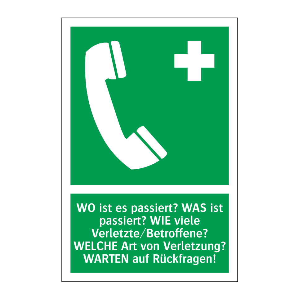 Rettungsschild mit dem Text WO ist es passiert? WAS ist passiert? WIE viele Verletzte/Betroffene? WELCHE Art von Verletzung? WARTEN auf Rückfragen!