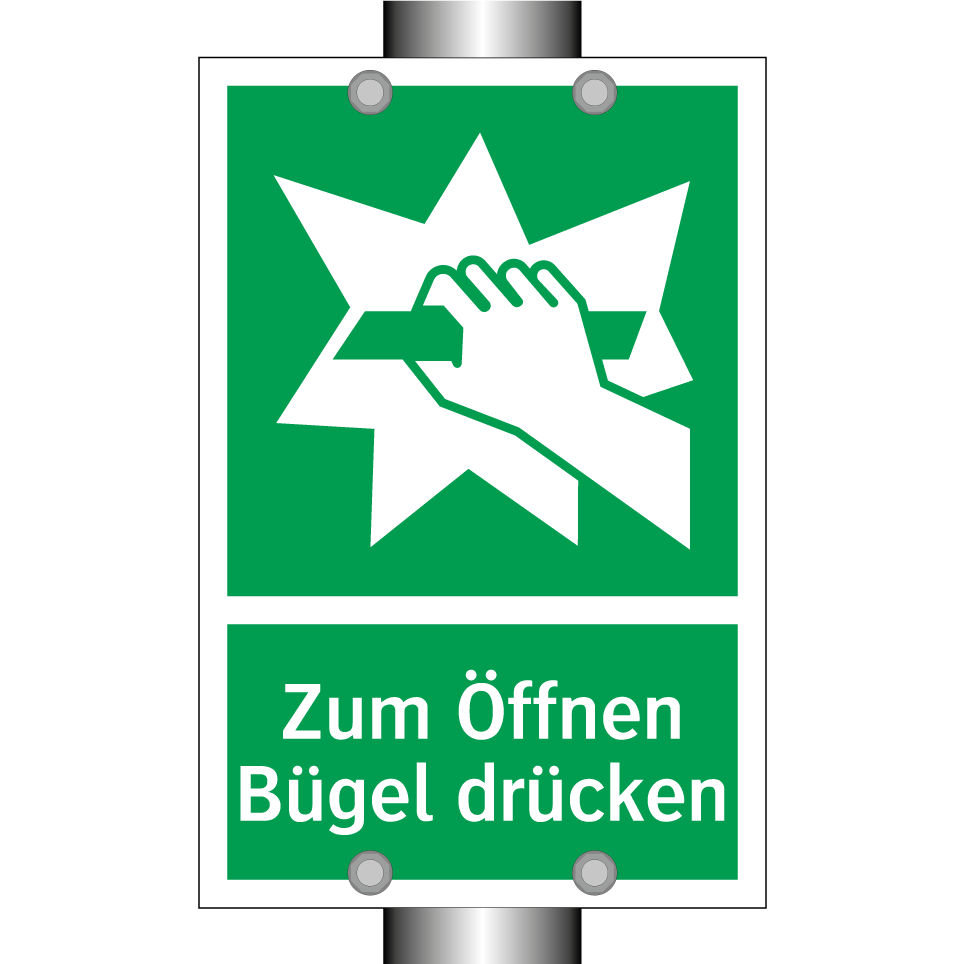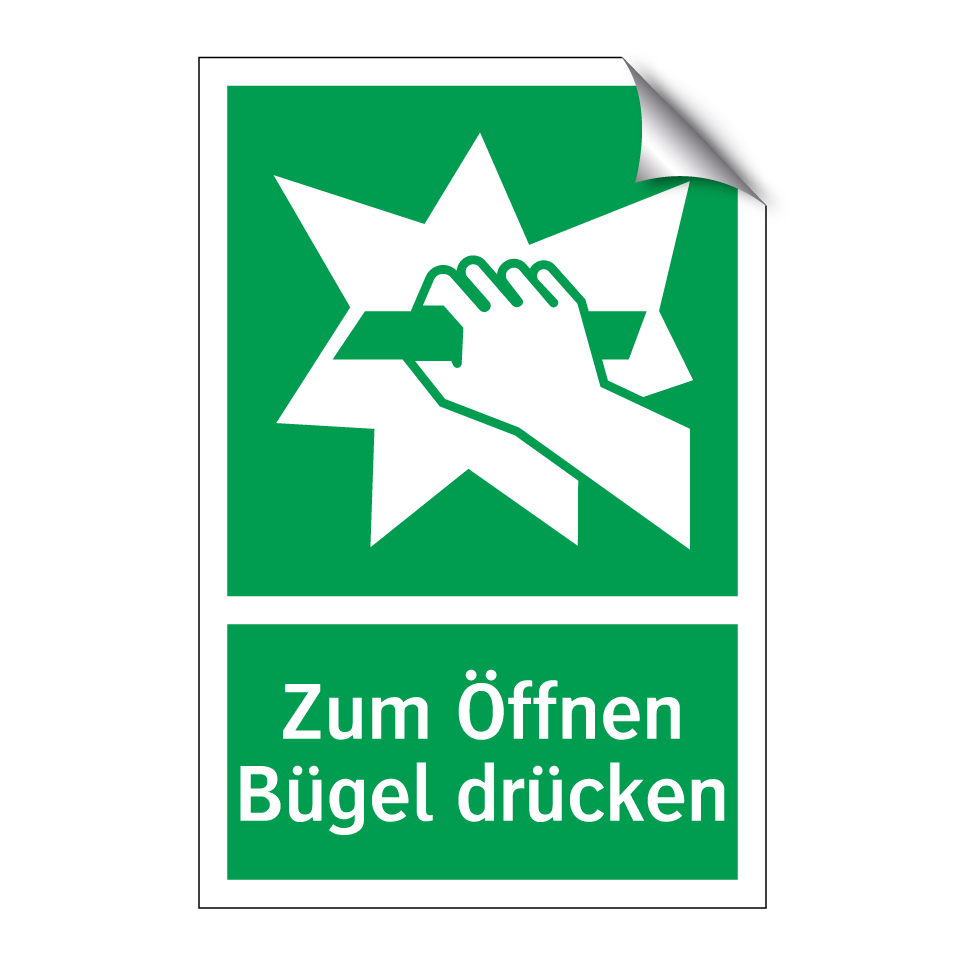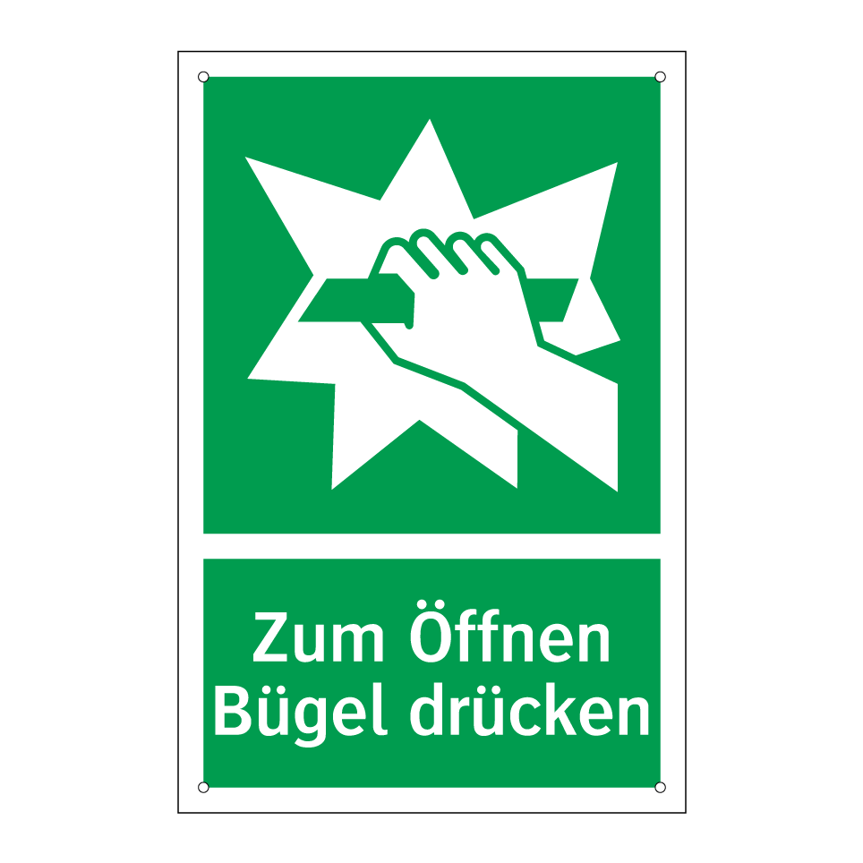 Rettungsschild mit dem Text Zum Öffnen Bügel drücken