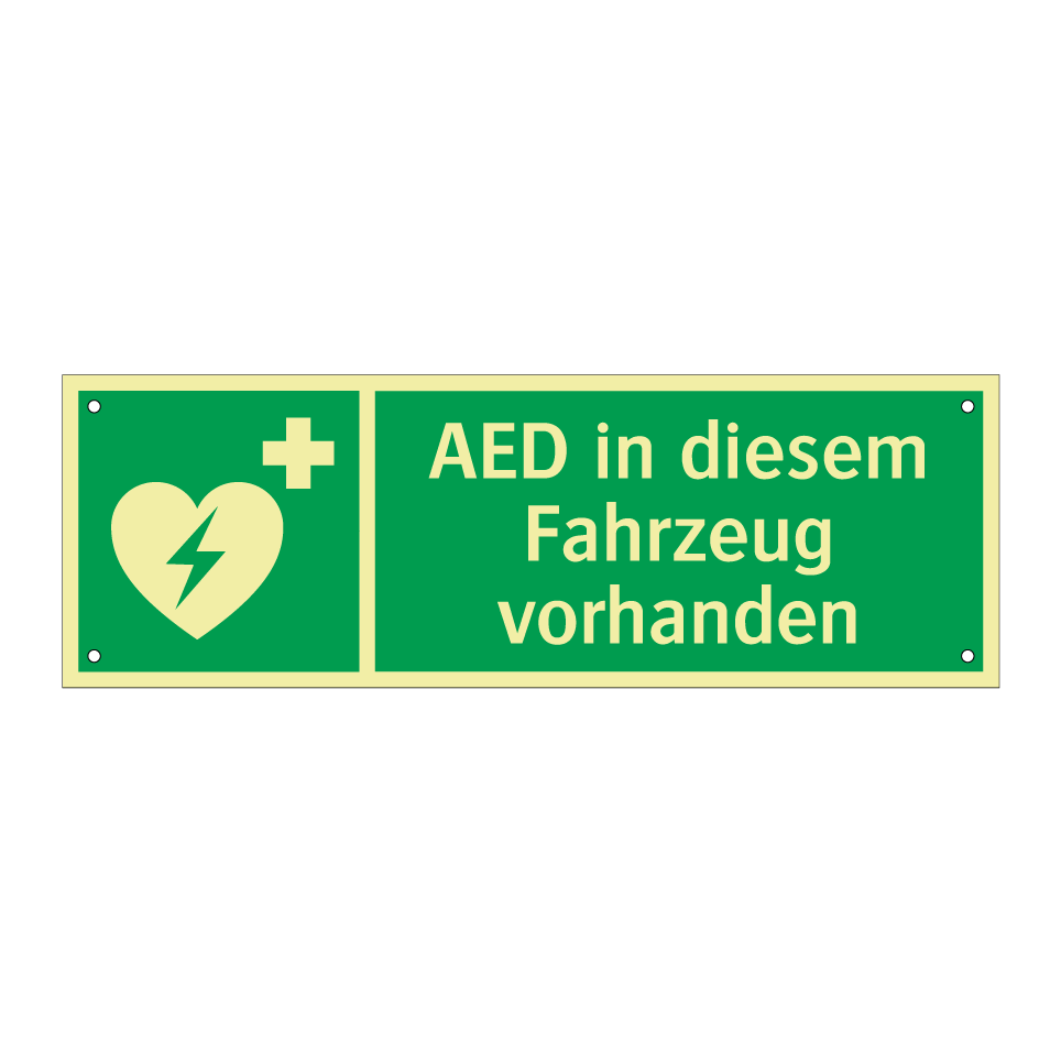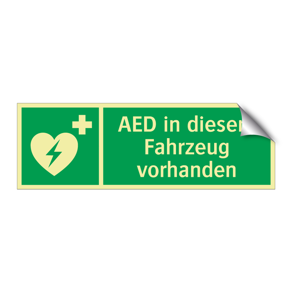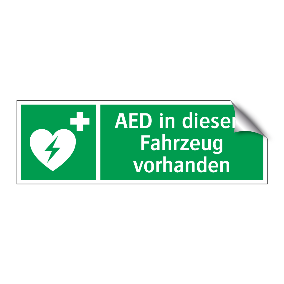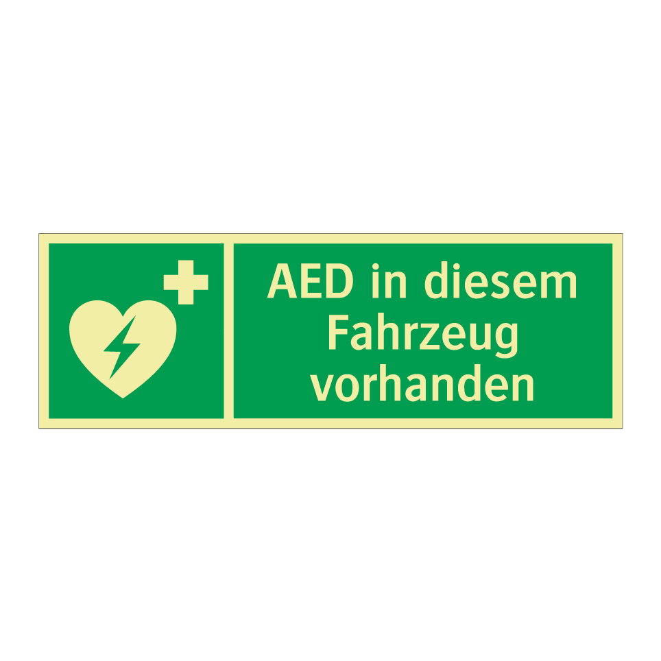 Rettungsschild mit dem Text AED in diesem Fahrzeug vorhanden