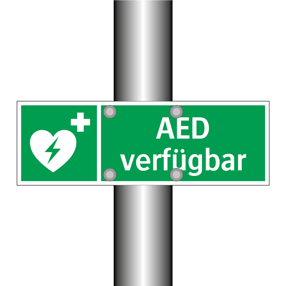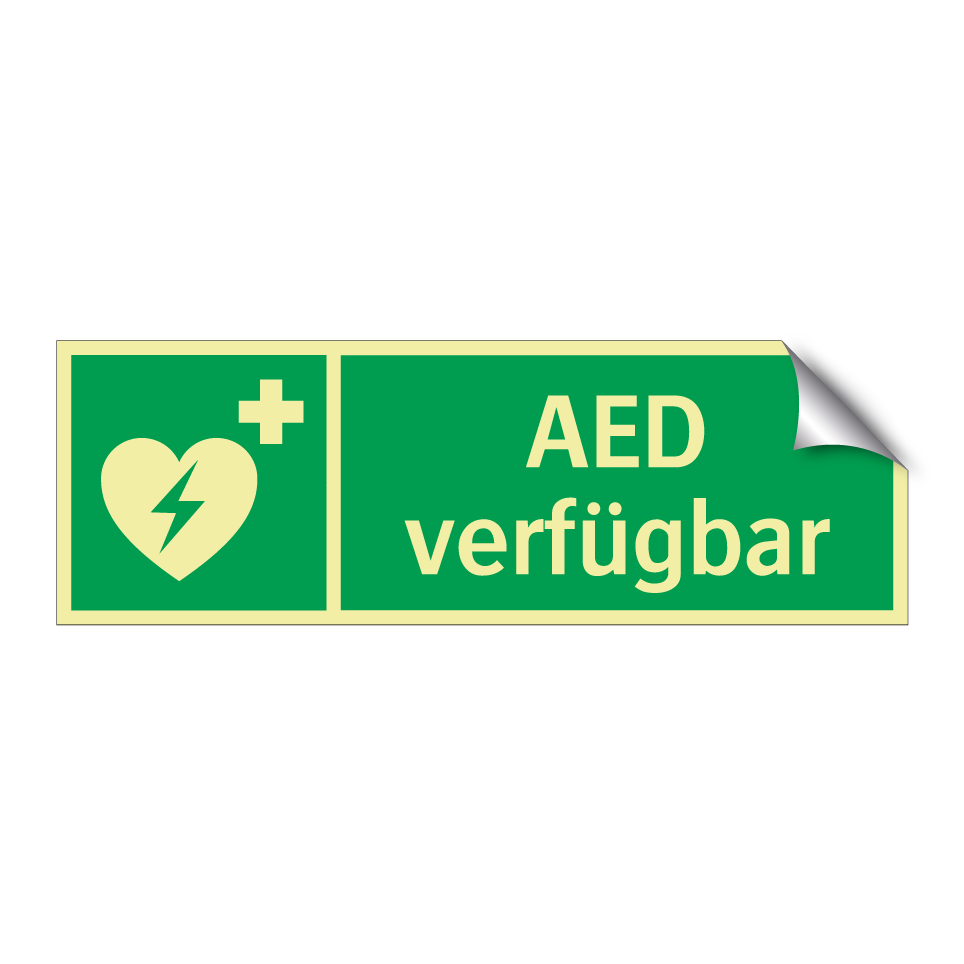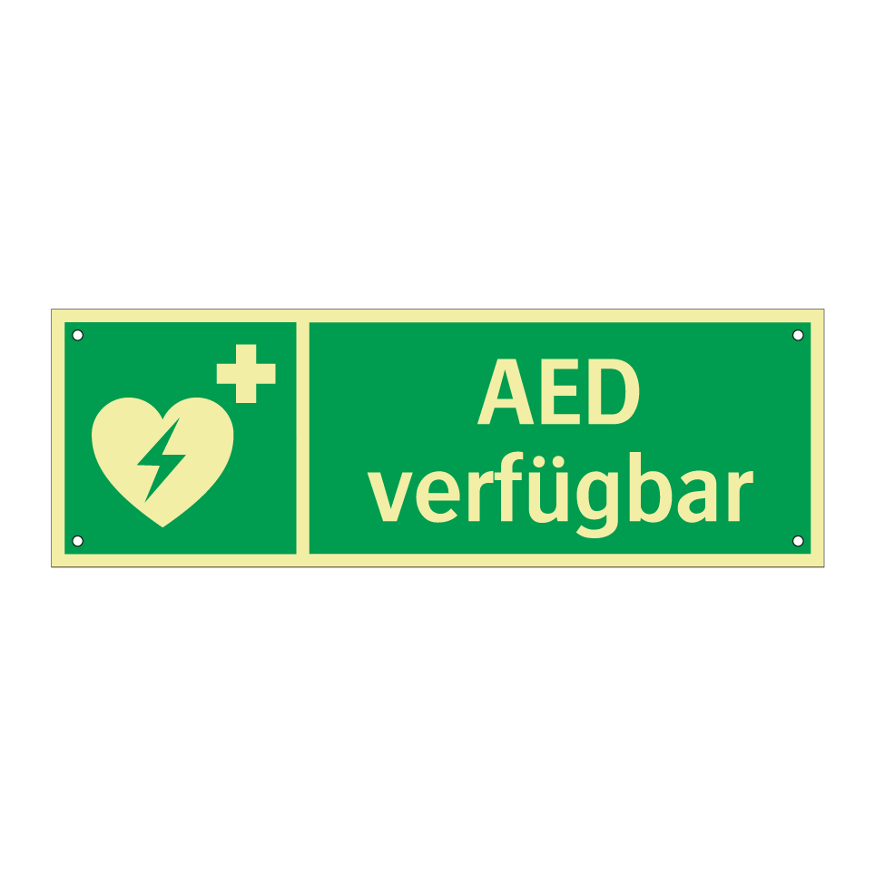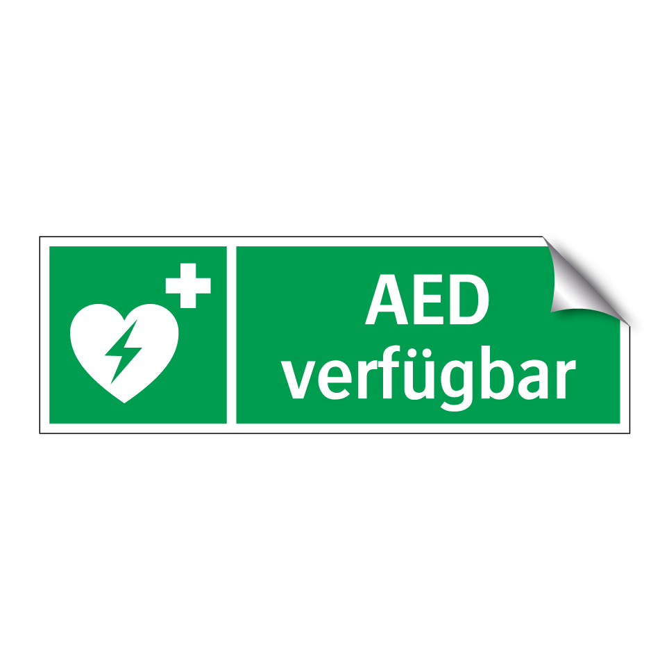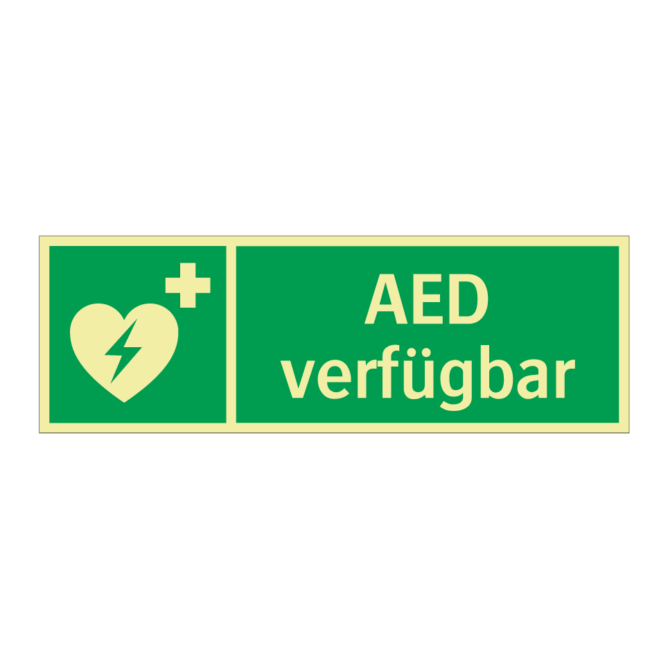 Rettungsschild mit dem Text AED verfügbar