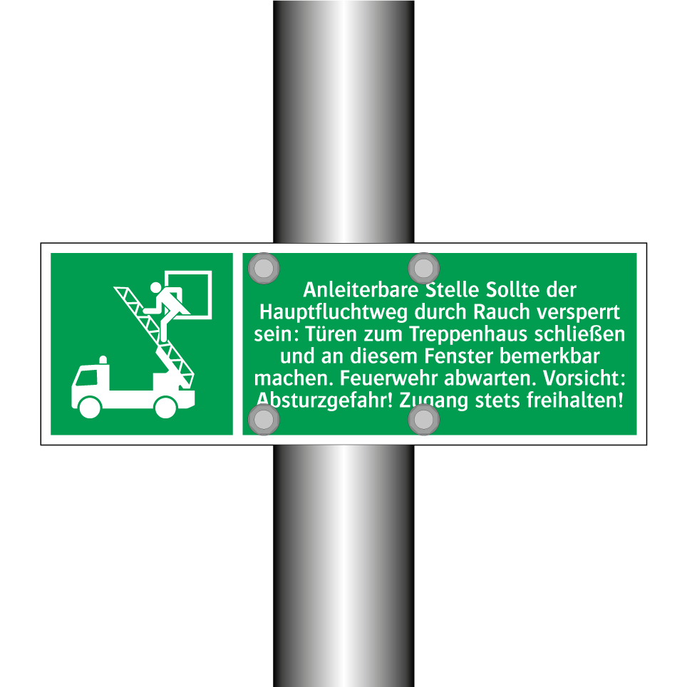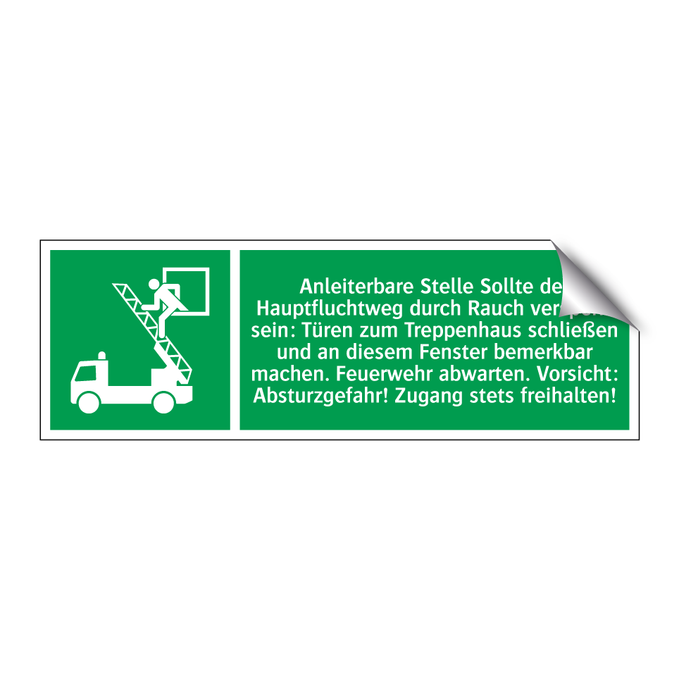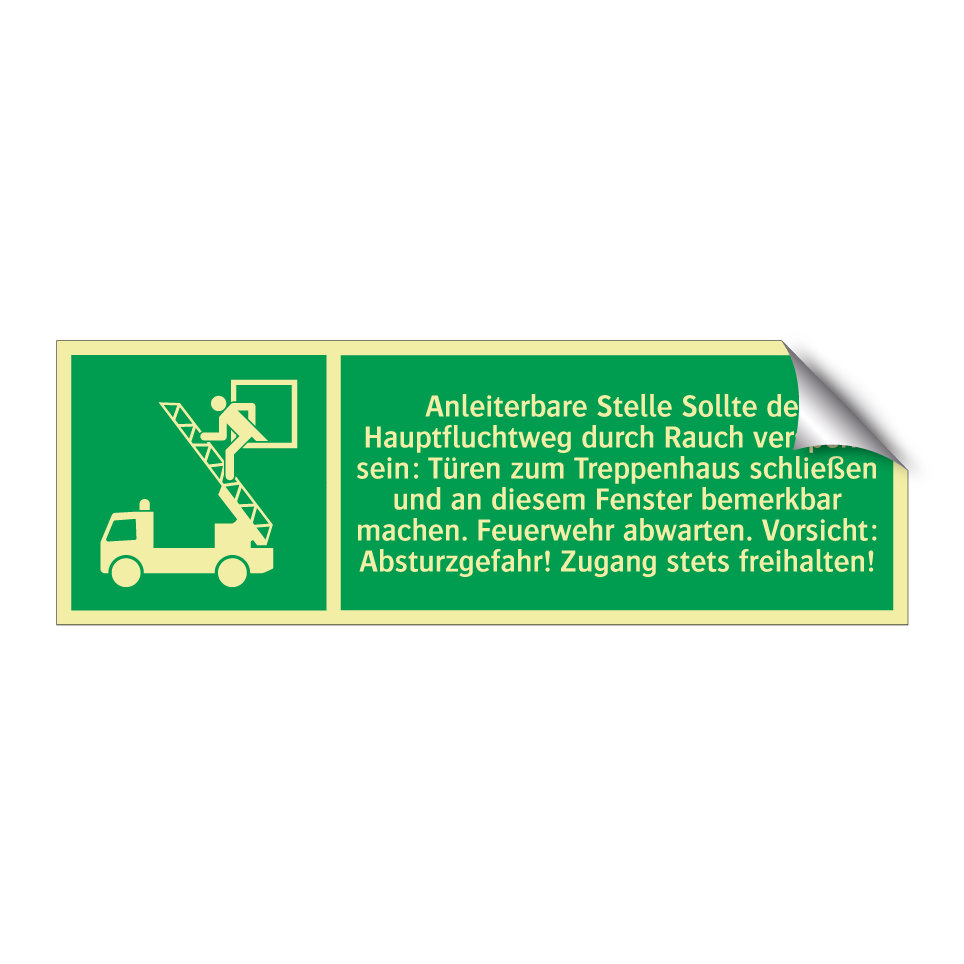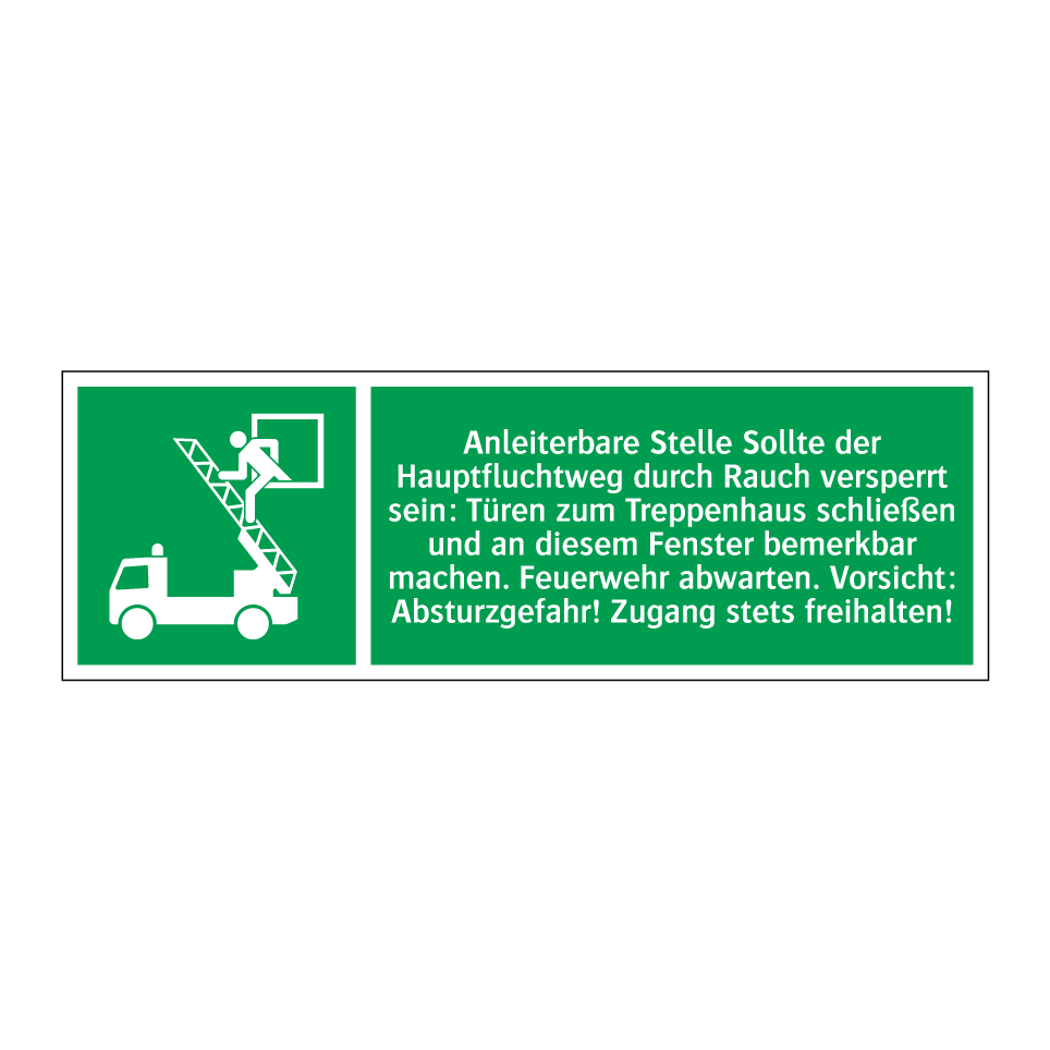 Rettungsschild mit dem Text Anleiterbare Stelle Sollte der Hauptfluchtweg durch Rauch versperrt sein: Türen zum Treppenhaus schließen und an diesem Fenster bemerkbar machen. Feuerwehr abwarten. Vorsicht: Absturzgefahr! Zugang stets freihalten!