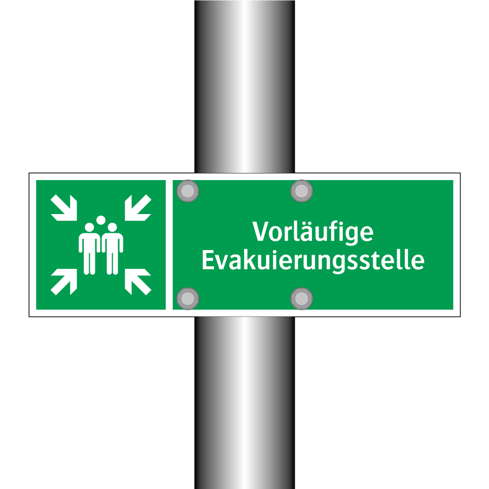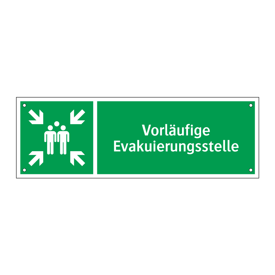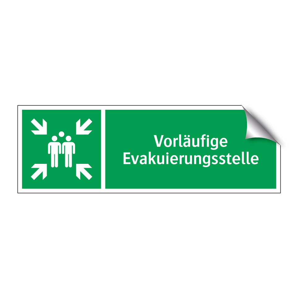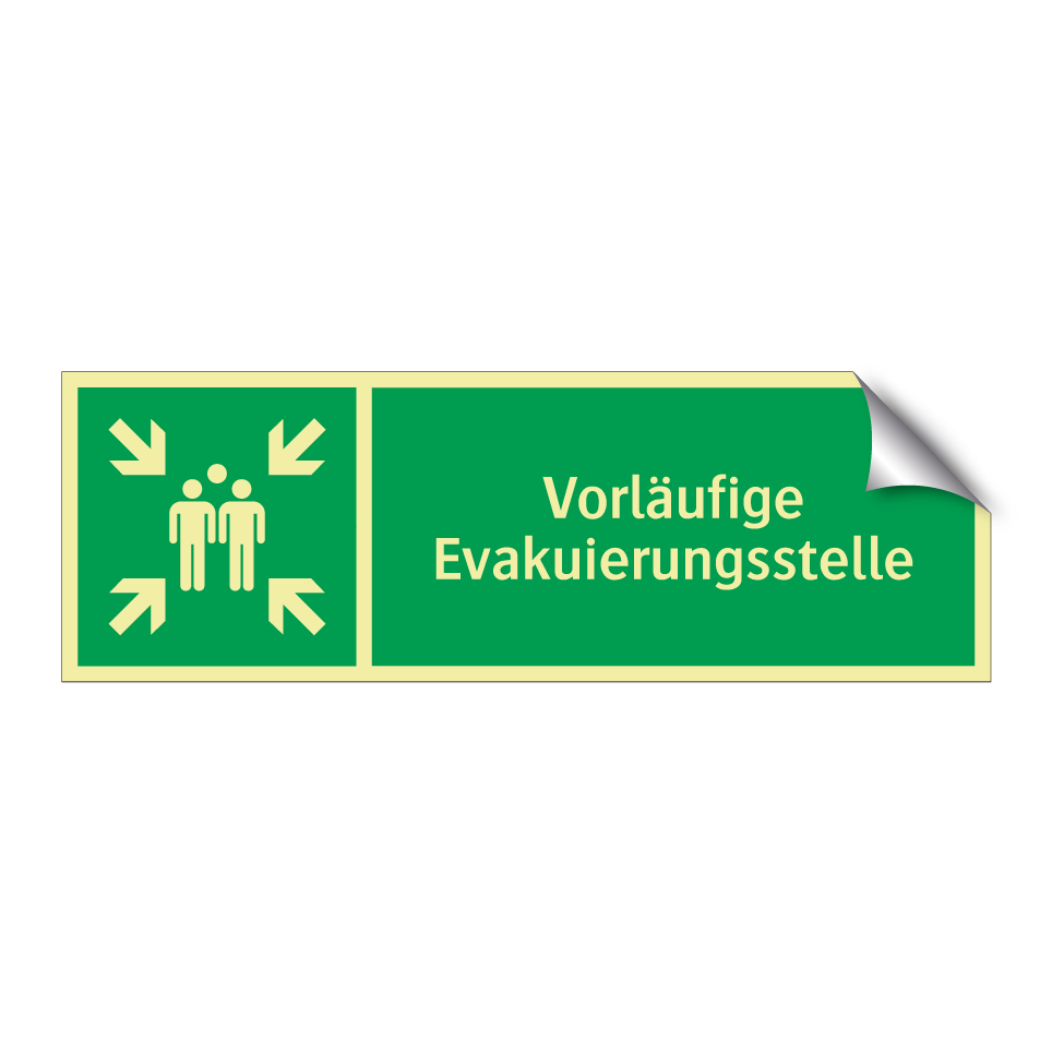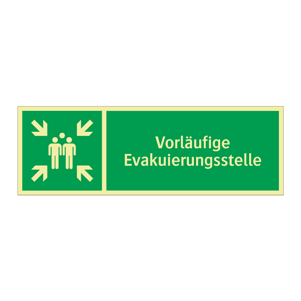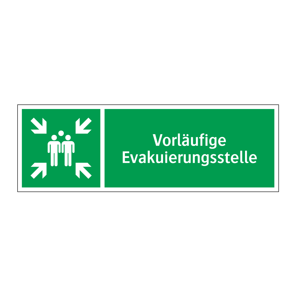 Rettungsschild mit dem Text Vorläufige Evakuierungsstelle