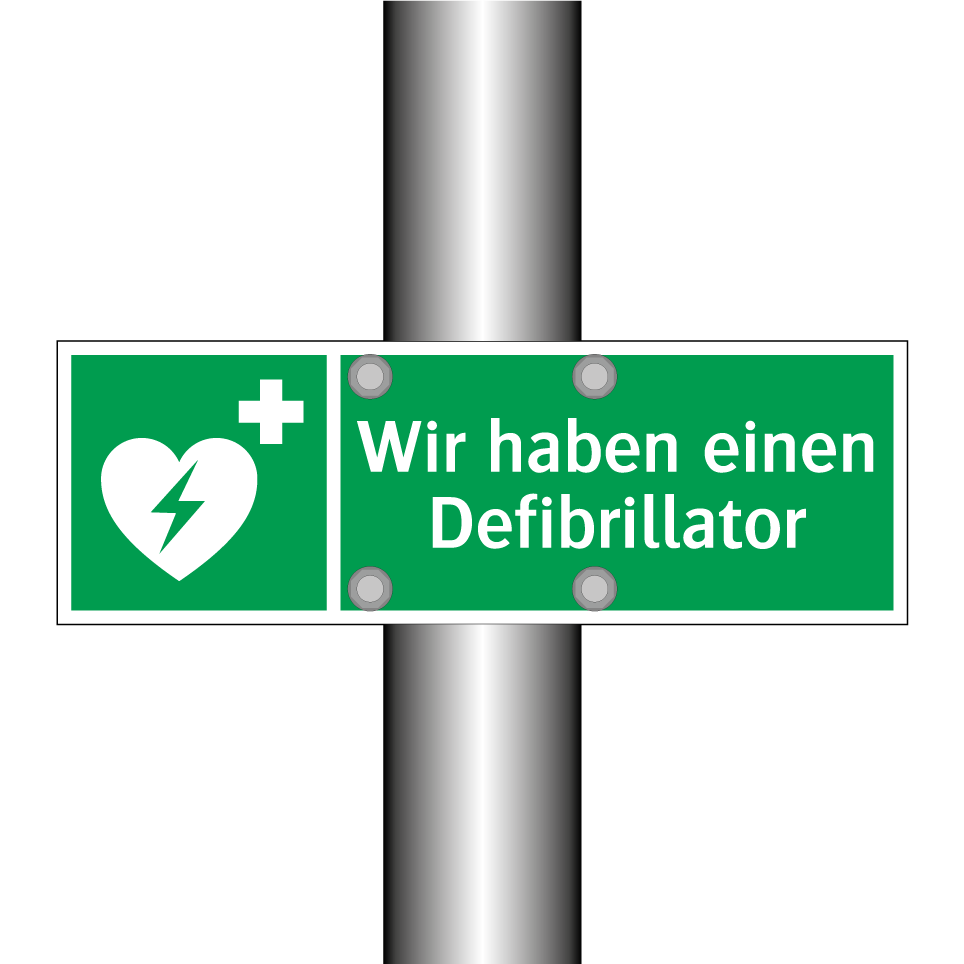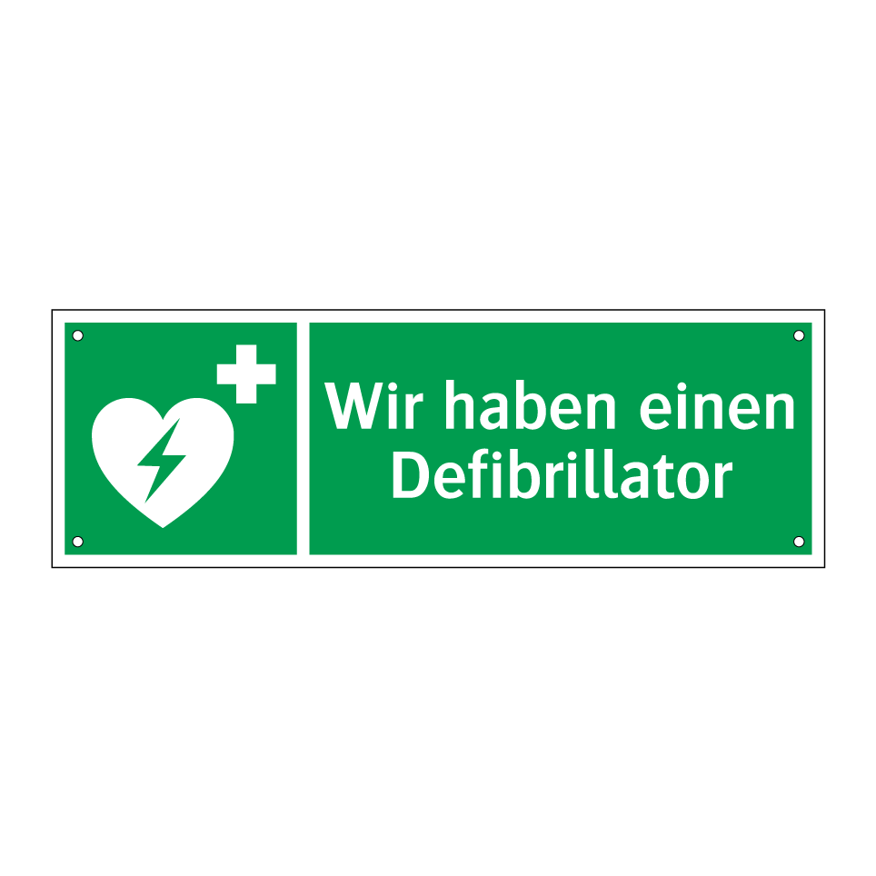 Rettungsschild mit dem Text Wir haben einen Defibrillator
