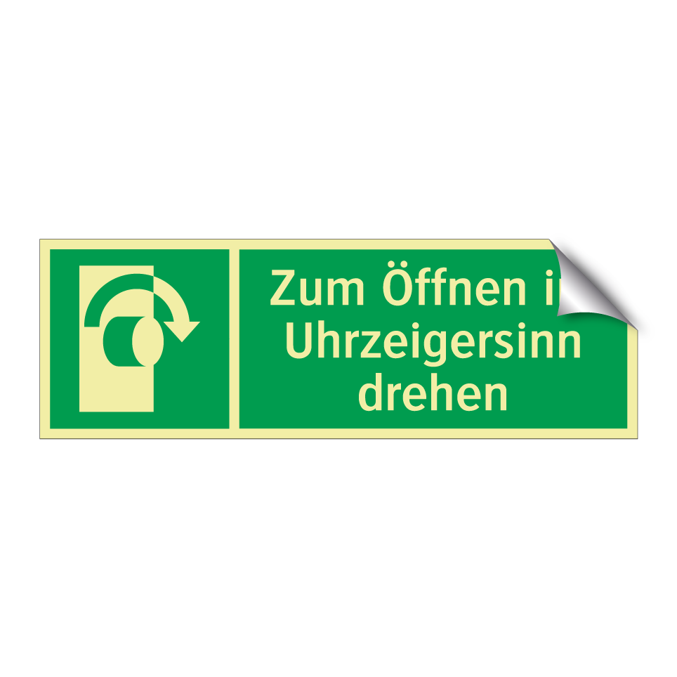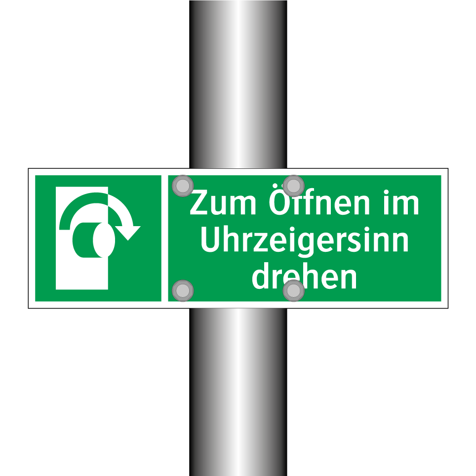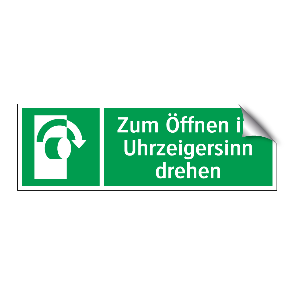 Rettungsschild mit dem Text Zum Öffnen im Uhrzeigersinn drehen