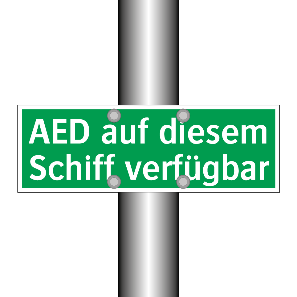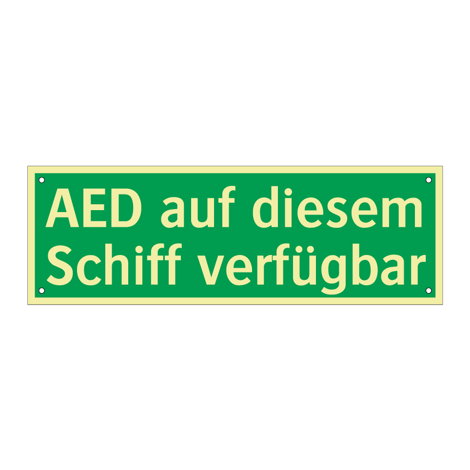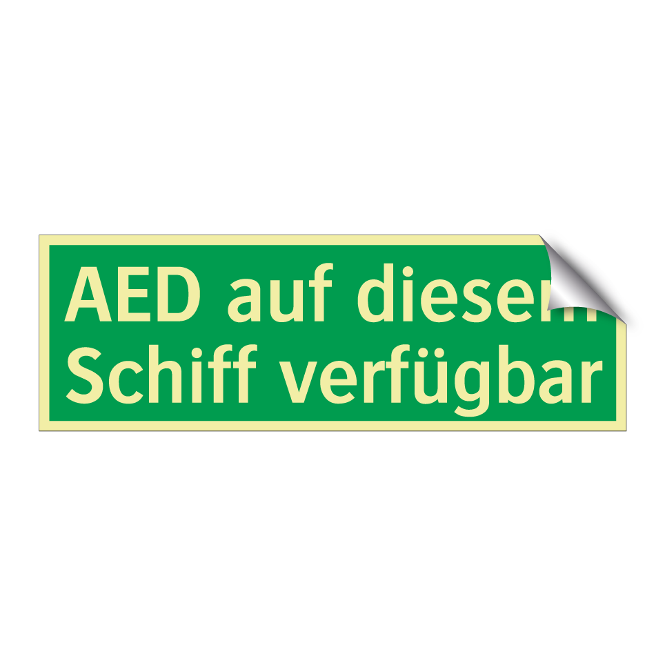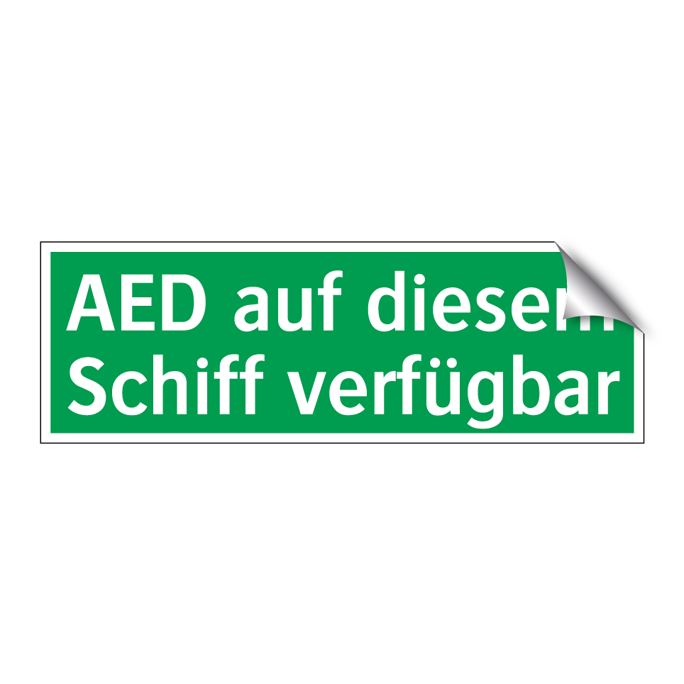 Rettungsschild mit dem Text AED auf diesem Schiff verfügbar