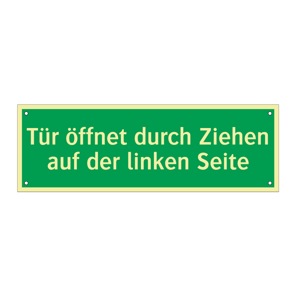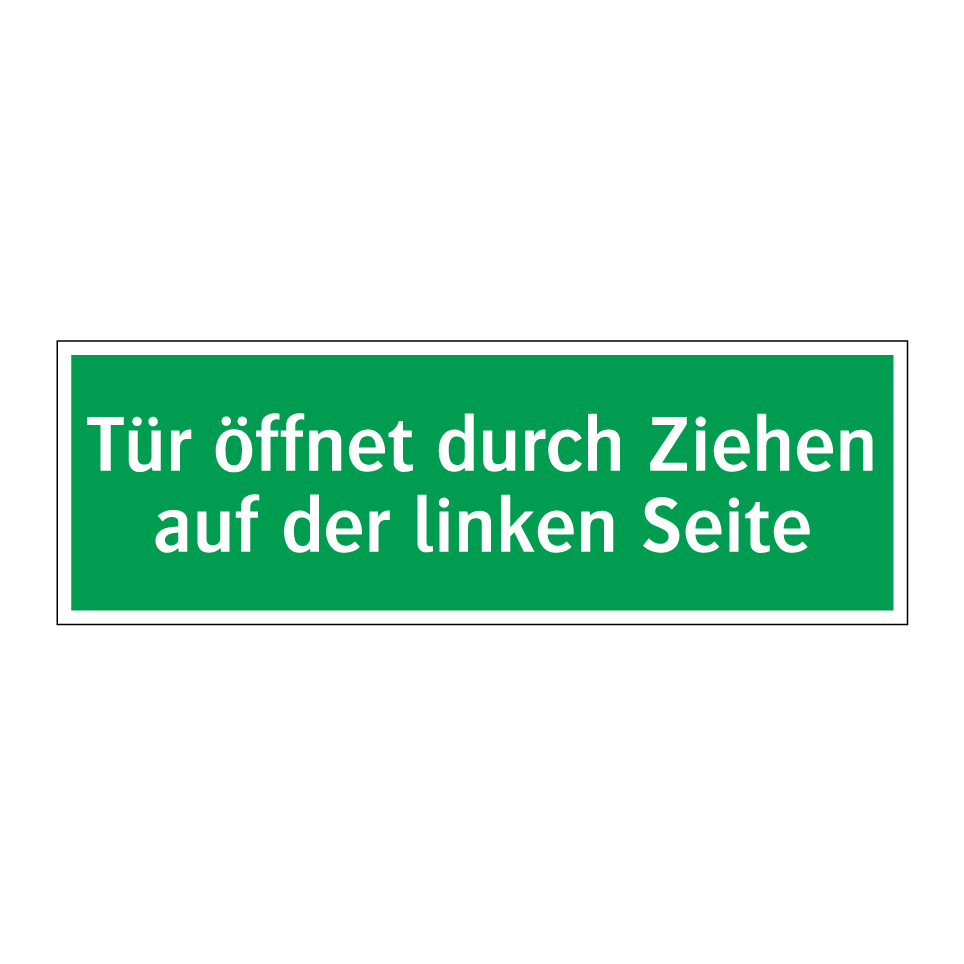 Rettungsschild mit dem Text Tür öffnet durch Ziehen auf der linken Seite