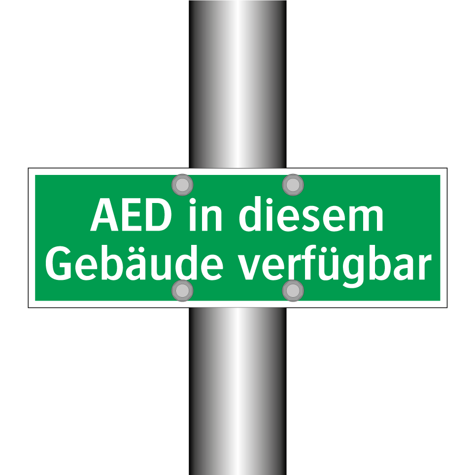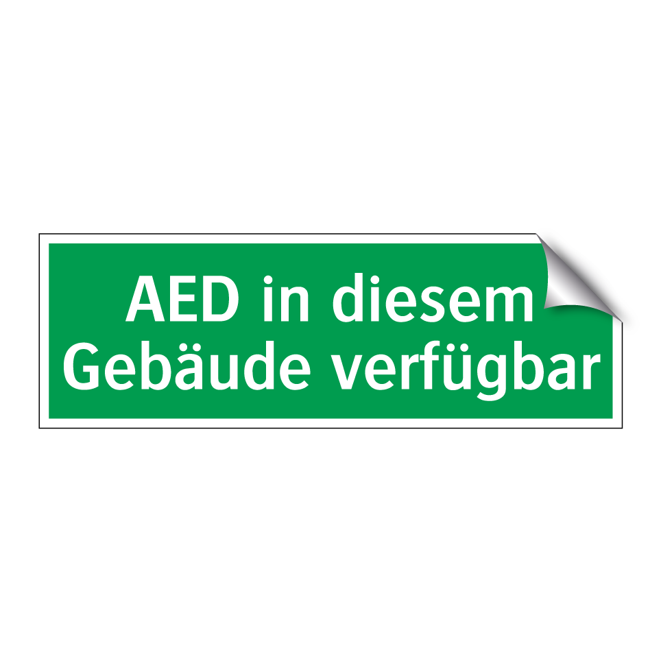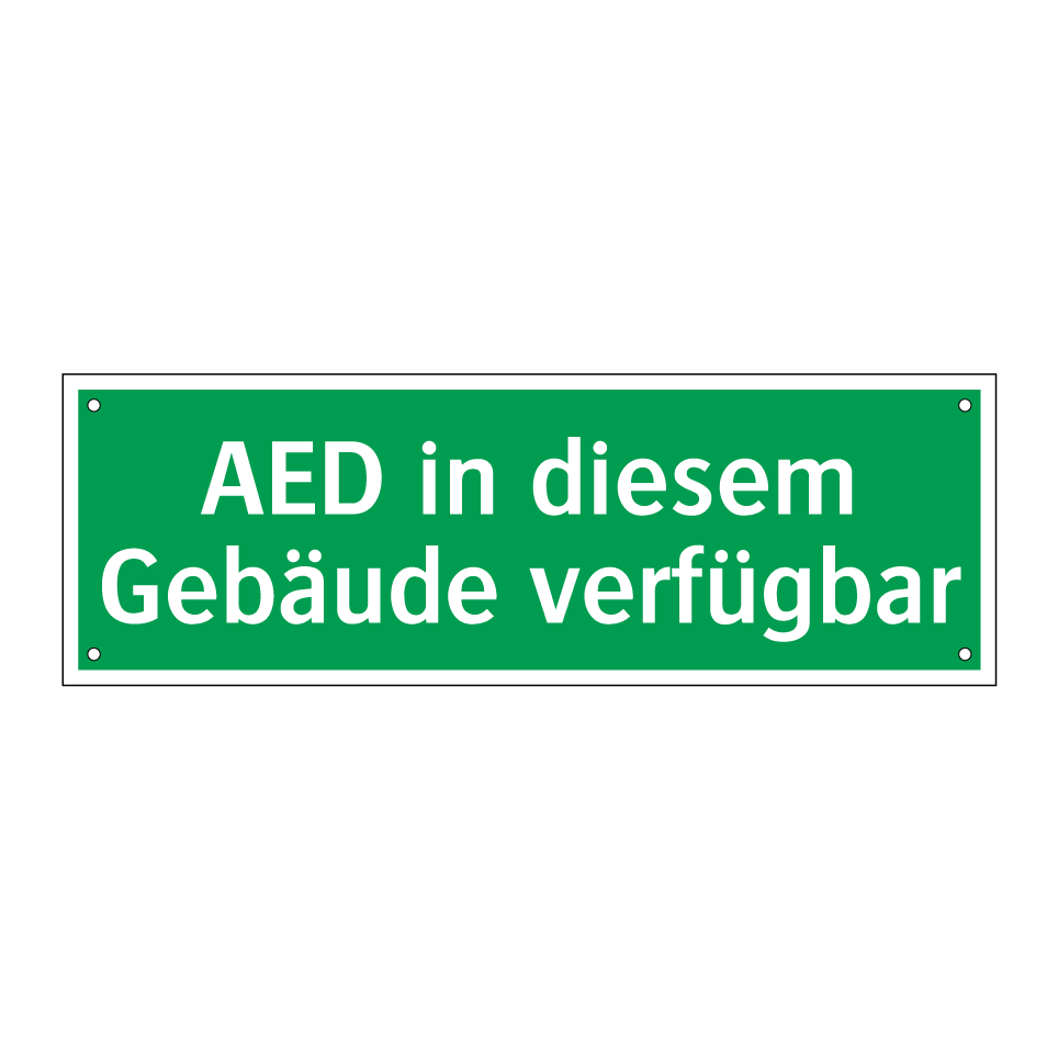 Rettungsschild mit dem Text AED in diesem Gebäude verfügbar