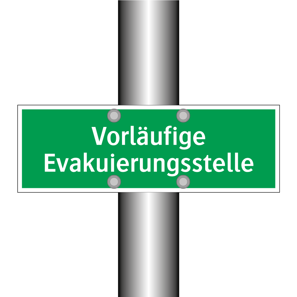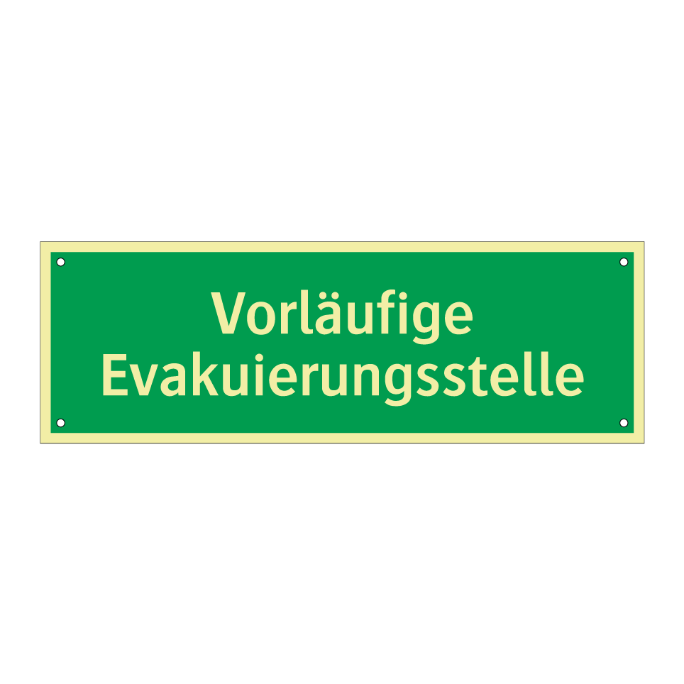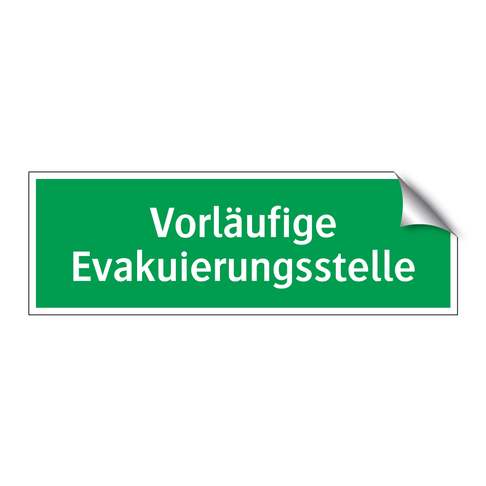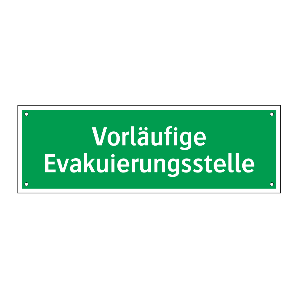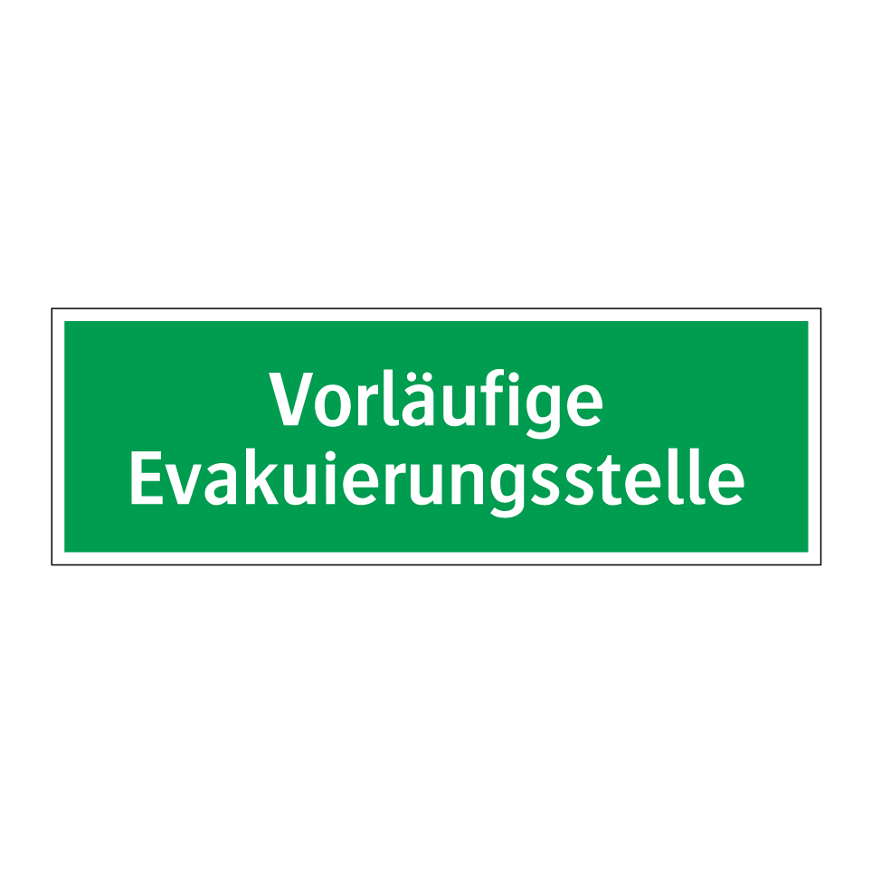Rettungsschild mit dem Text Vorläufige Evakuierungsstelle