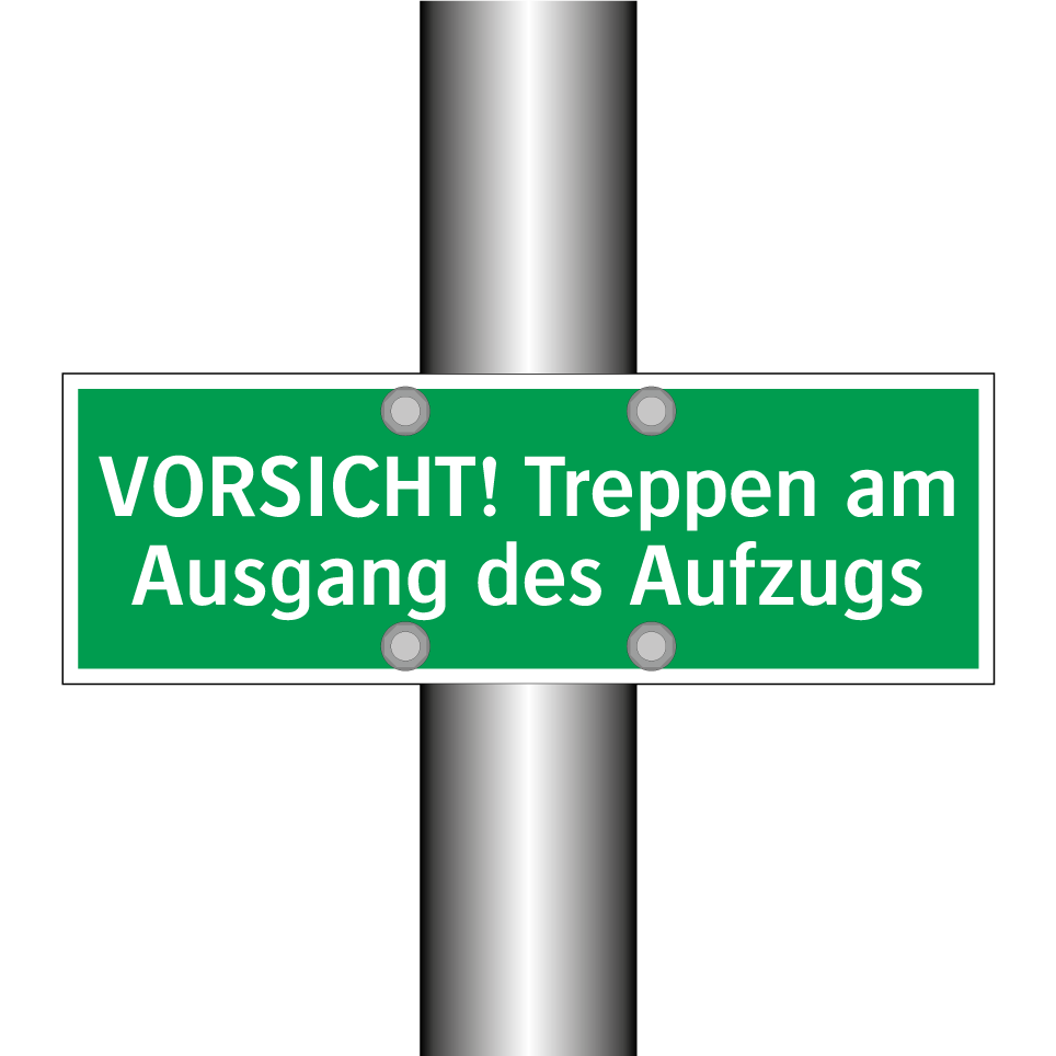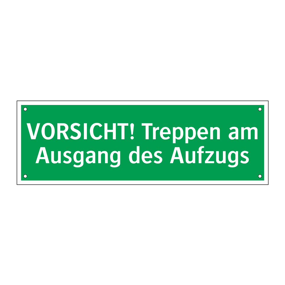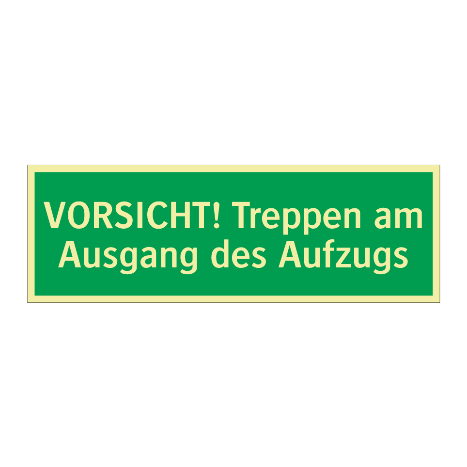 Rettungsschild mit dem Text VORSICHT! Treppen am Ausgang des Aufzugs