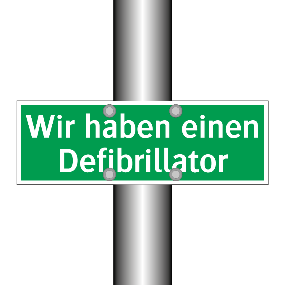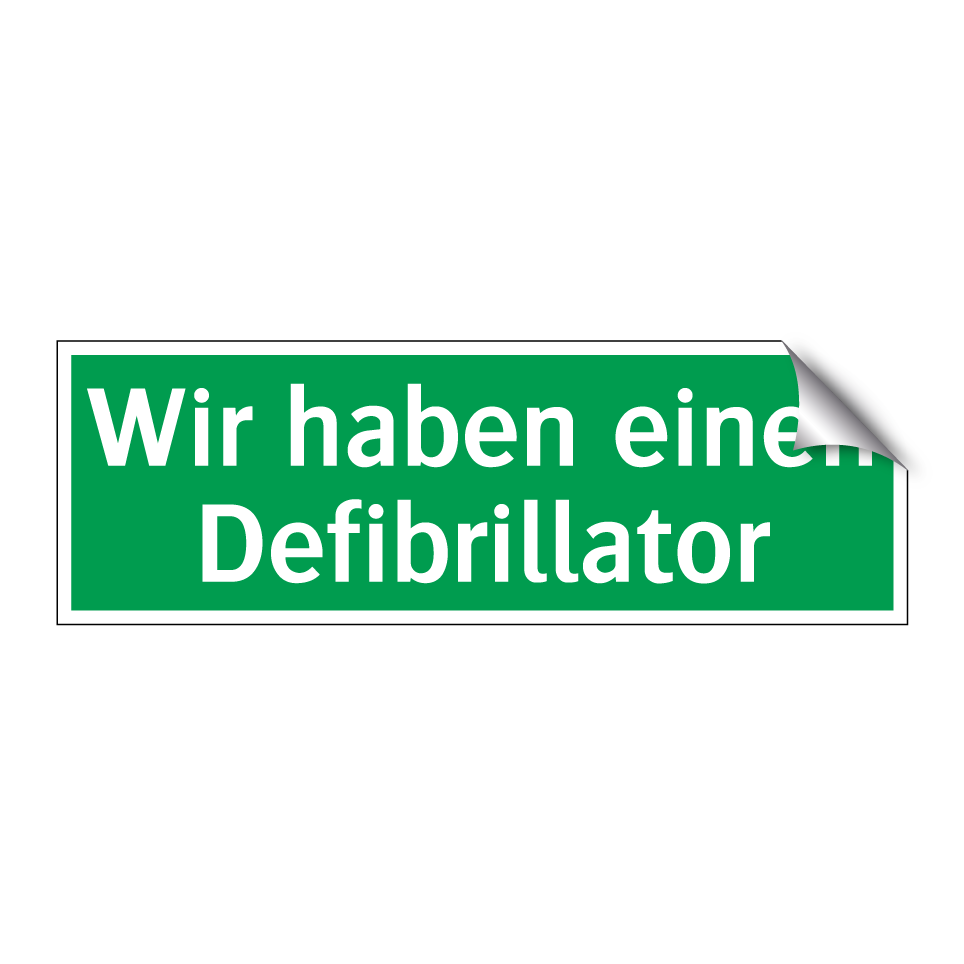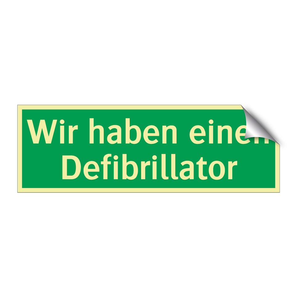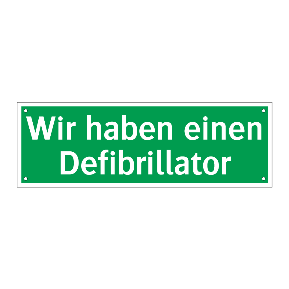Rettungsschild mit dem Text Wir haben einen Defibrillator