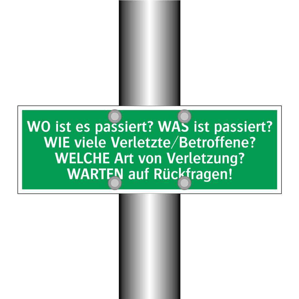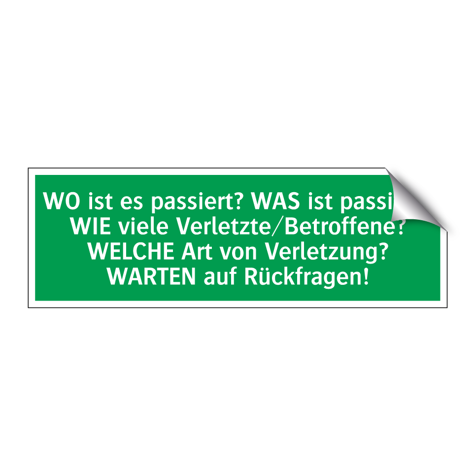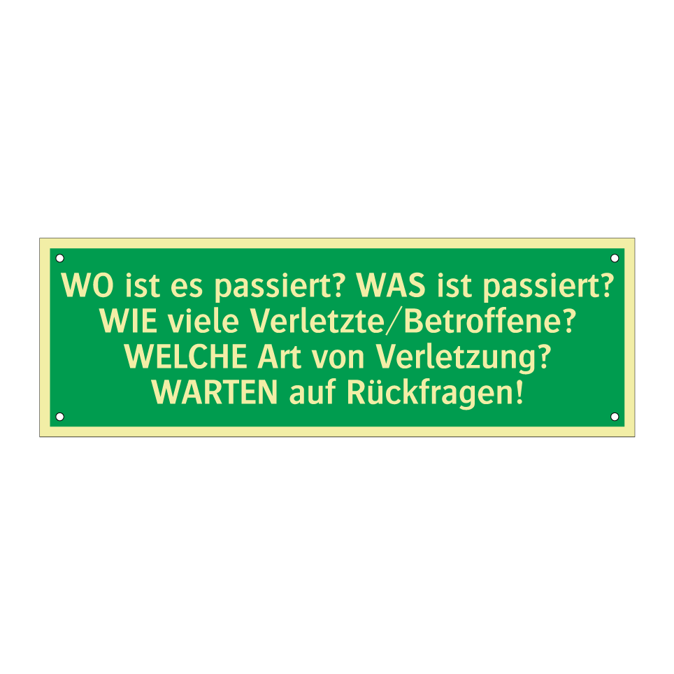 Rettungsschild mit dem Text WO ist es passiert? WAS ist passiert? WIE viele Verletzte/Betroffene? WELCHE Art von Verletzung? WARTEN auf Rückfragen!