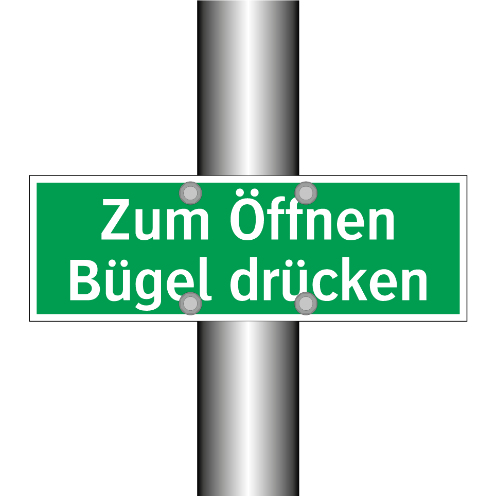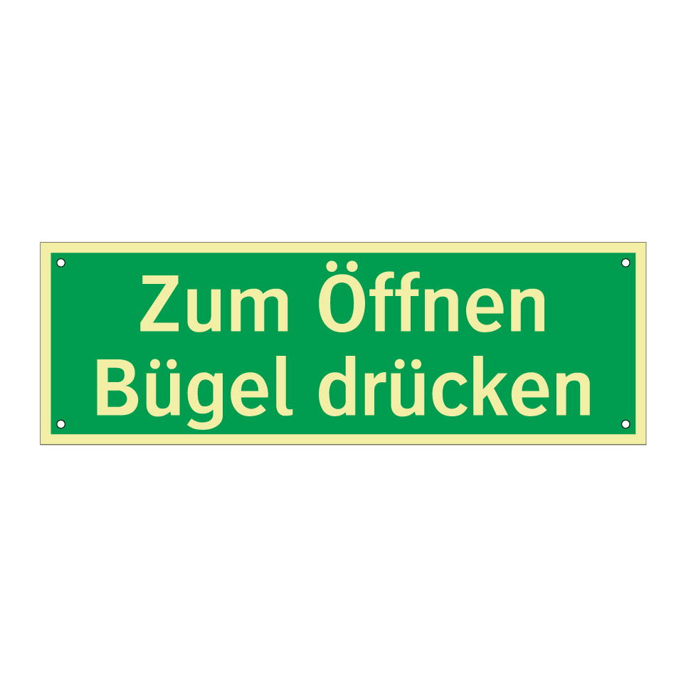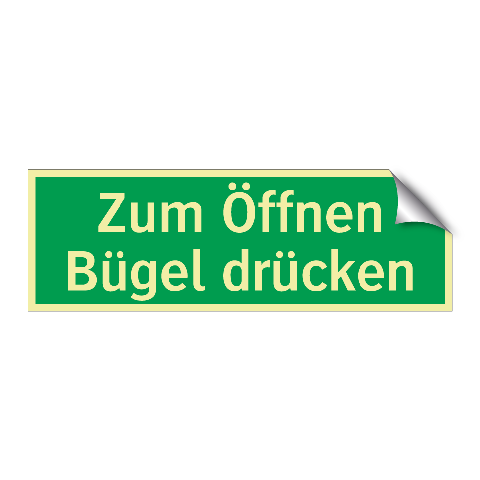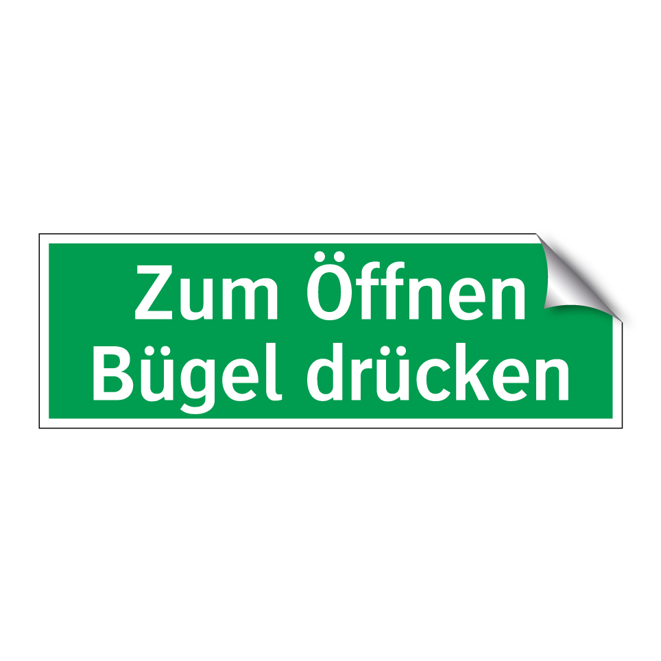 Rettungsschild mit dem Text Zum Öffnen Bügel drücken