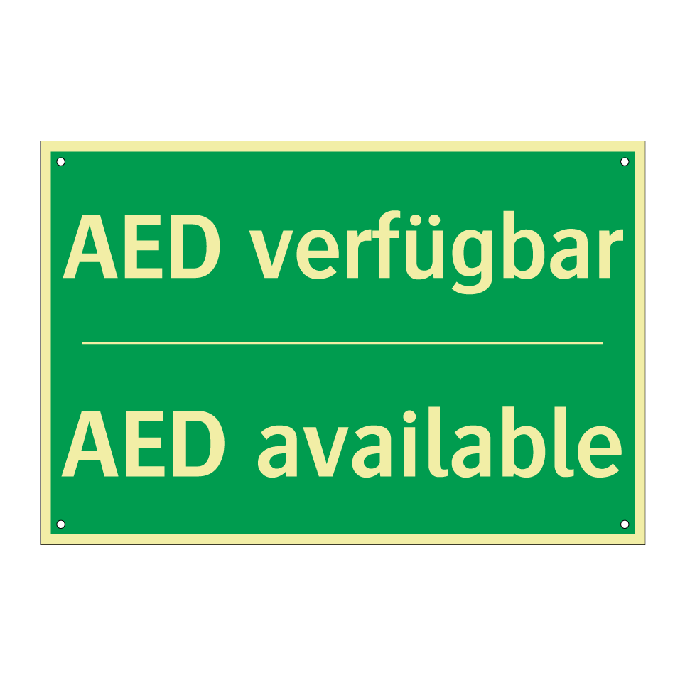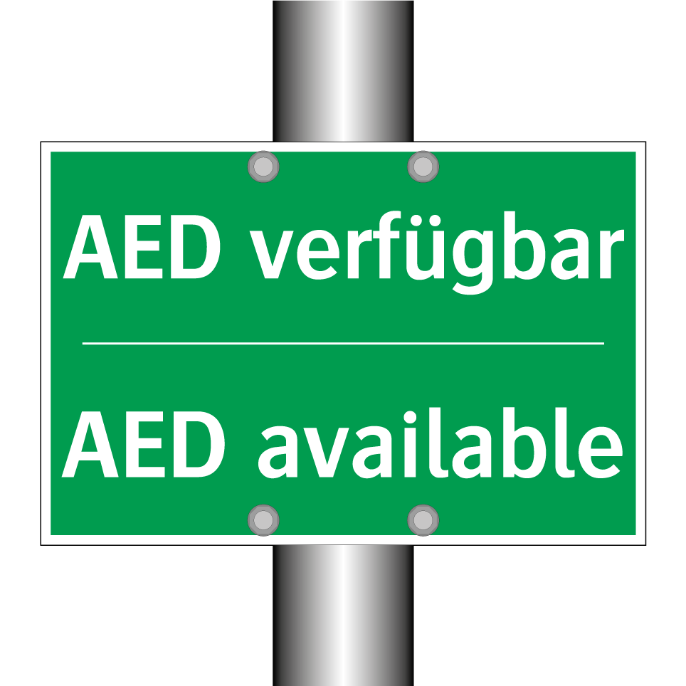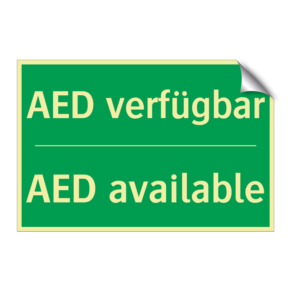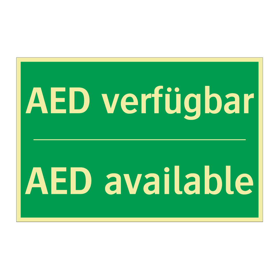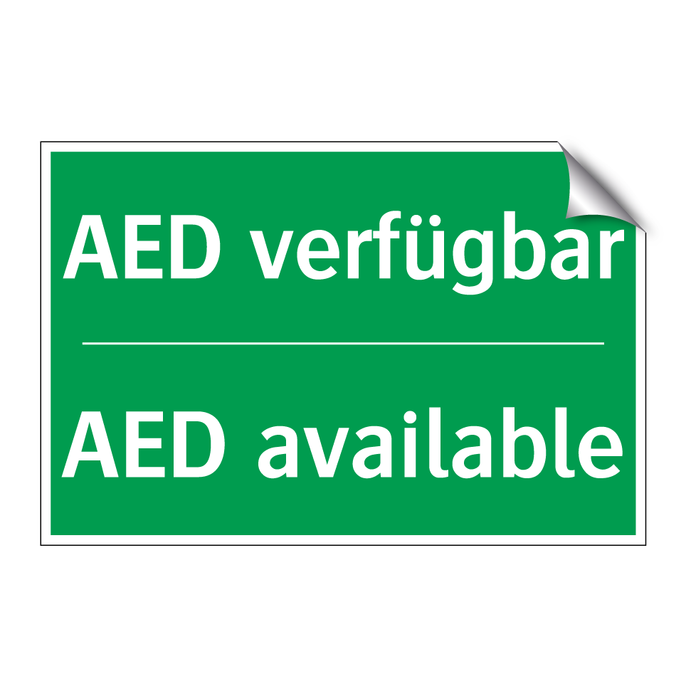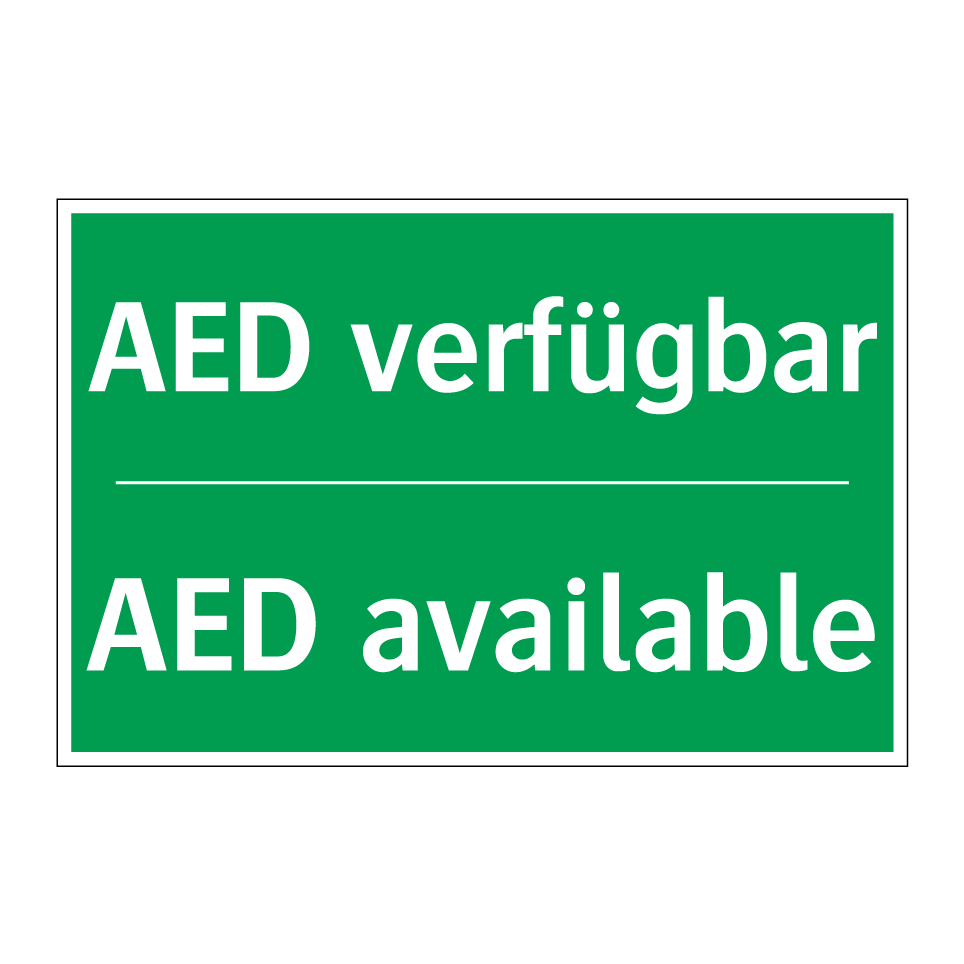 Zweisprachiges Rettungsschild mit deutschem Text AED verfügbar und englischem Text AED available