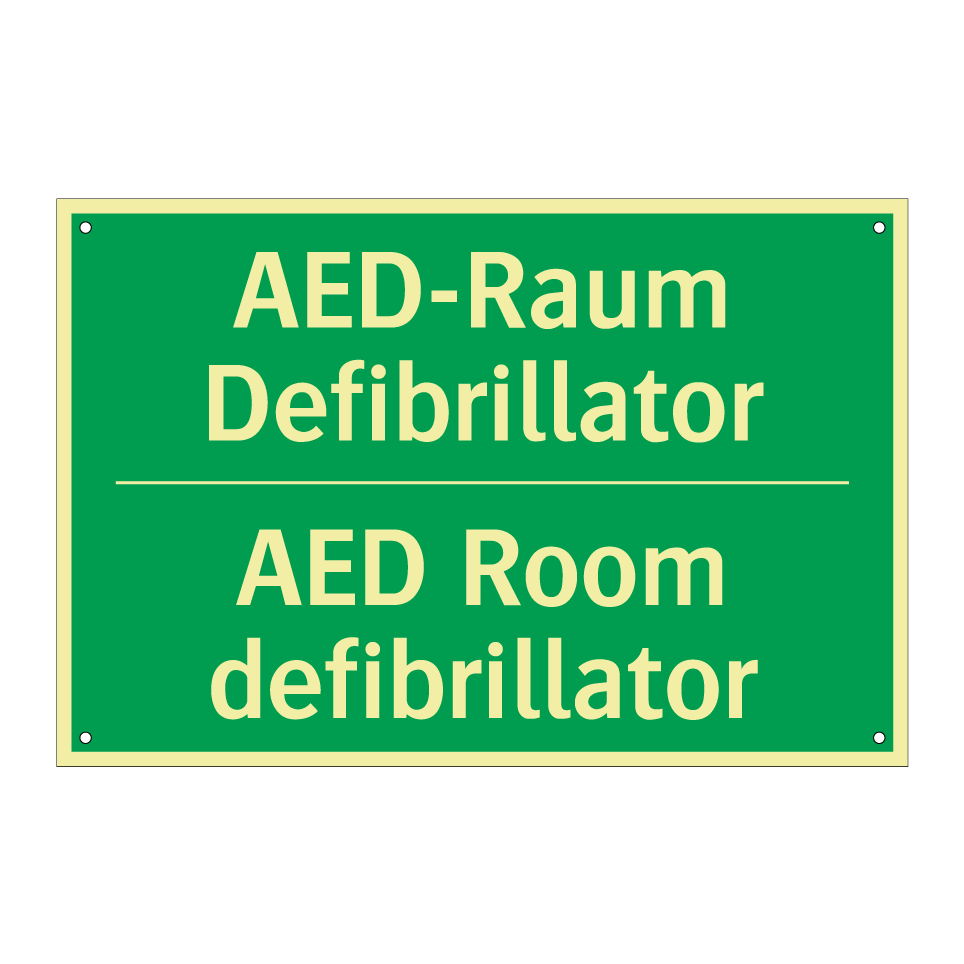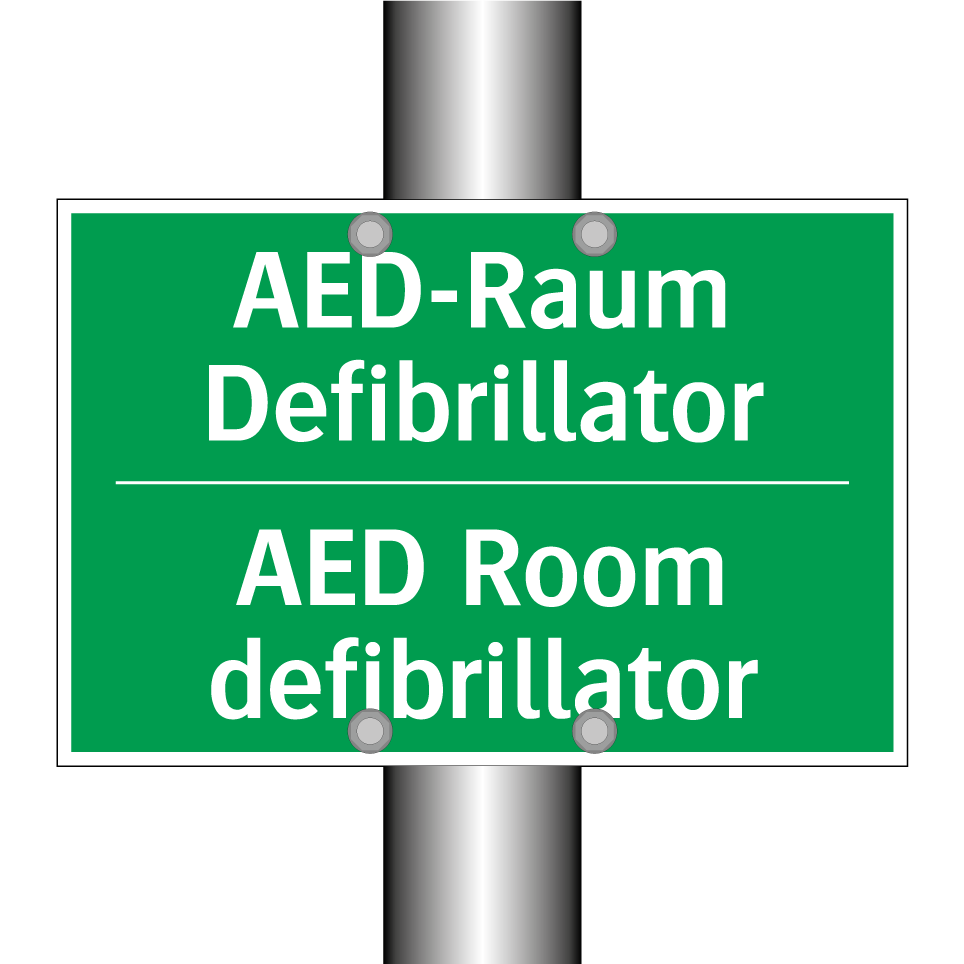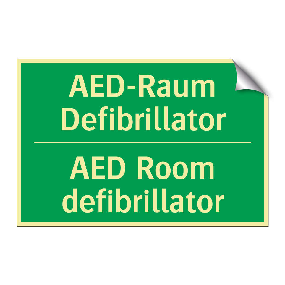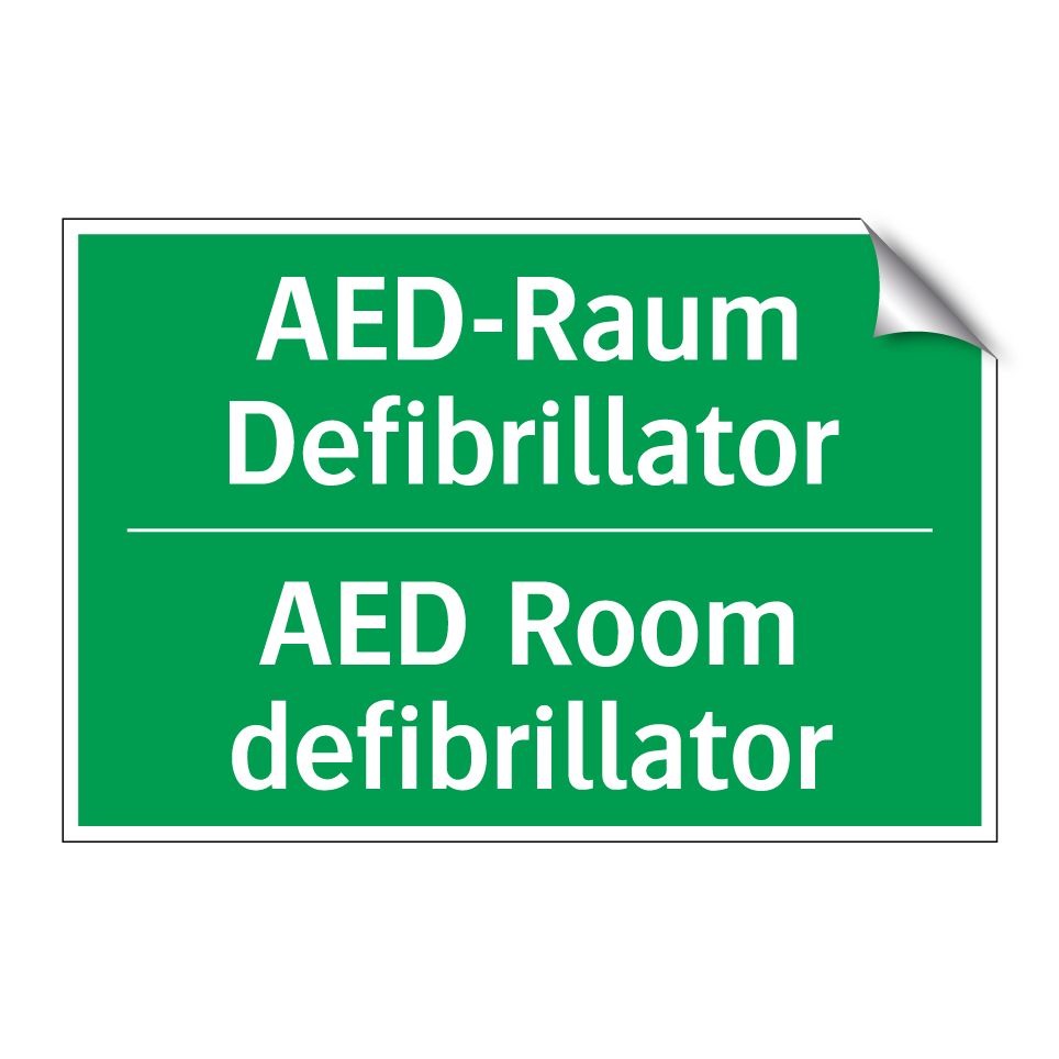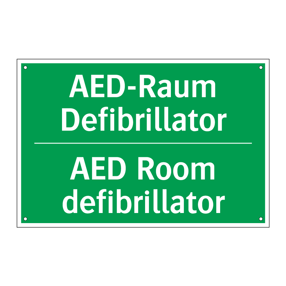 Zweisprachiges Rettungsschild mit deutschem Text AED-Raum Defibrillator und englischem Text AED Room defibrillator