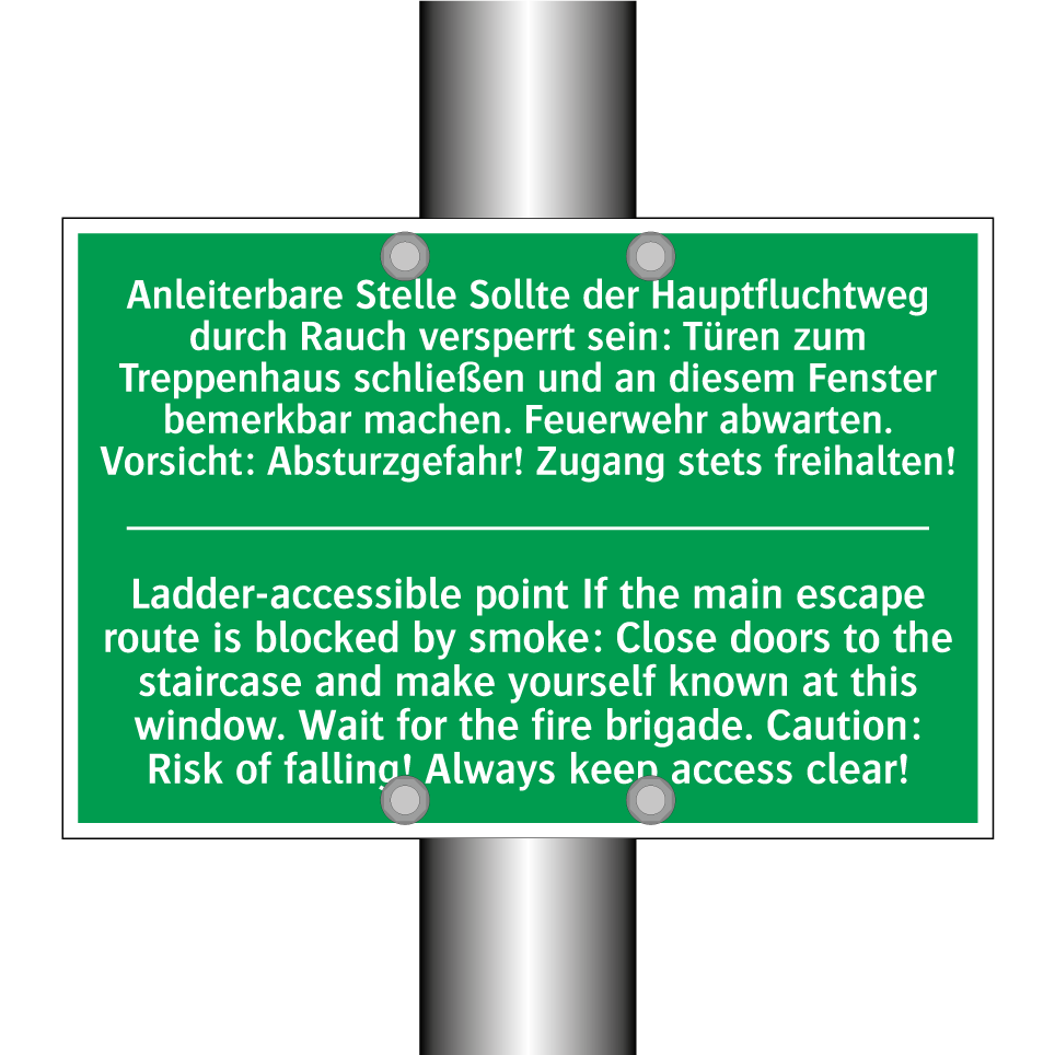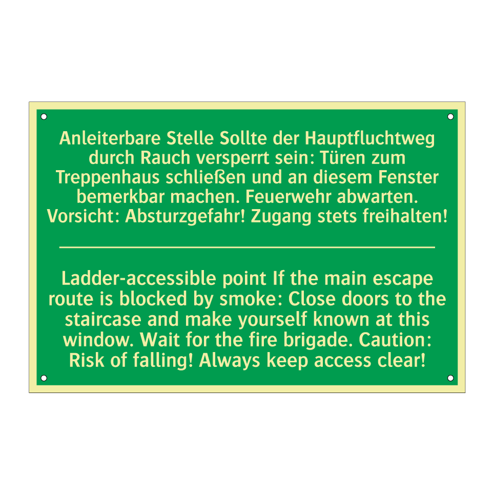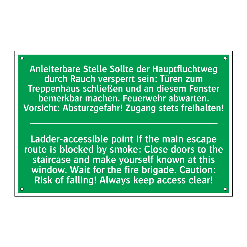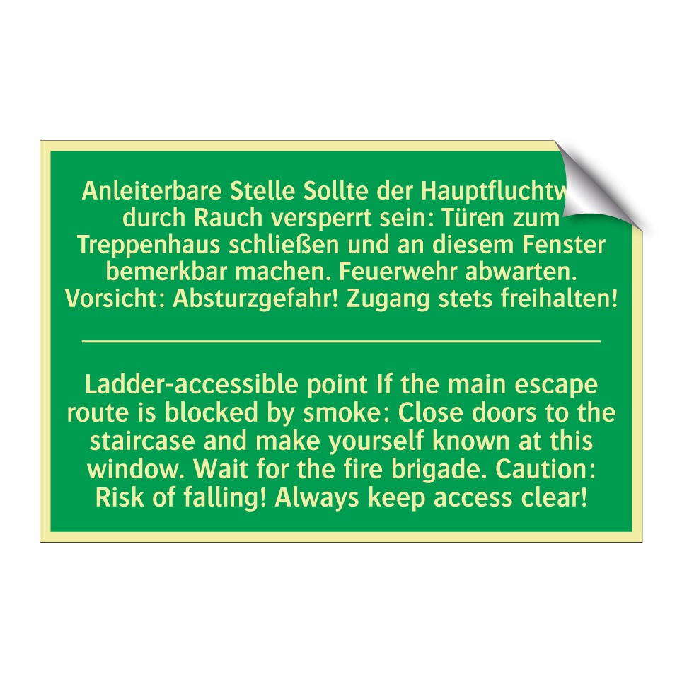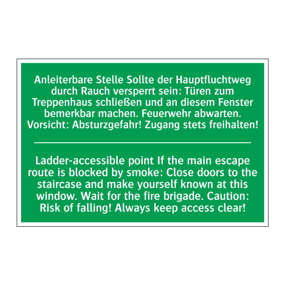Zweisprachiges Rettungsschild mit deutschem Text Anleiterbare Stelle Sollte der Hauptfluchtweg durch Rauch versperrt sein: Türen zum Treppenhaus schließen und an diesem Fenster bemerkbar machen. Feuerwehr abwarten. Vorsicht: Absturzgefahr! Zugang stets freihalten! und englischem Text Ladder-accessible point If the main escape route is blocked by smoke: Close doors to the staircase and make yourself known at this window. Wait for the fire brigade. Caution: Risk of falling! Always keep access clear!