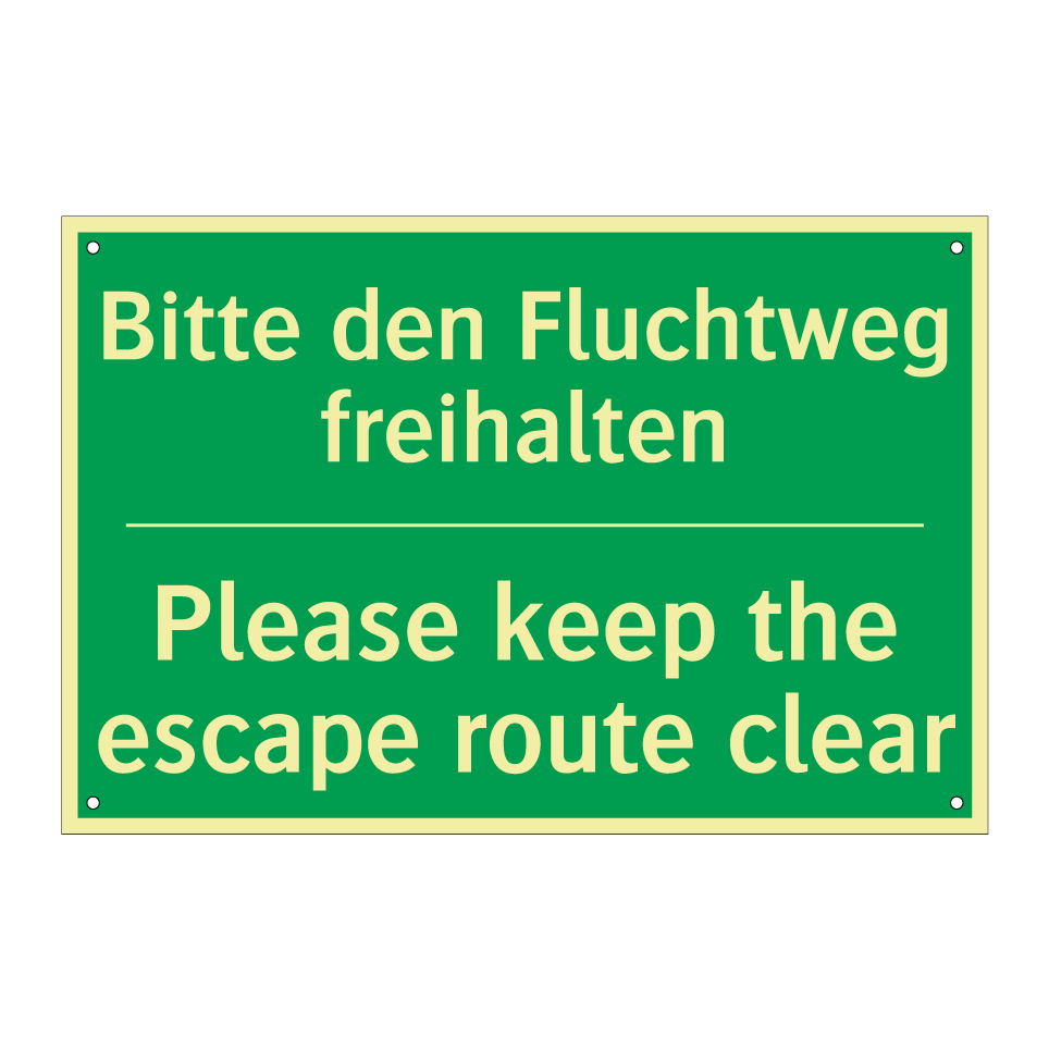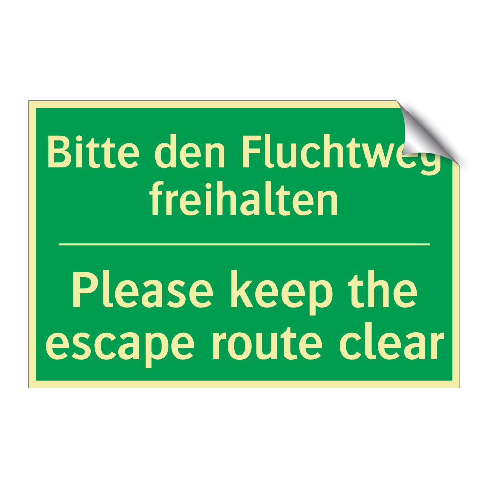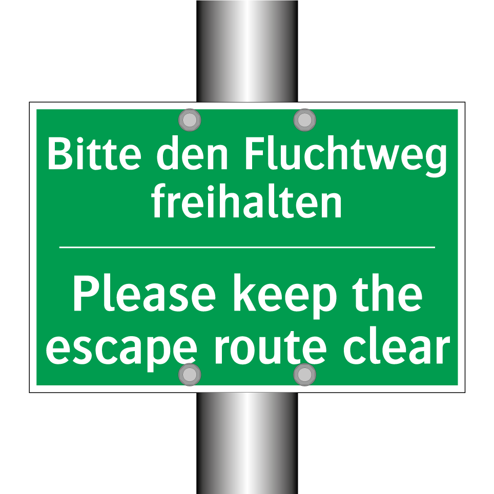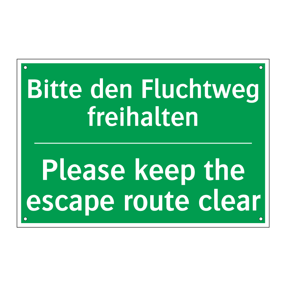 Zweisprachiges Rettungsschild mit deutschem Text Bitte den Fluchtweg freihalten und englischem Text Please keep the escape route clear