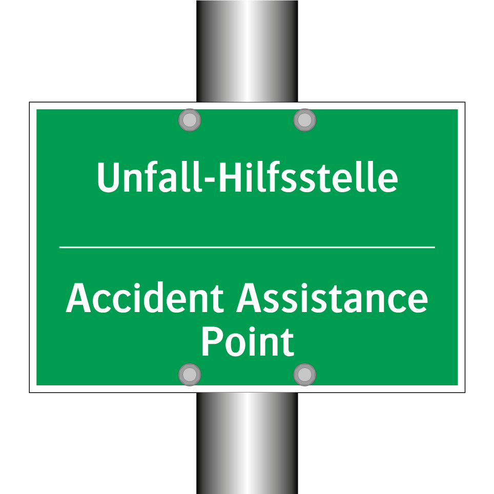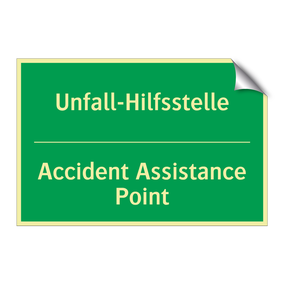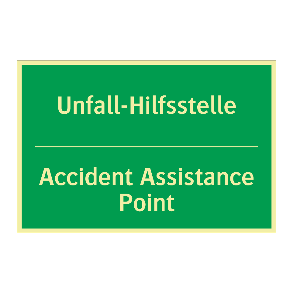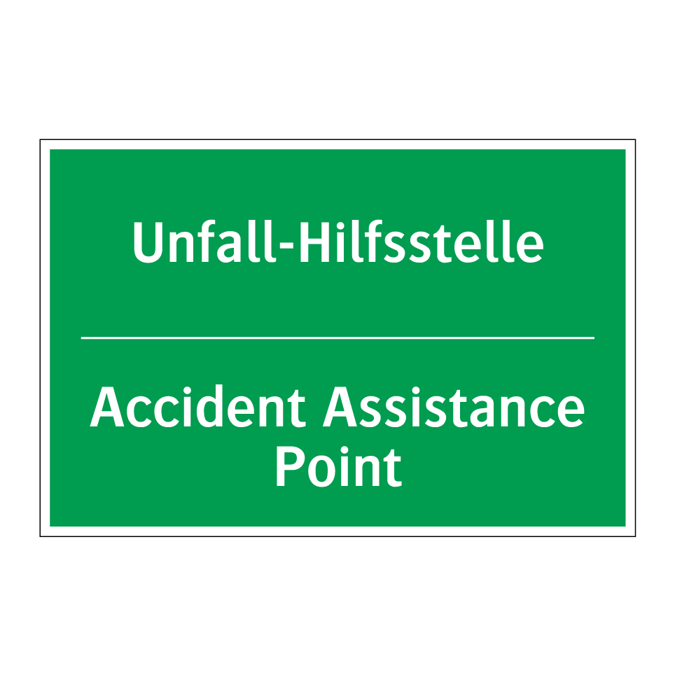 Zweisprachiges Rettungsschild mit deutschem Text Unfall-Hilfsstelle und englischem Text Accident Assistance Point