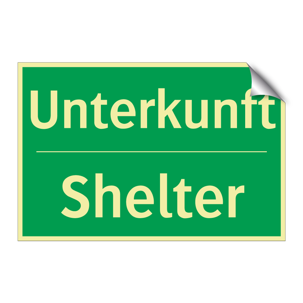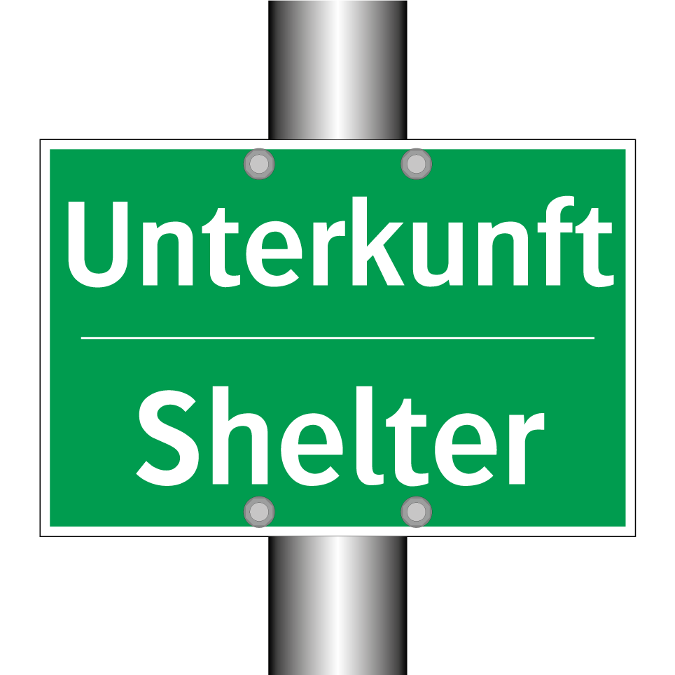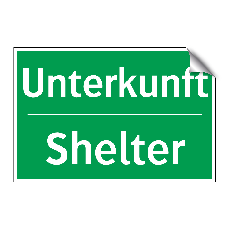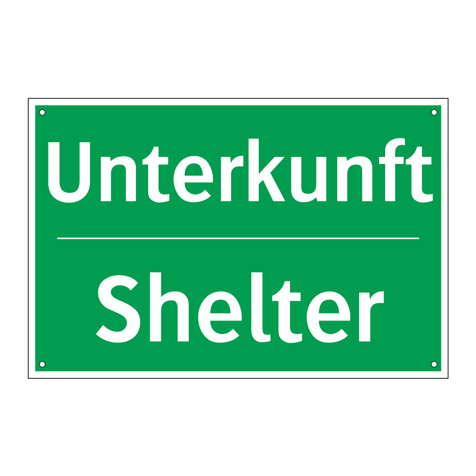Zweisprachiges Rettungsschild mit deutschem Text Unterkunft und englischem Text Shelter
