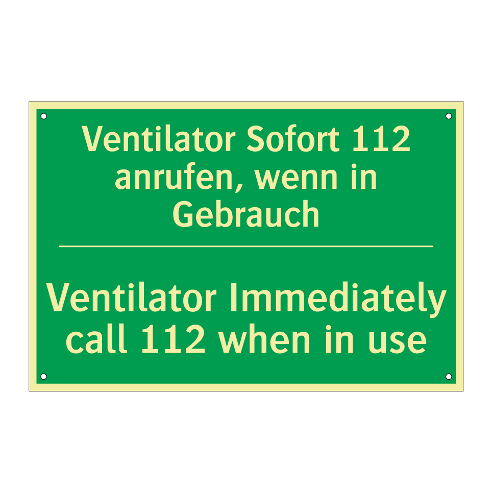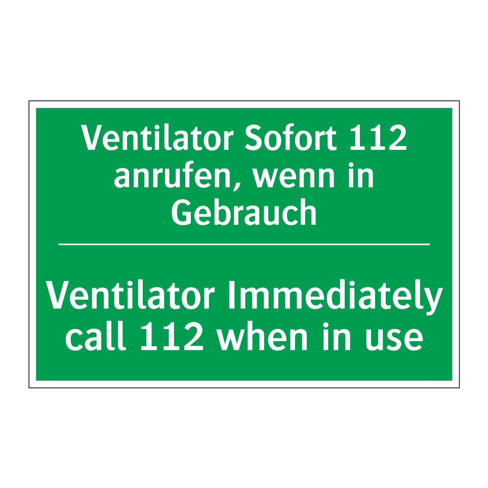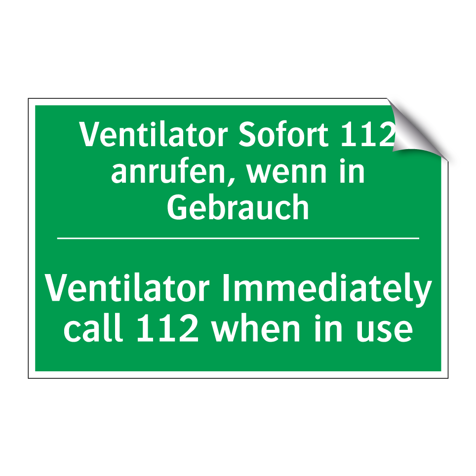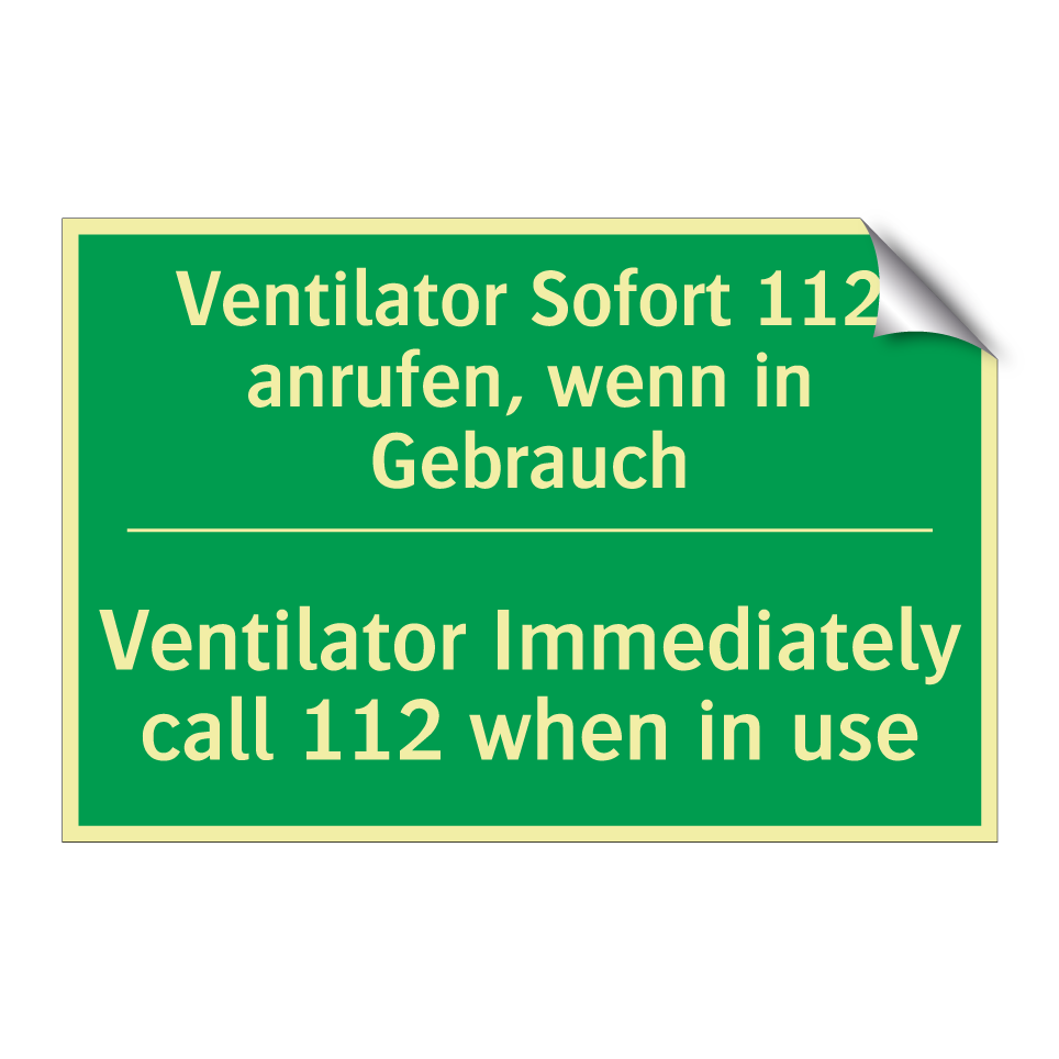 Zweisprachiges Rettungsschild mit deutschem Text Ventilator Sofort 112 anrufen, wenn in Gebrauch und englischem Text Ventilator Immediately call 112 when in use