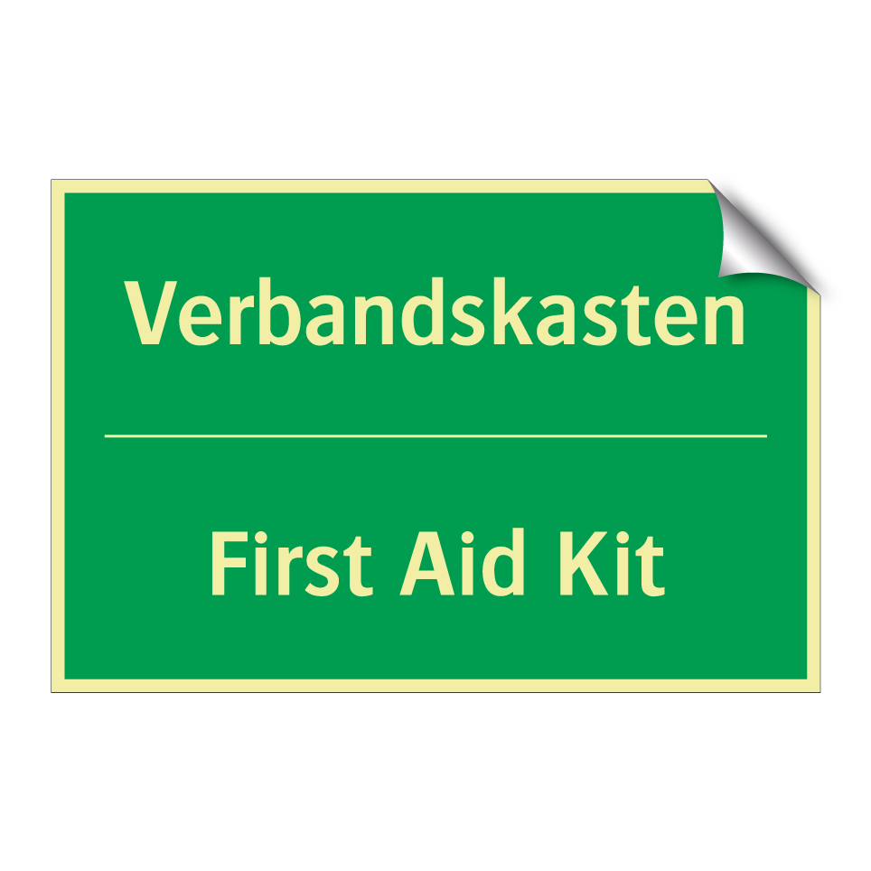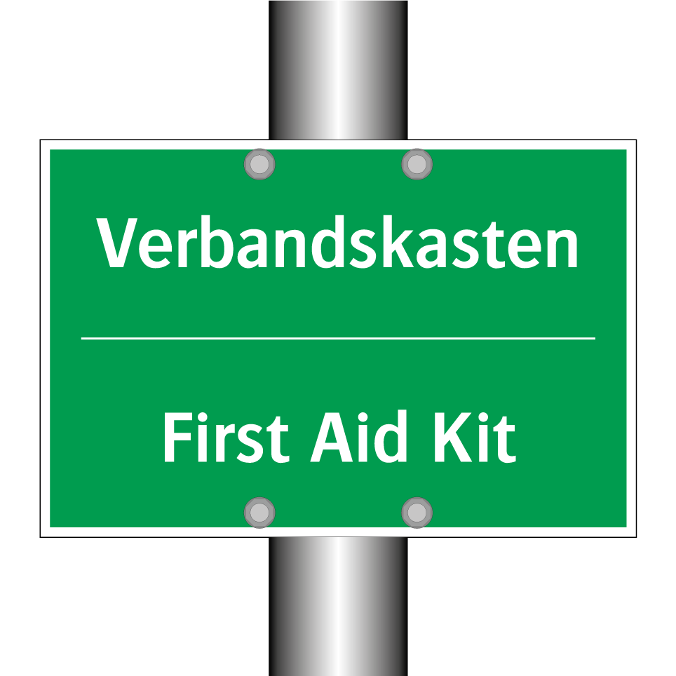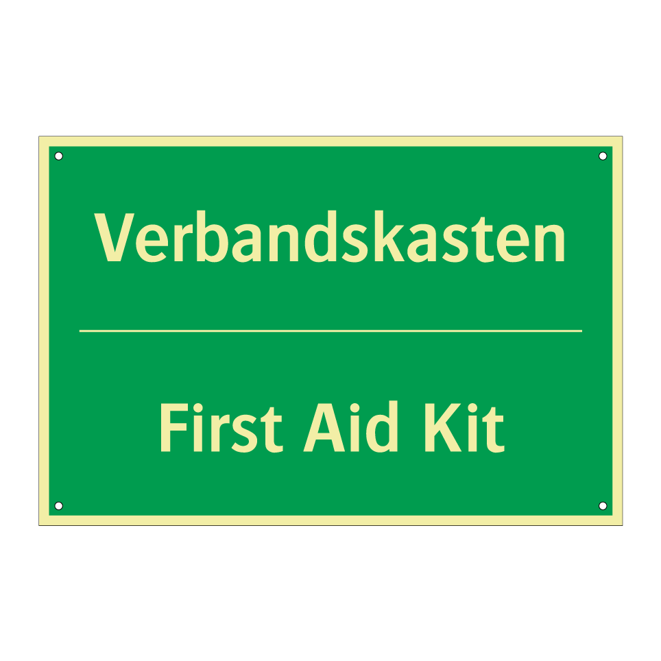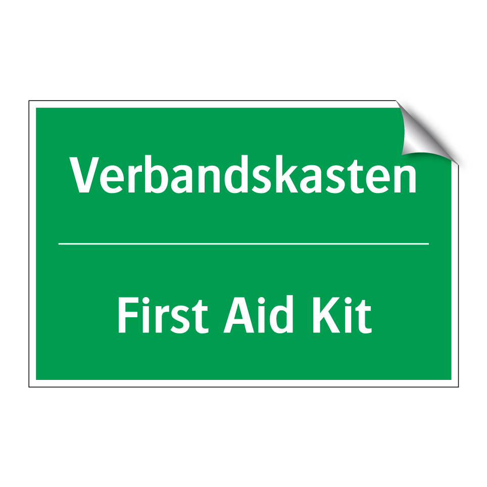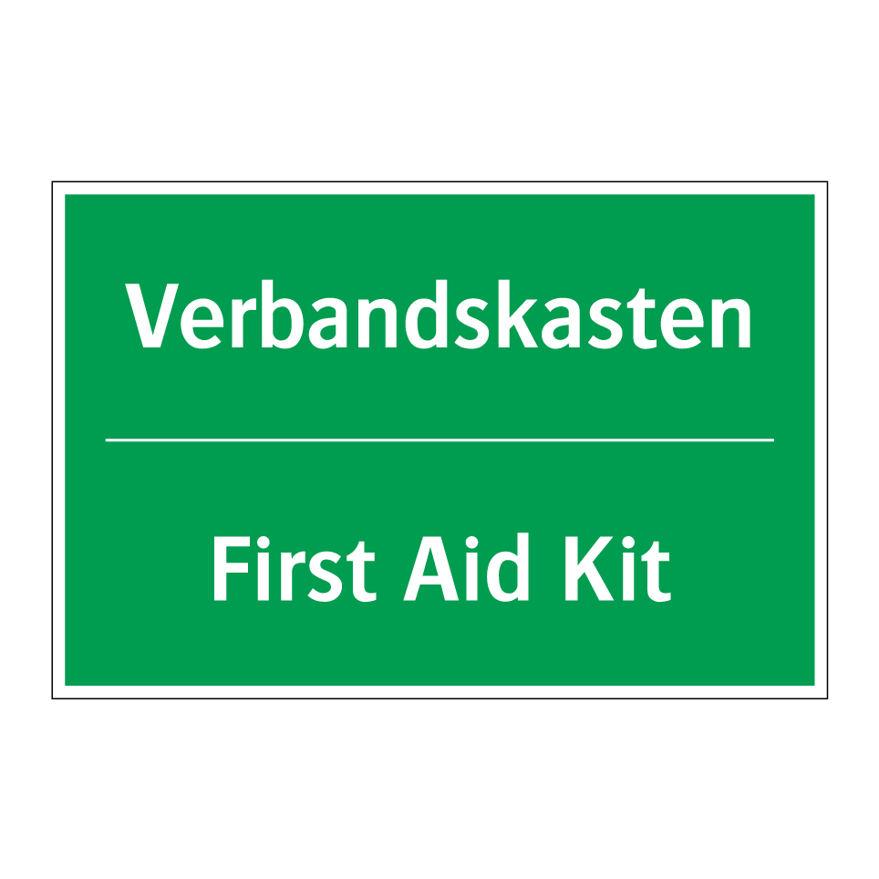 Zweisprachiges Rettungsschild mit deutschem Text Verbandskasten und englischem Text First Aid Kit