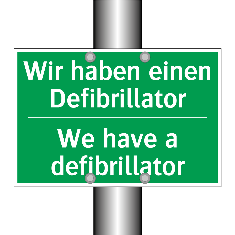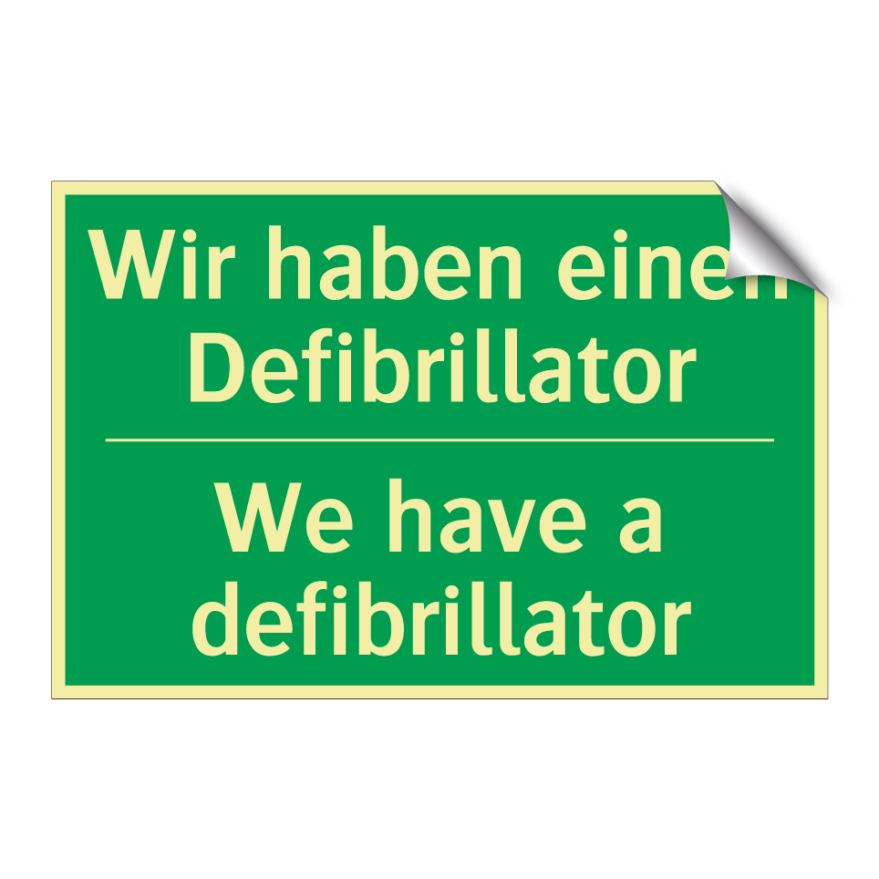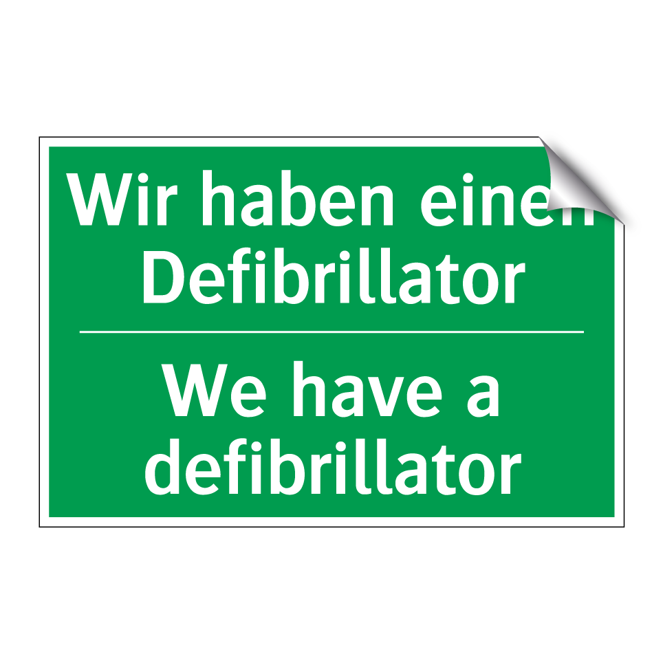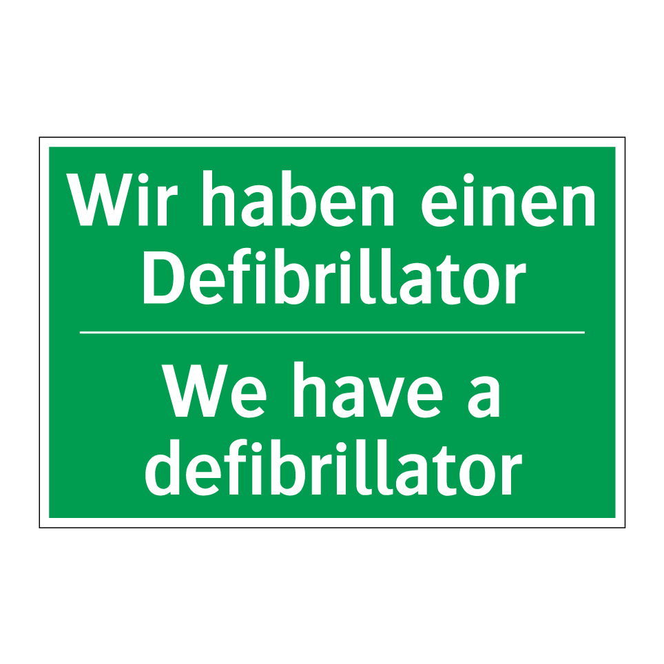 Zweisprachiges Rettungsschild mit deutschem Text Wir haben einen Defibrillator und englischem Text We have a defibrillator