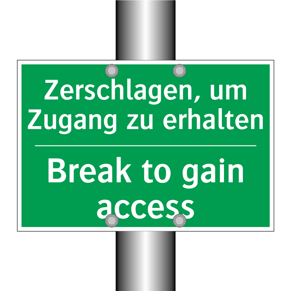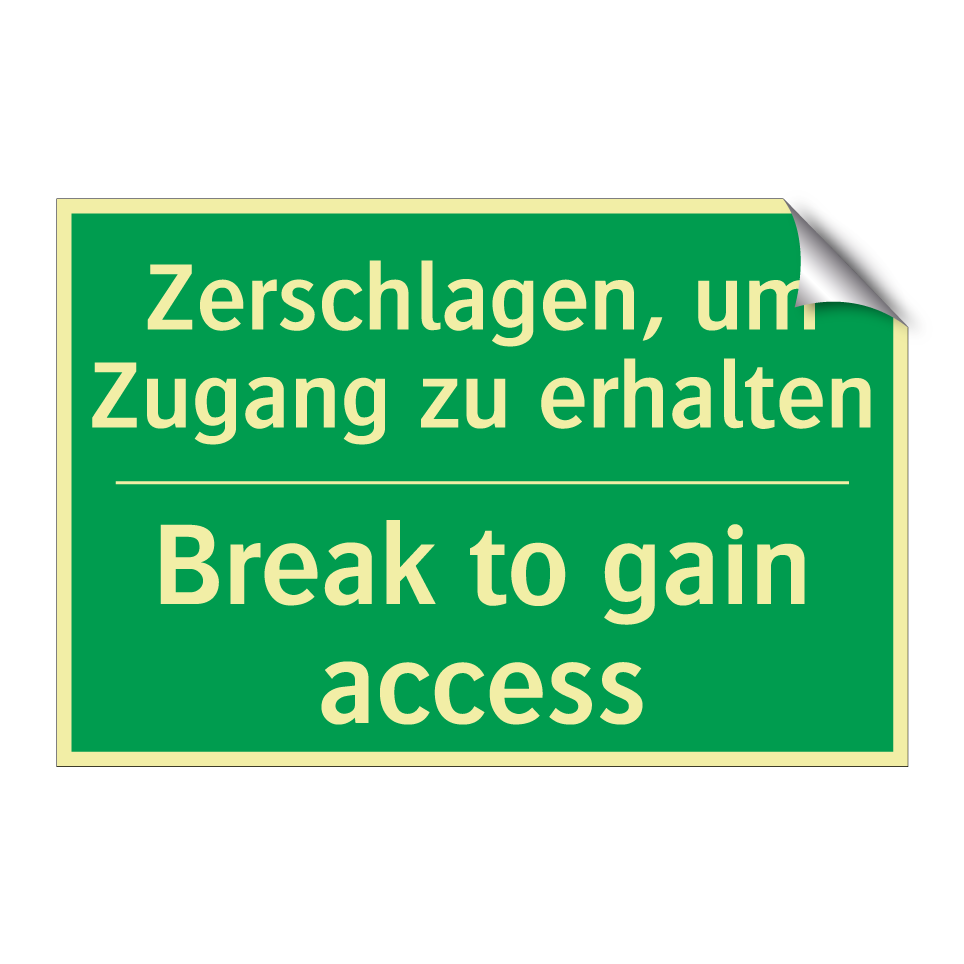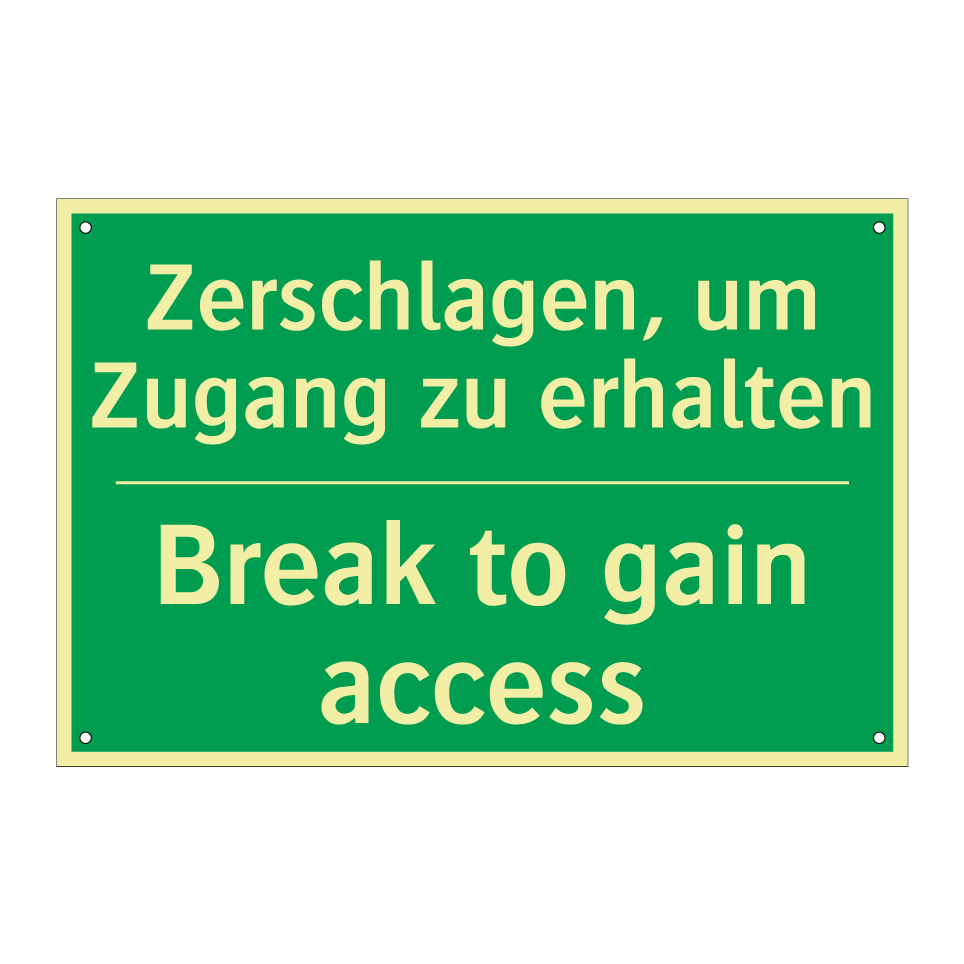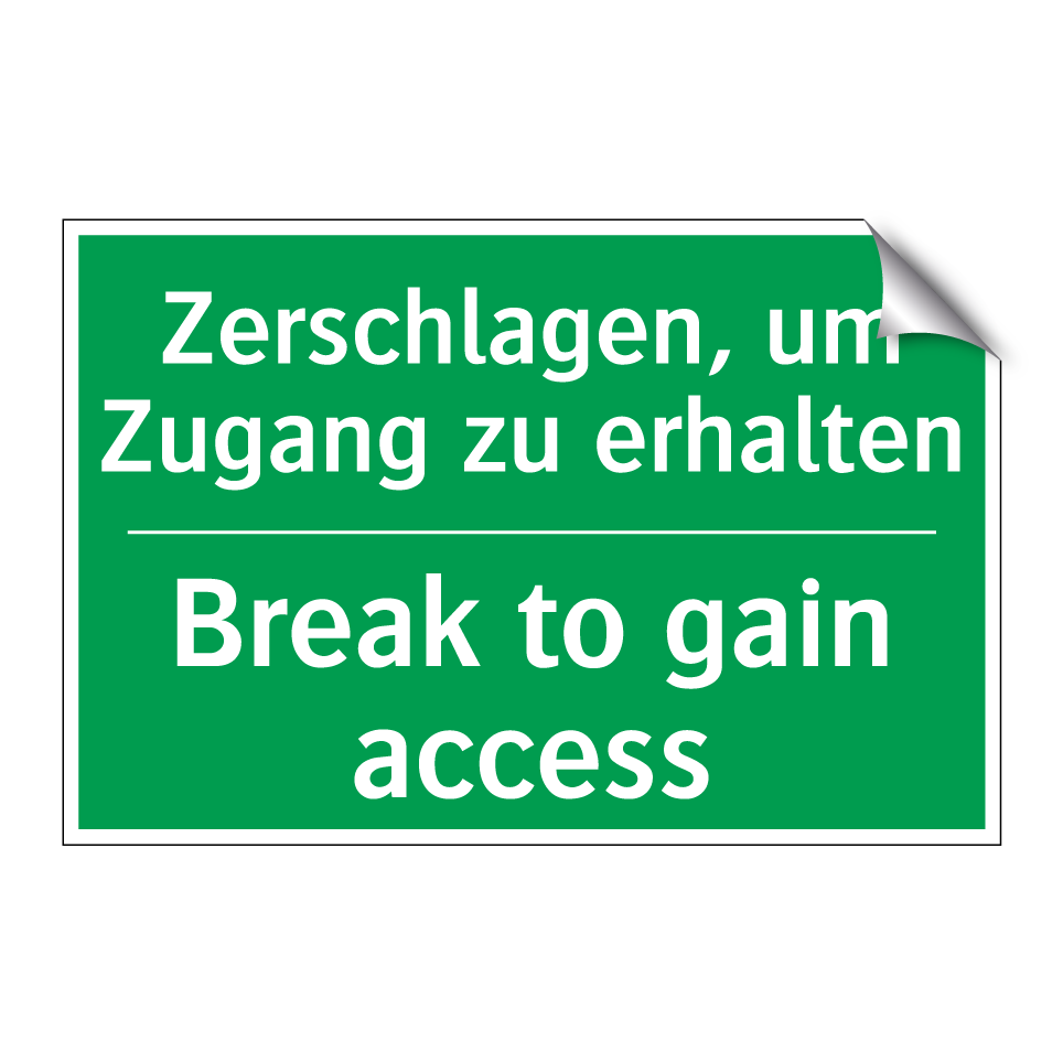 Zweisprachiges Rettungsschild mit deutschem Text Zerschlagen, um Zugang zu erhalten und englischem Text Break to gain access