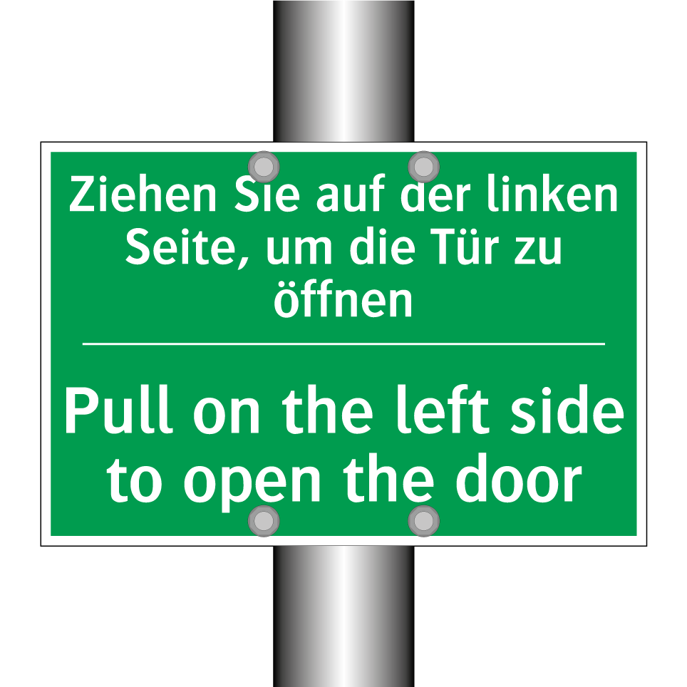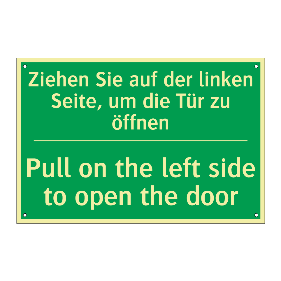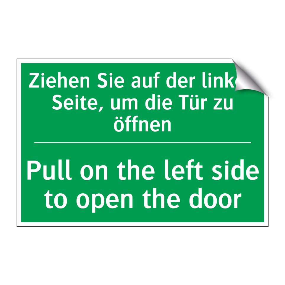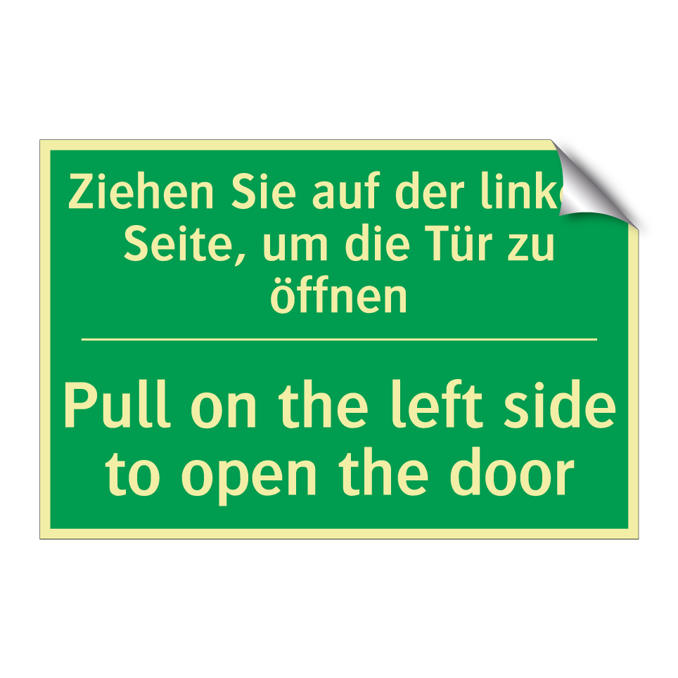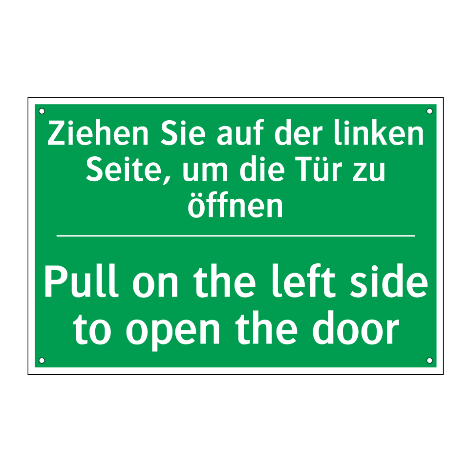 Zweisprachiges Rettungsschild mit deutschem Text Ziehen Sie auf der linken Seite, um die Tür zu öffnen und englischem Text Pull on the left side to open the door