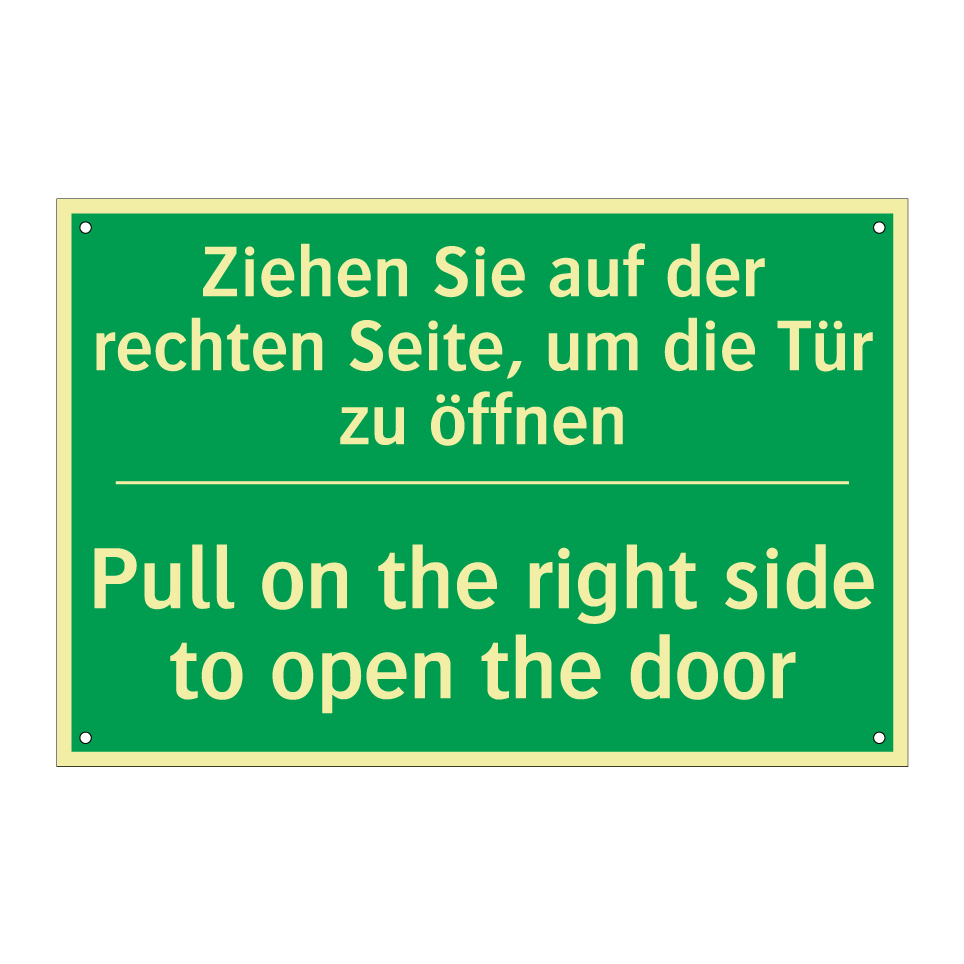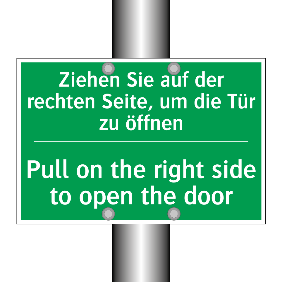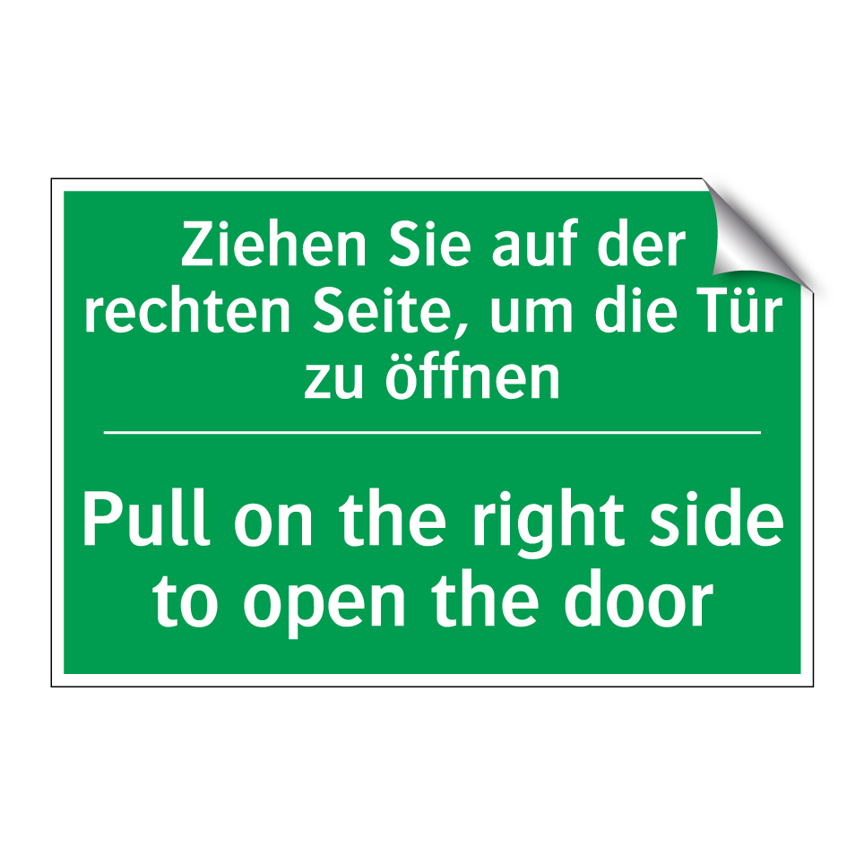 Zweisprachiges Rettungsschild mit deutschem Text Ziehen Sie auf der rechten Seite, um die Tür zu öffnen und englischem Text Pull on the right side to open the door