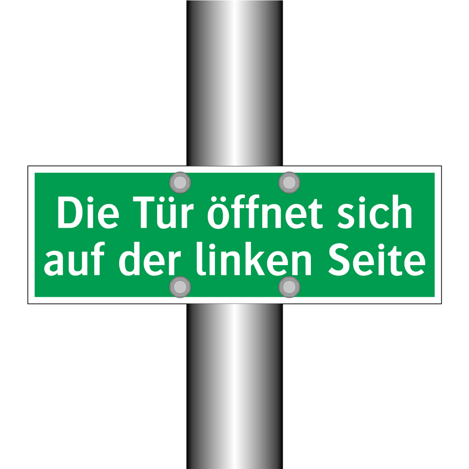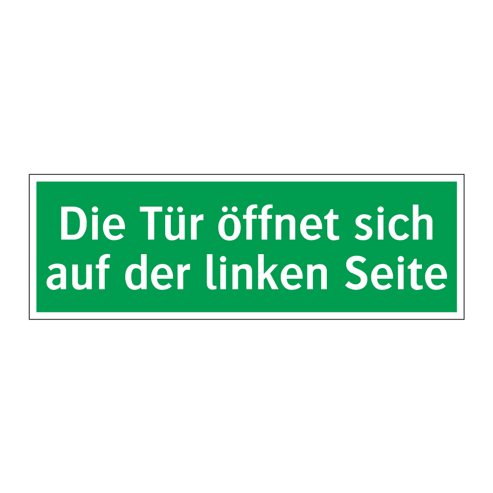 Rettungsschild mit dem Text Die Tür öffnet sich auf der linken Seite