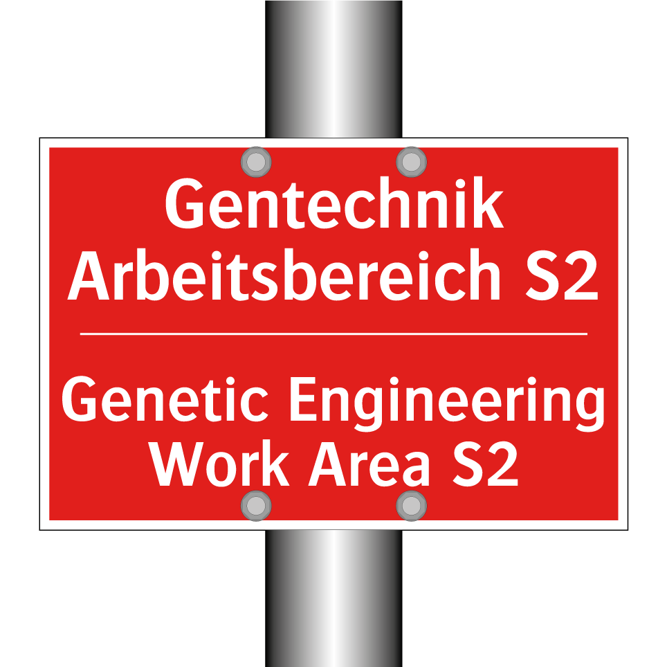 Zweisprachiges Brandschutzschild mit deutschem Text Gentechnik Arbeitsbereich S2 und englischem Text Genetic Engineering Work Area S2