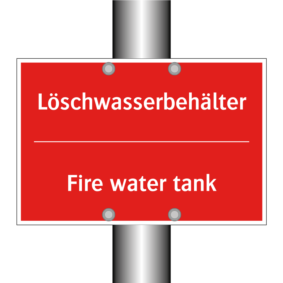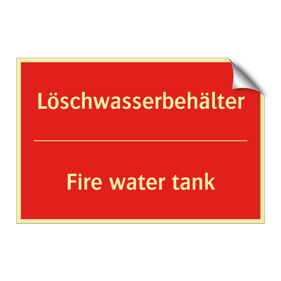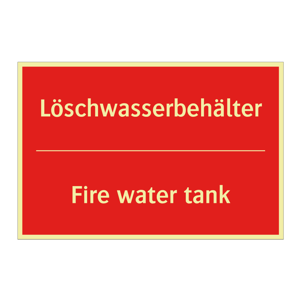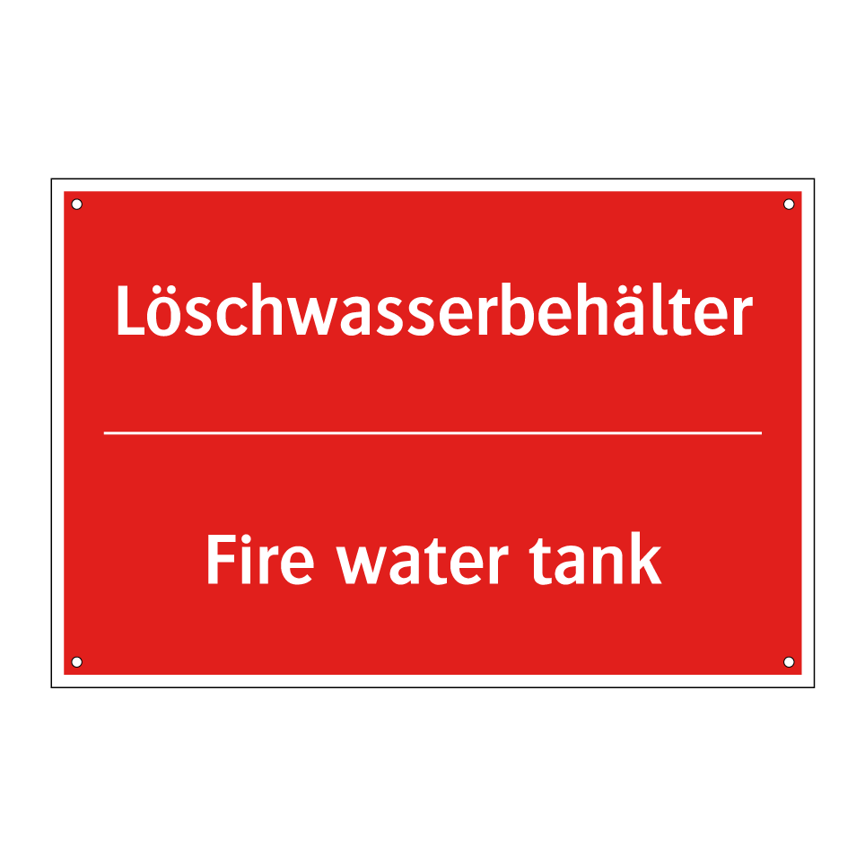 Zweisprachiges Brandschutzschild mit deutschem Text Löschwasserbehälter und englischem Text Fire water tank