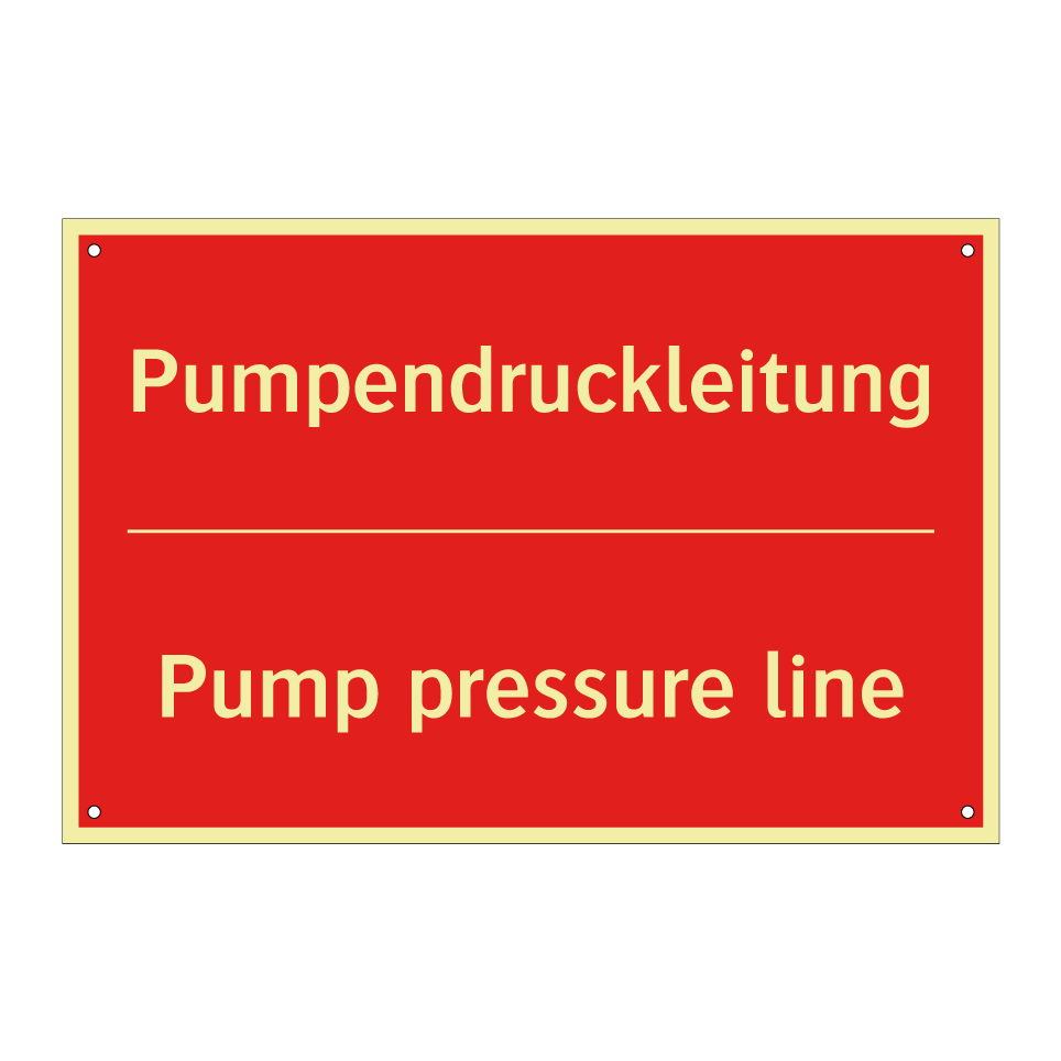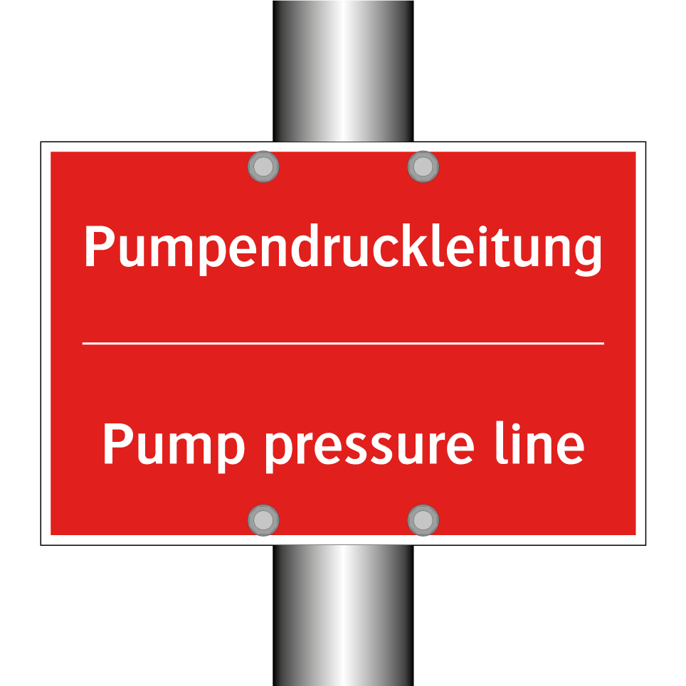 Zweisprachiges Brandschutzschild mit deutschem Text Pumpendruckleitung und englischem Text Pump pressure line