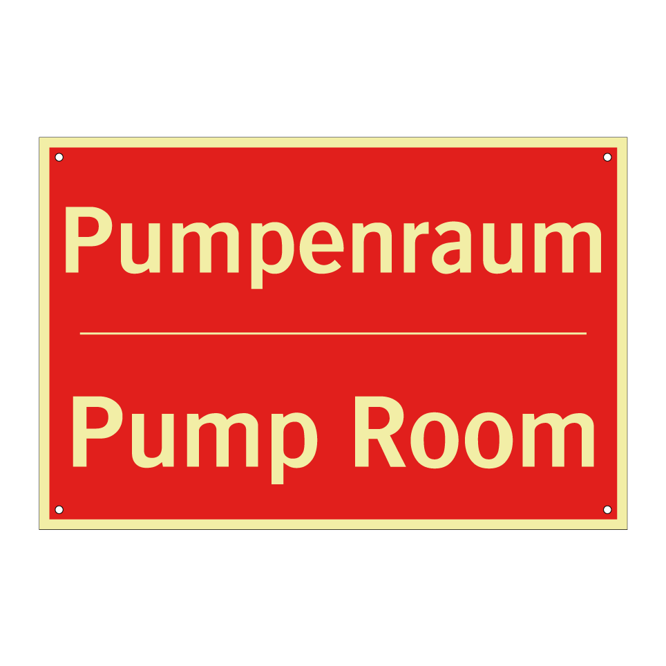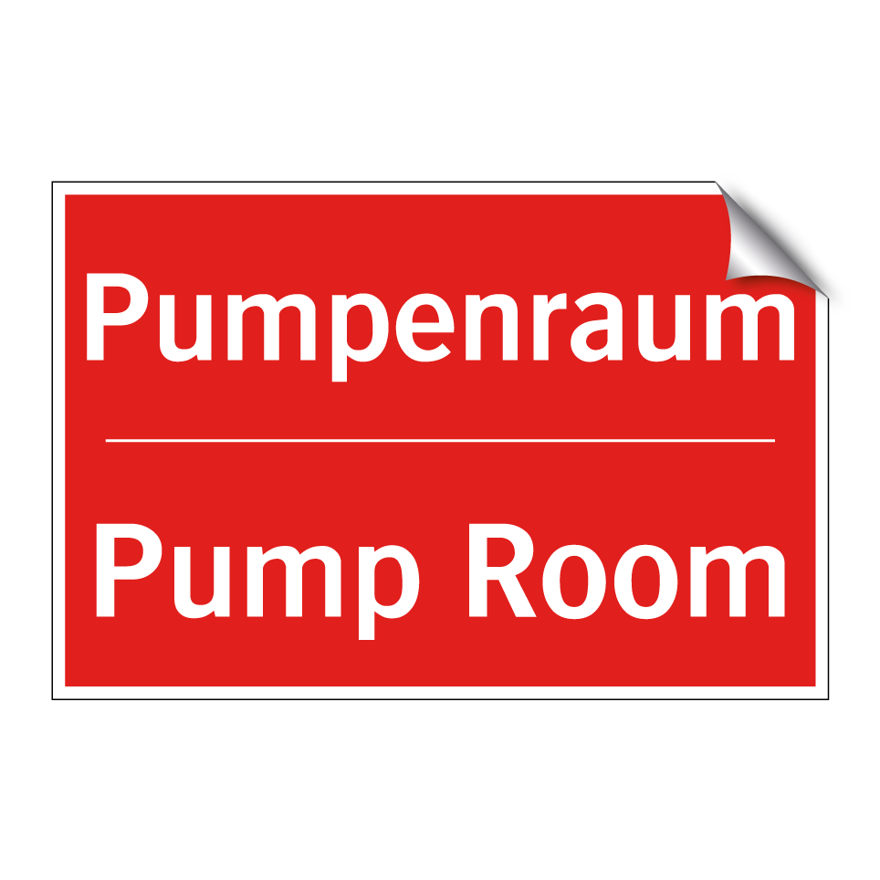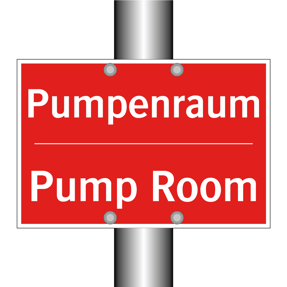 Zweisprachiges Brandschutzschild mit deutschem Text Pumpenraum und englischem Text Pump Room