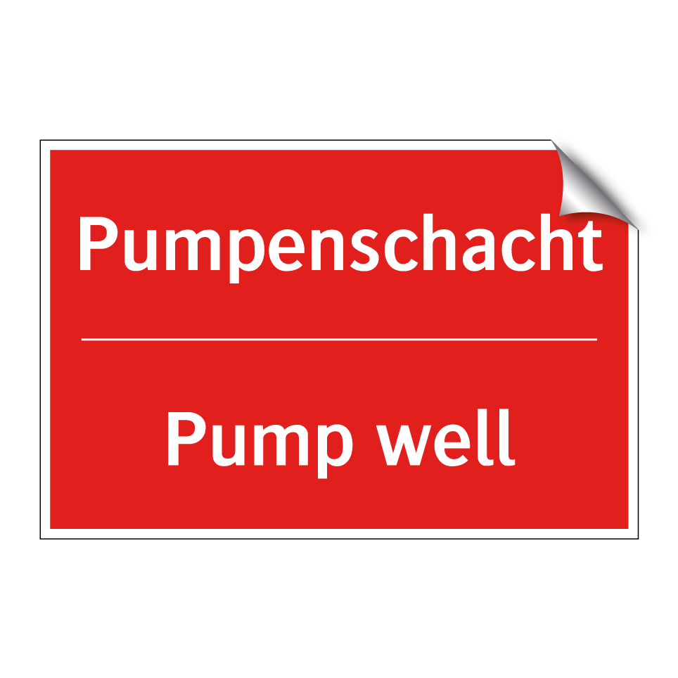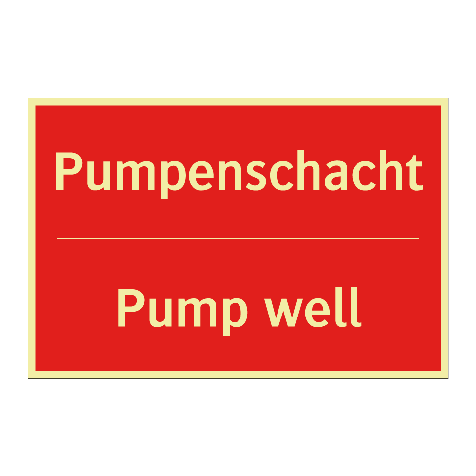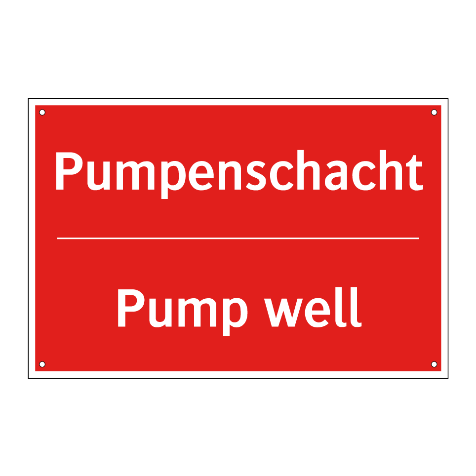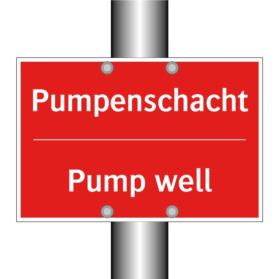 Zweisprachiges Brandschutzschild mit deutschem Text Pumpenschacht und englischem Text Pump well