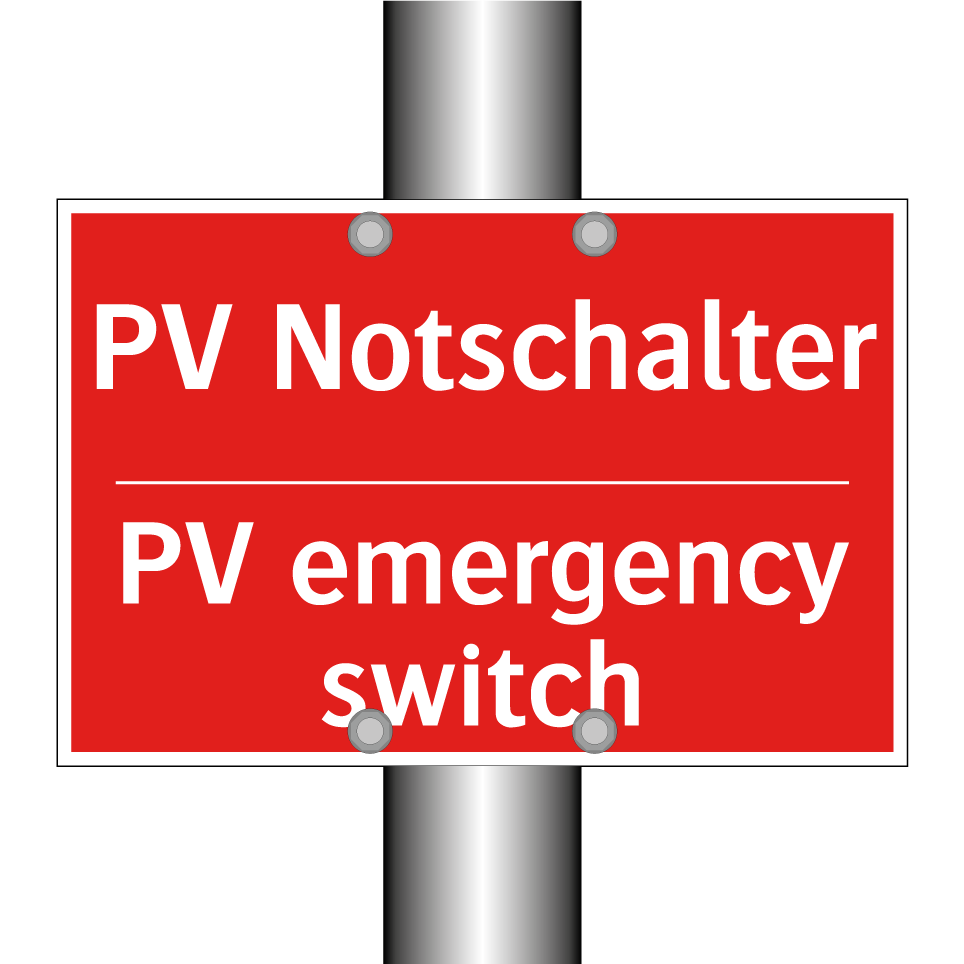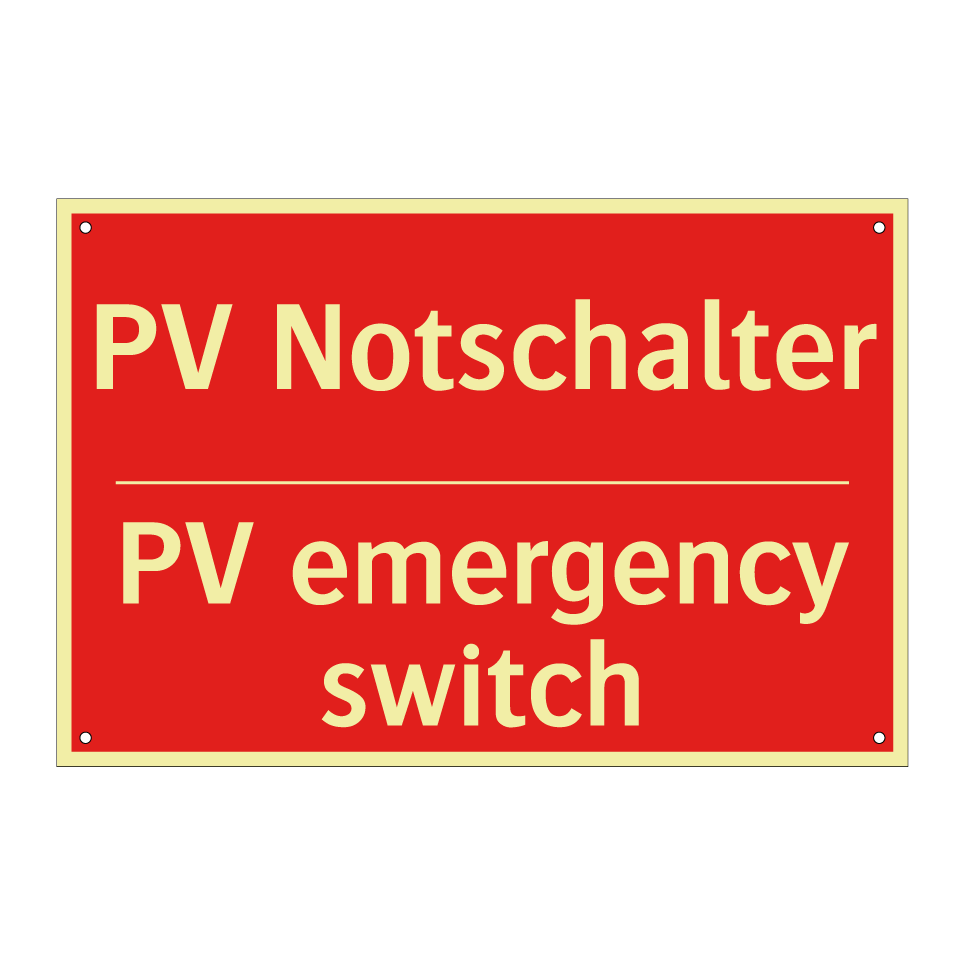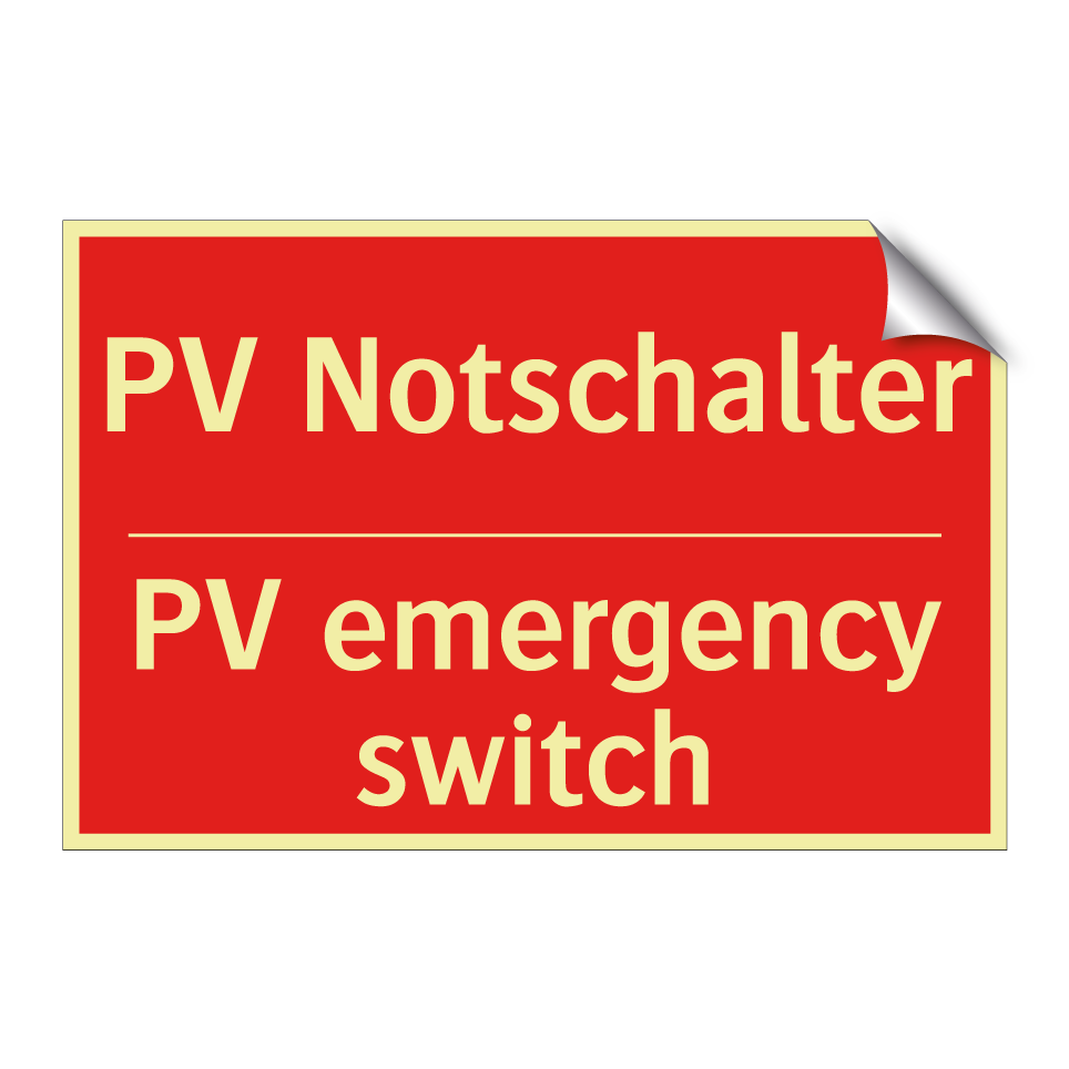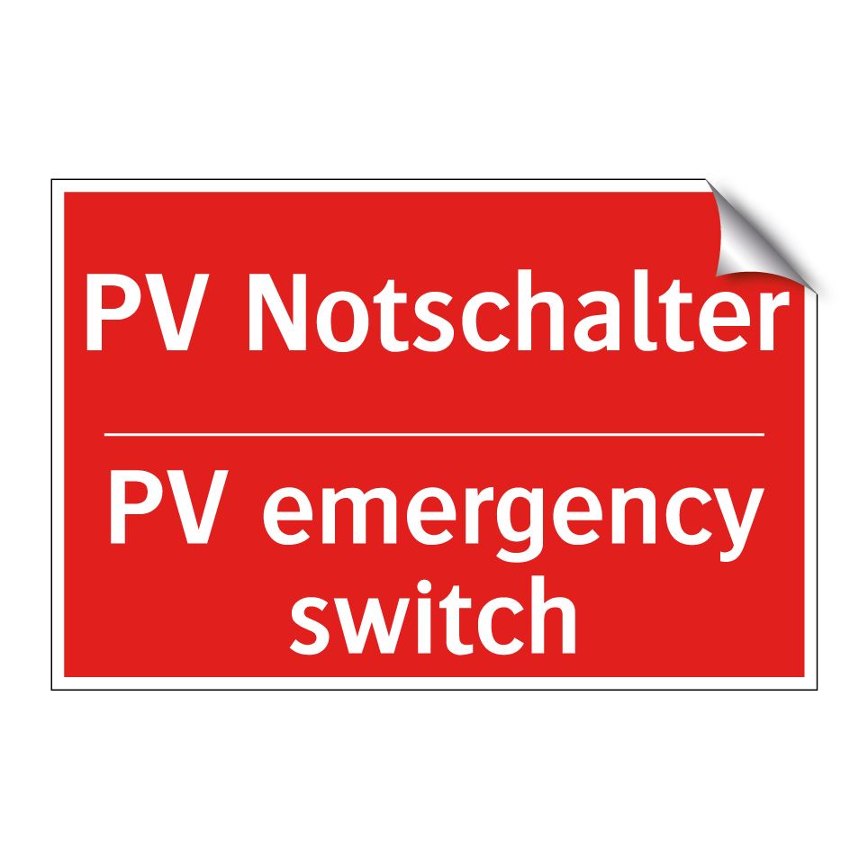 Zweisprachiges Brandschutzschild mit deutschem Text PV Notschalter und englischem Text PV emergency switch