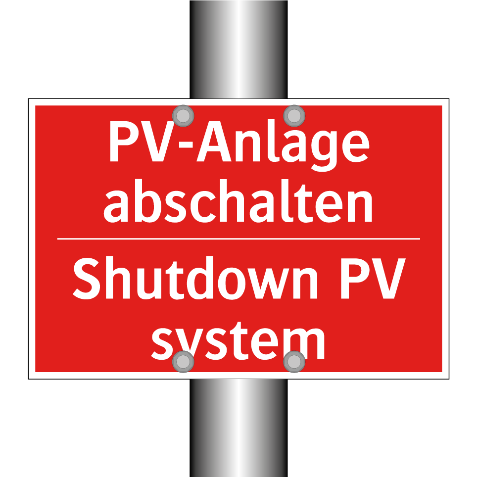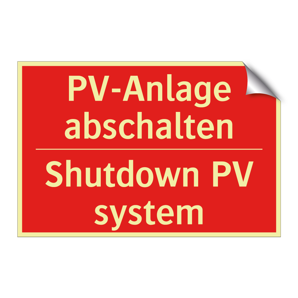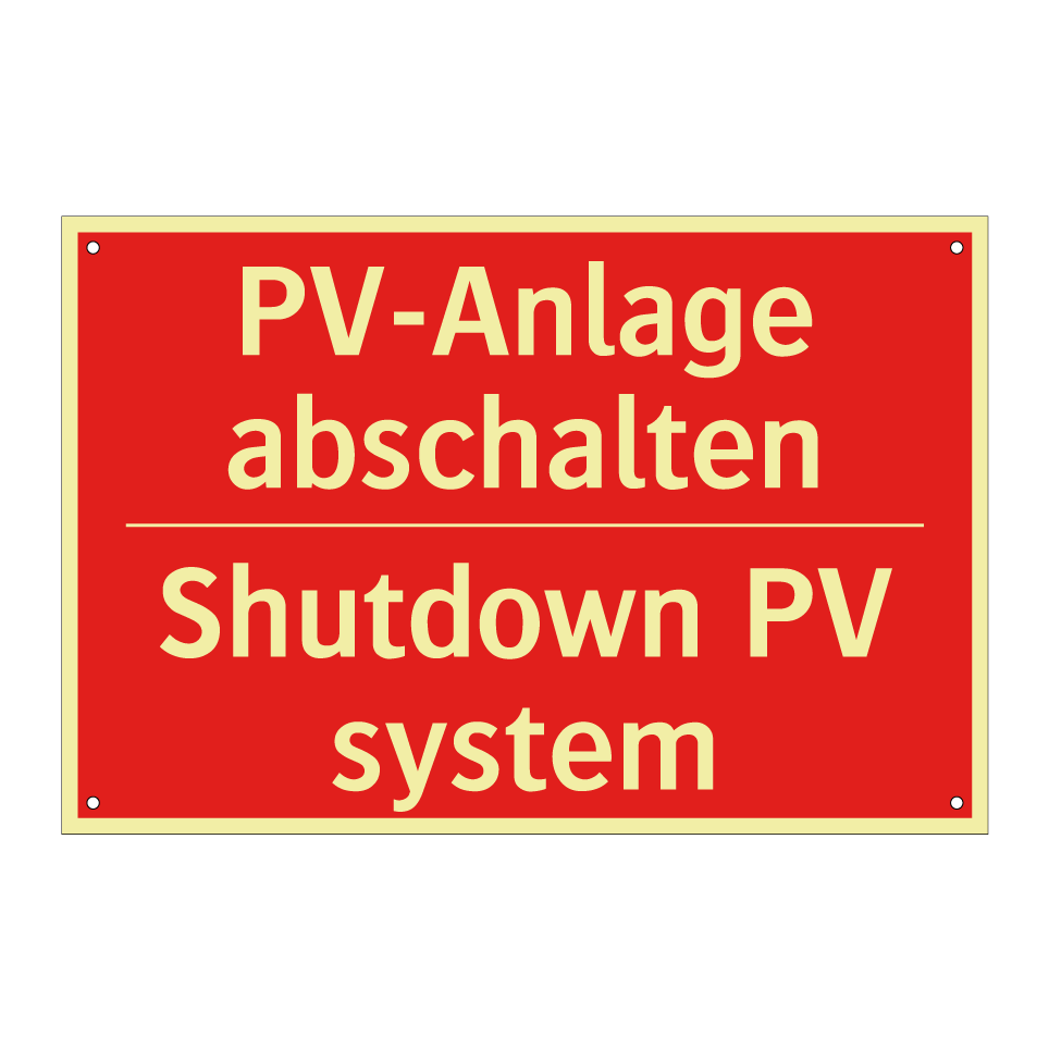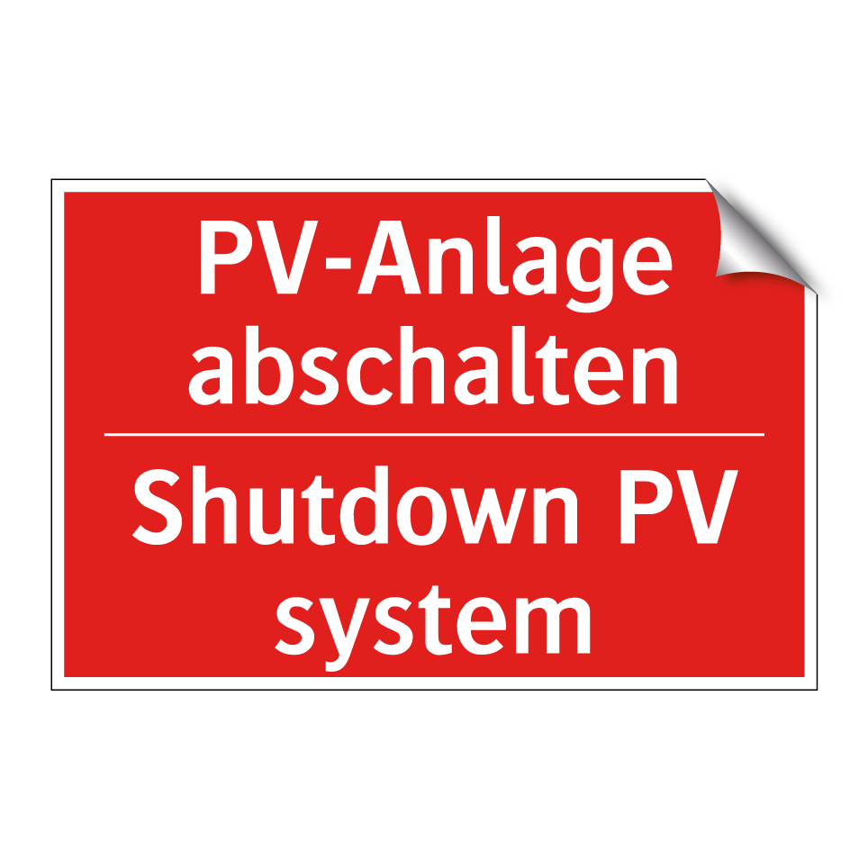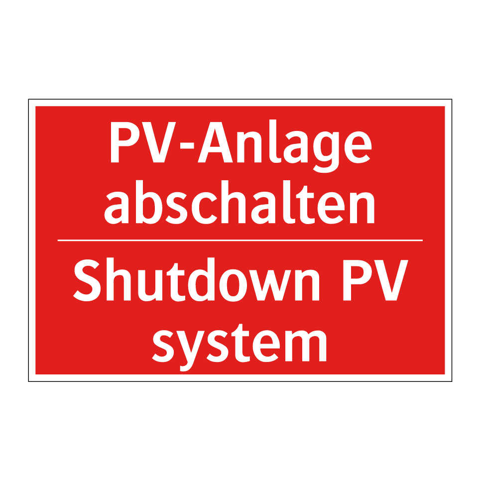 Zweisprachiges Brandschutzschild mit deutschem Text PV-Anlage abschalten und englischem Text Shutdown PV system