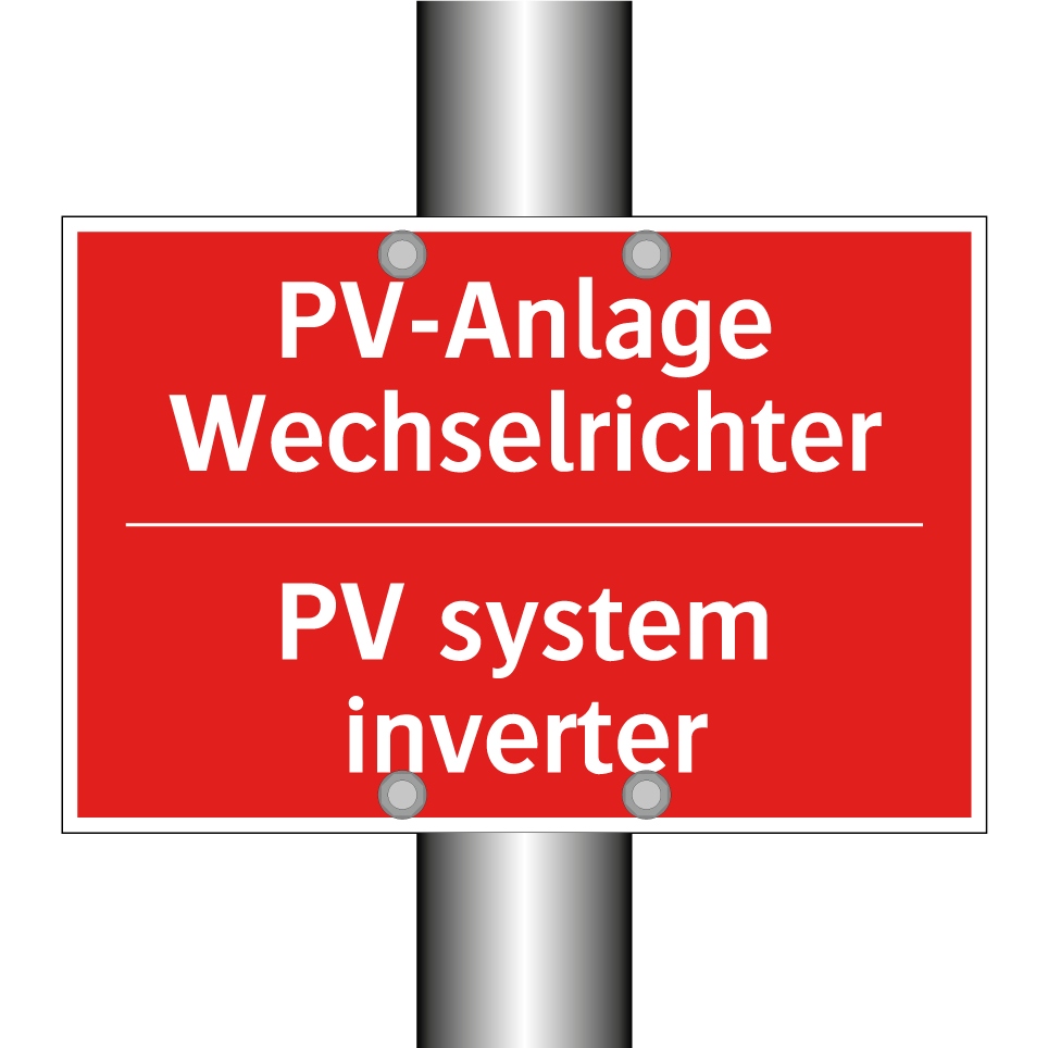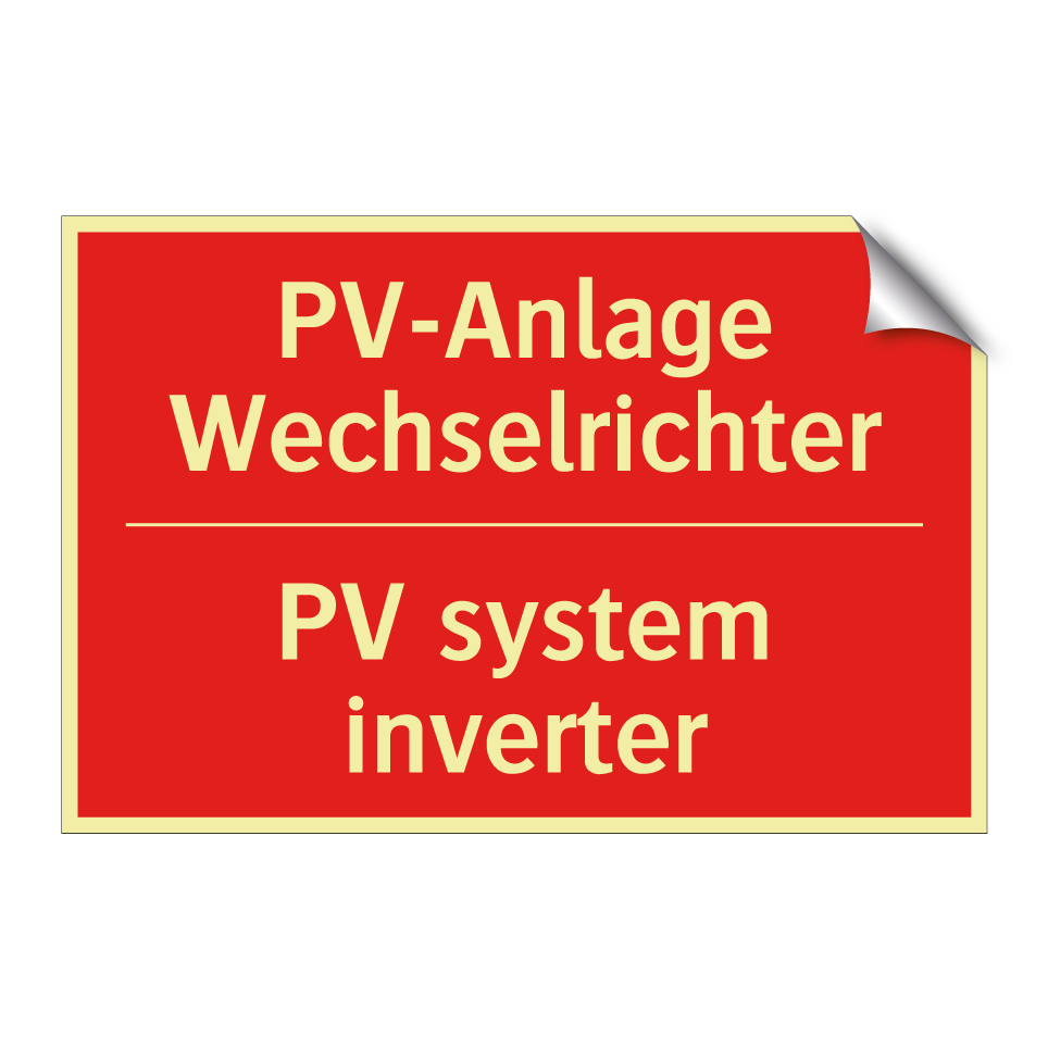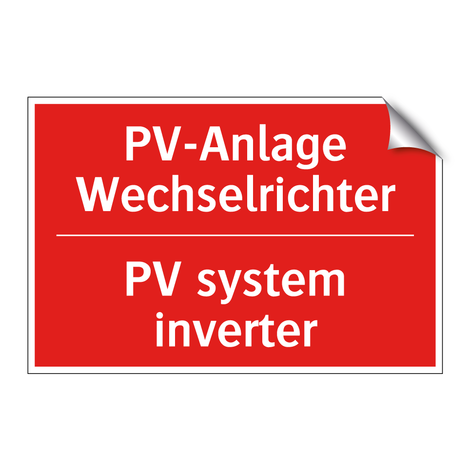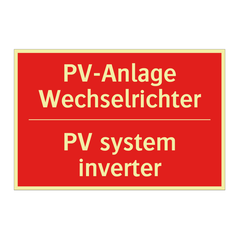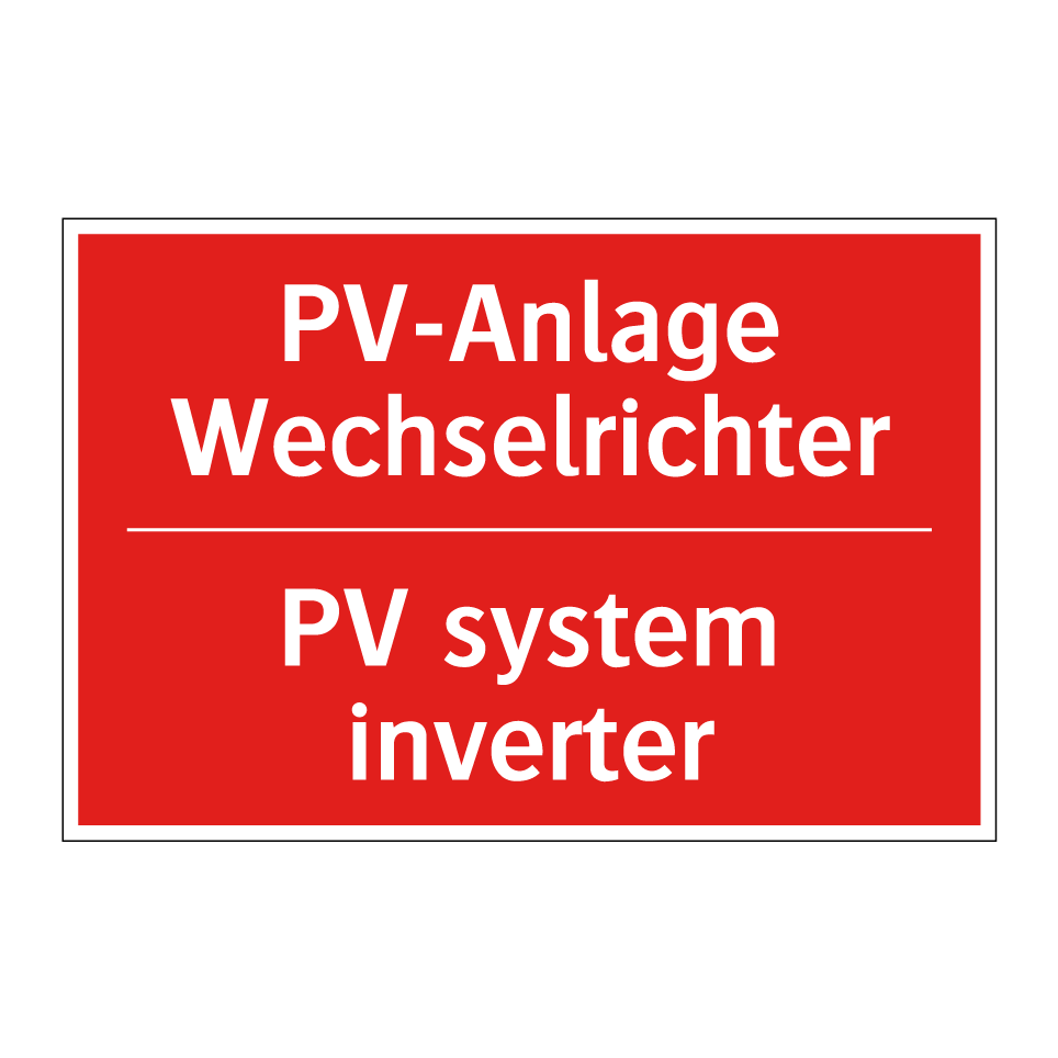 Zweisprachiges Brandschutzschild mit deutschem Text PV-Anlage Wechselrichter und englischem Text PV system inverter