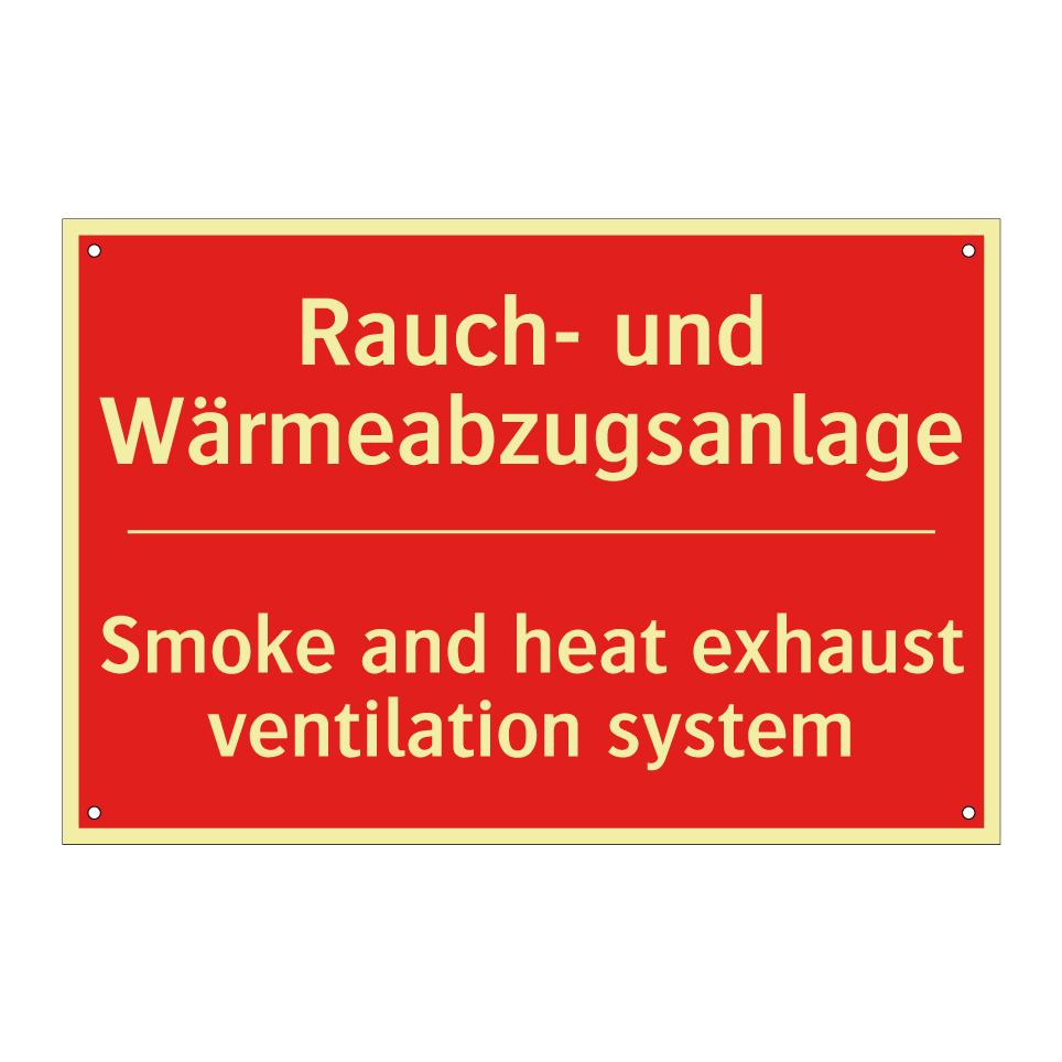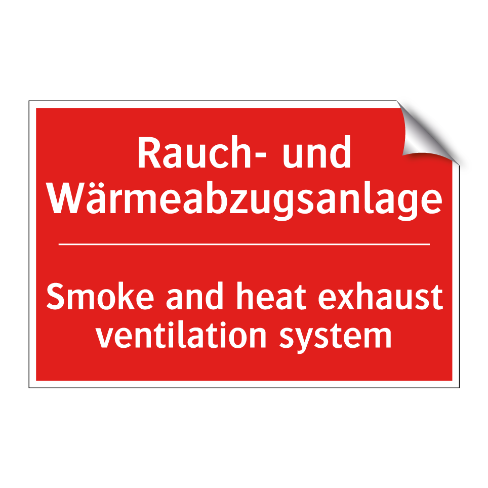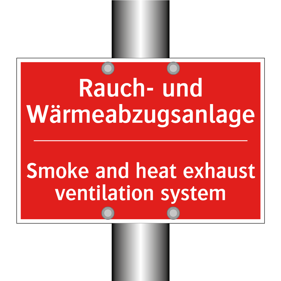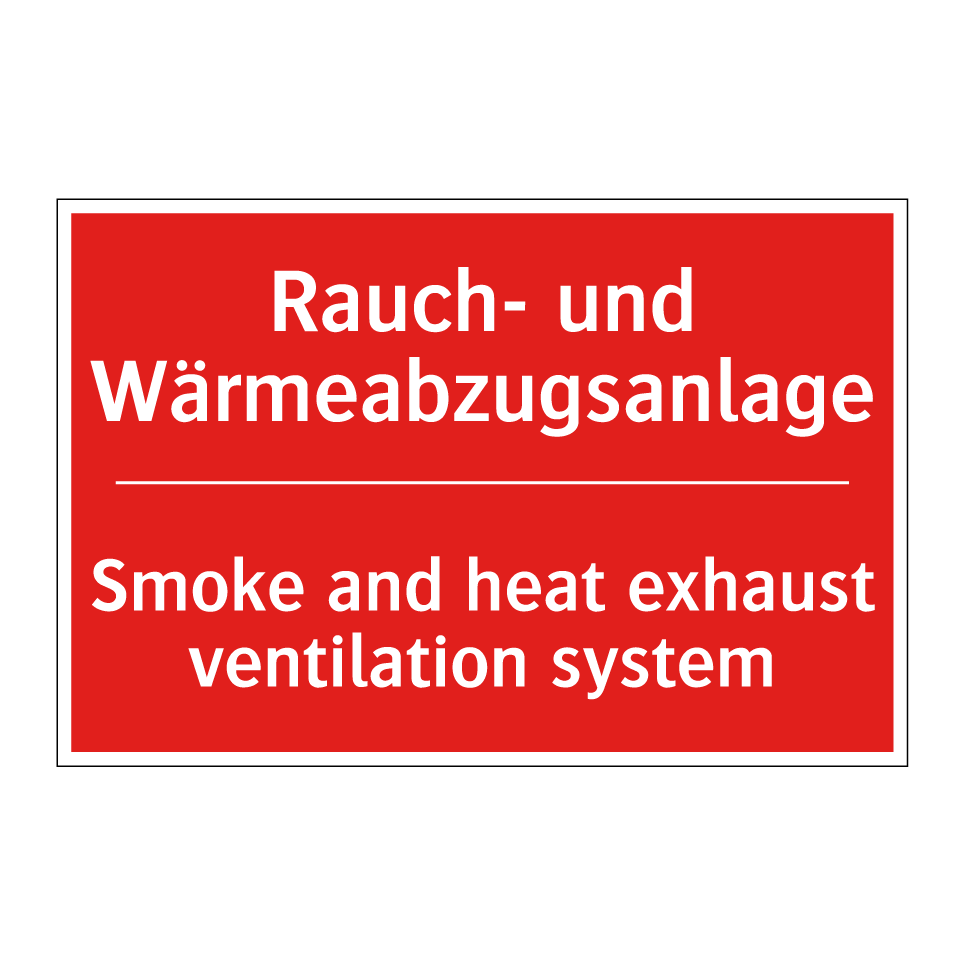 Zweisprachiges Brandschutzschild mit deutschem Text Rauch- und Wärmeabzugsanlage und englischem Text Smoke and heat exhaust ventilation system